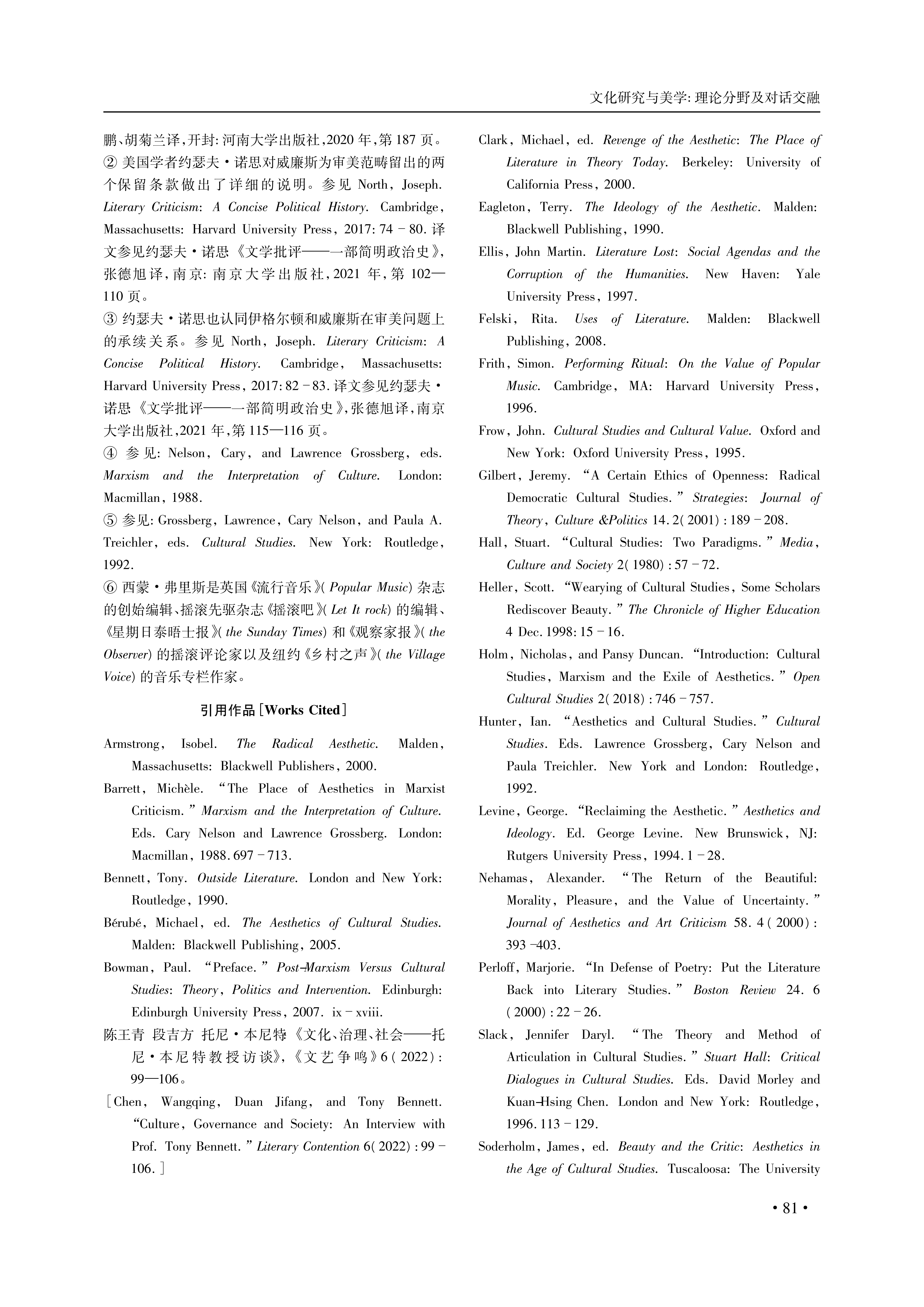 摘 要: 从 20 世纪后半叶开始,文化研究与美学的关系渐行渐远。到 20 世纪末 21 世纪初,文化研究几乎成了反美学的代名词。进入 21 世纪以来,在“回归美学”的浪潮下,英、美、澳学者对文化研究与美学是否走向分离、如何走向融合等问题进行了深入探讨。文化研究与美学并不是非此即彼的对立关系,也不是彼此包含的从属关系,而应该是一种借鉴交融的对话关系,其未来方向可以概括为“走向审美的文化研究”命题。这个理论命题具体展开包含如下四个方面: 重新定义美学,关注文化产品的形式特征,重视审美经验的中介性,分析审美评价机制。