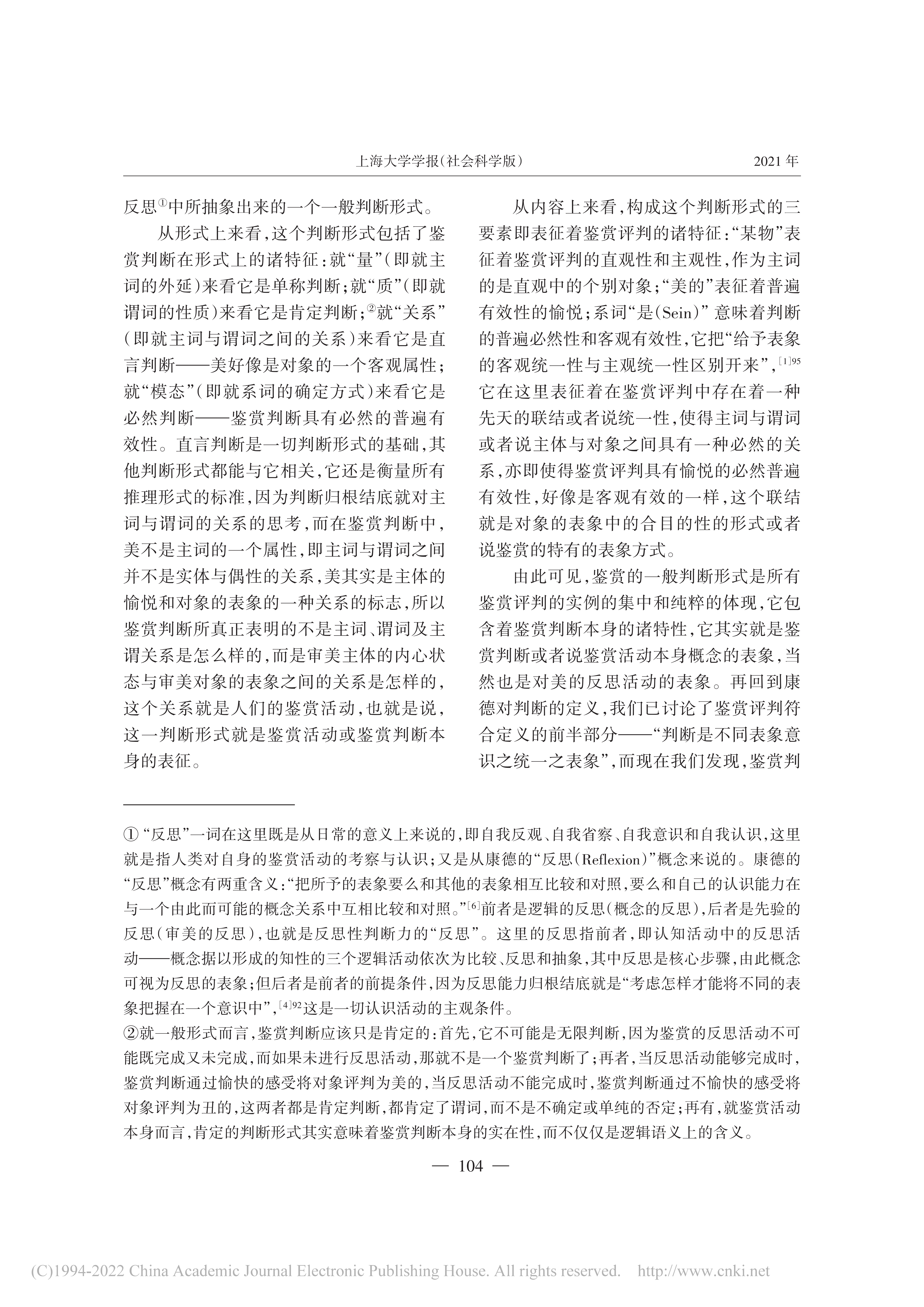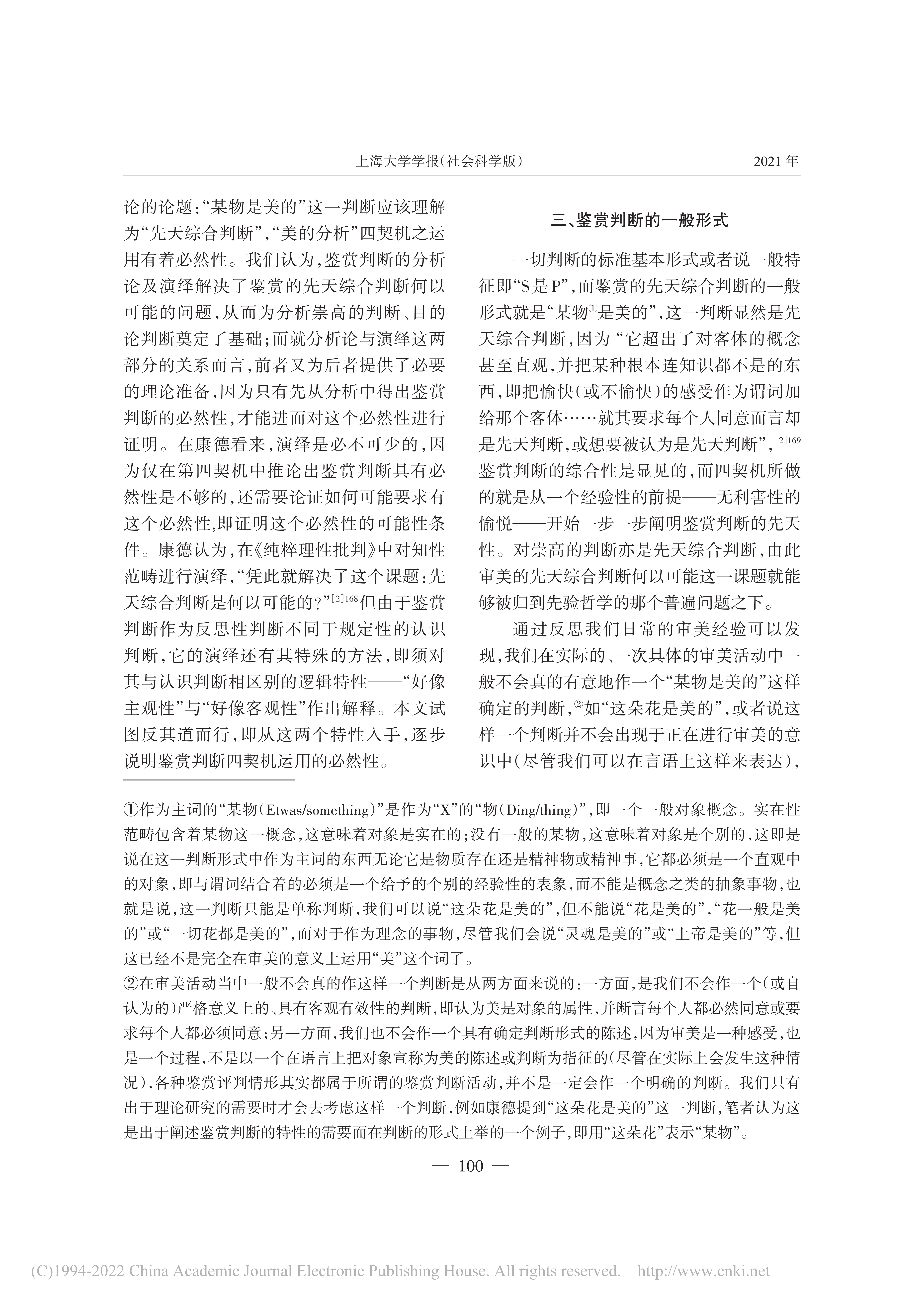 摘要:鉴赏判断的一般形式是“某物是美的”,这是一个先天综合判断,康德鉴赏判断的分析论及演绎就是立足于这一判断。康德为何以及是否有必要运用四契机对鉴赏判断进行分析是一个有争议的问题,“第一批判”可以提供某种启示,但鉴赏判断毕竟不同于逻辑的规定性判断,无论是从现实经验的角度,还是从严格的逻辑学的角度,都不适合把它只视为一个在语言上(无论说出与否)发生的判断,从而对它进行单纯语形或语义上的分析;而且鉴赏判断所真正评判和断言的也不是把某物宣称为美的。它是从鉴赏活动本身的反思中所抽象出来的一个一般判断形式,是这一反思的表象,亦是鉴赏判断本身的概念的表象,因为构成这一判断形式的各要素即表征着鉴赏评判的各方面特征,而四契机所阐明的是鉴赏判断本身的特性。鉴赏判断的四契机就是以鉴赏活动本身为认知对象进而对它的概念进行分析,由此可见四契机运用的必然性。