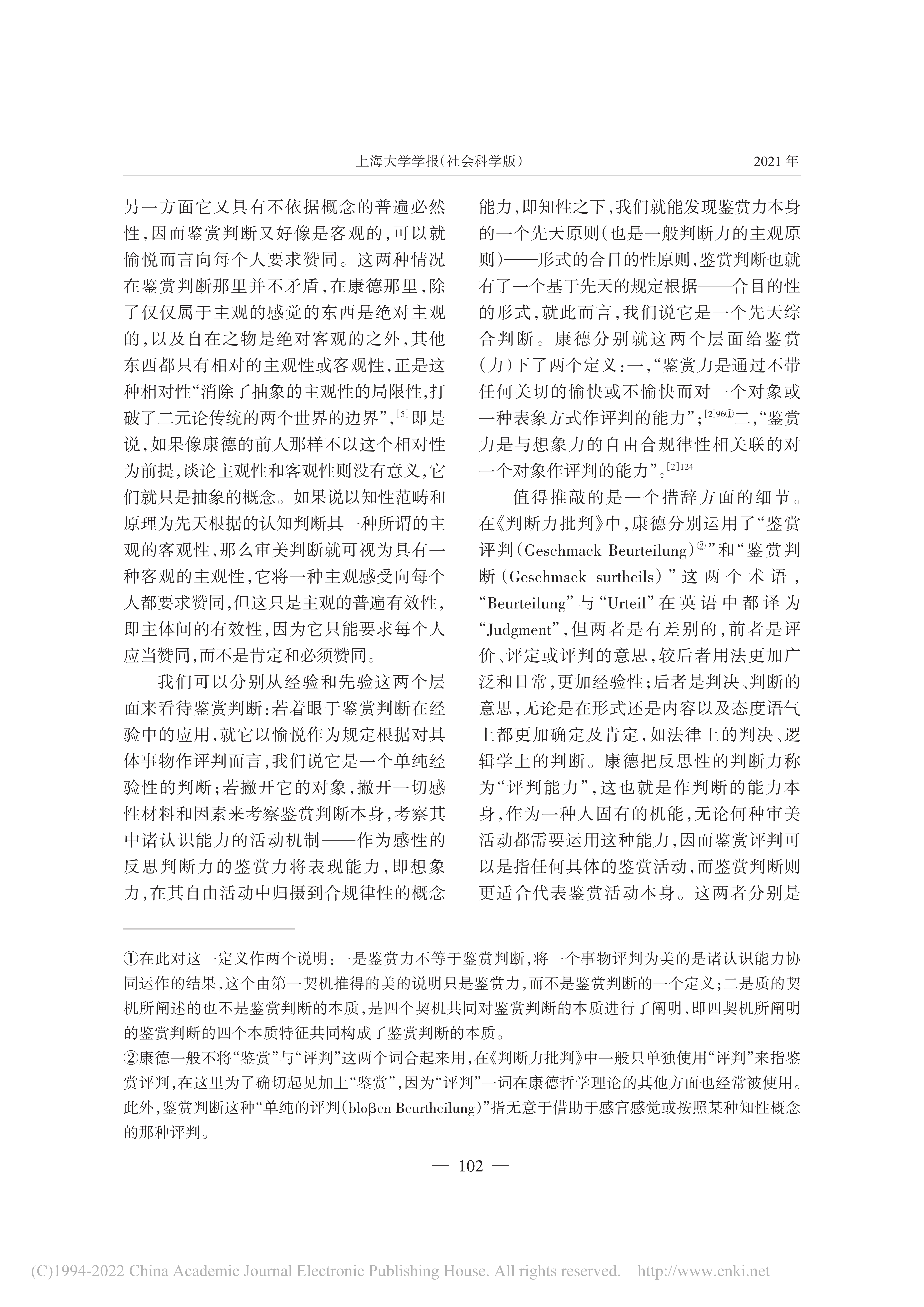 关键词:先天综合判断;好像主观性;好像客观性;鉴赏评判;鉴赏判断;