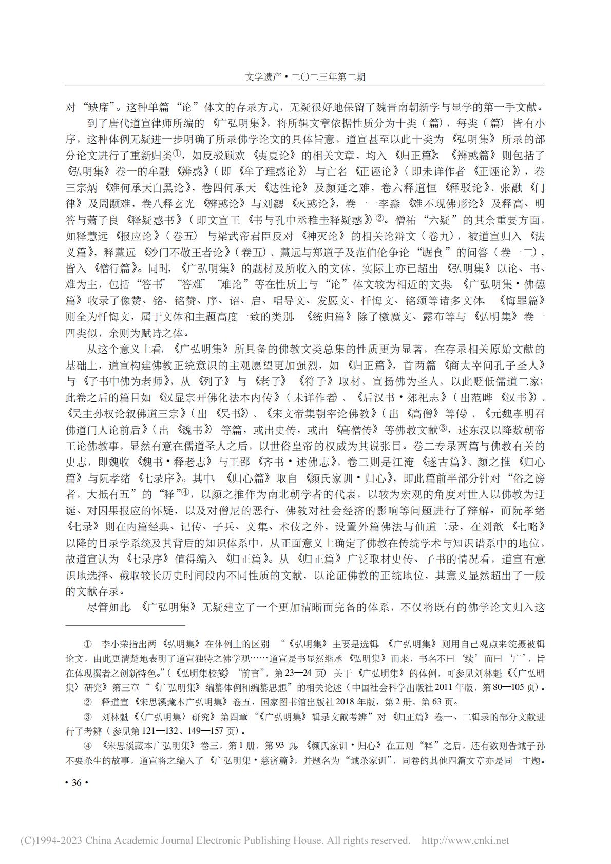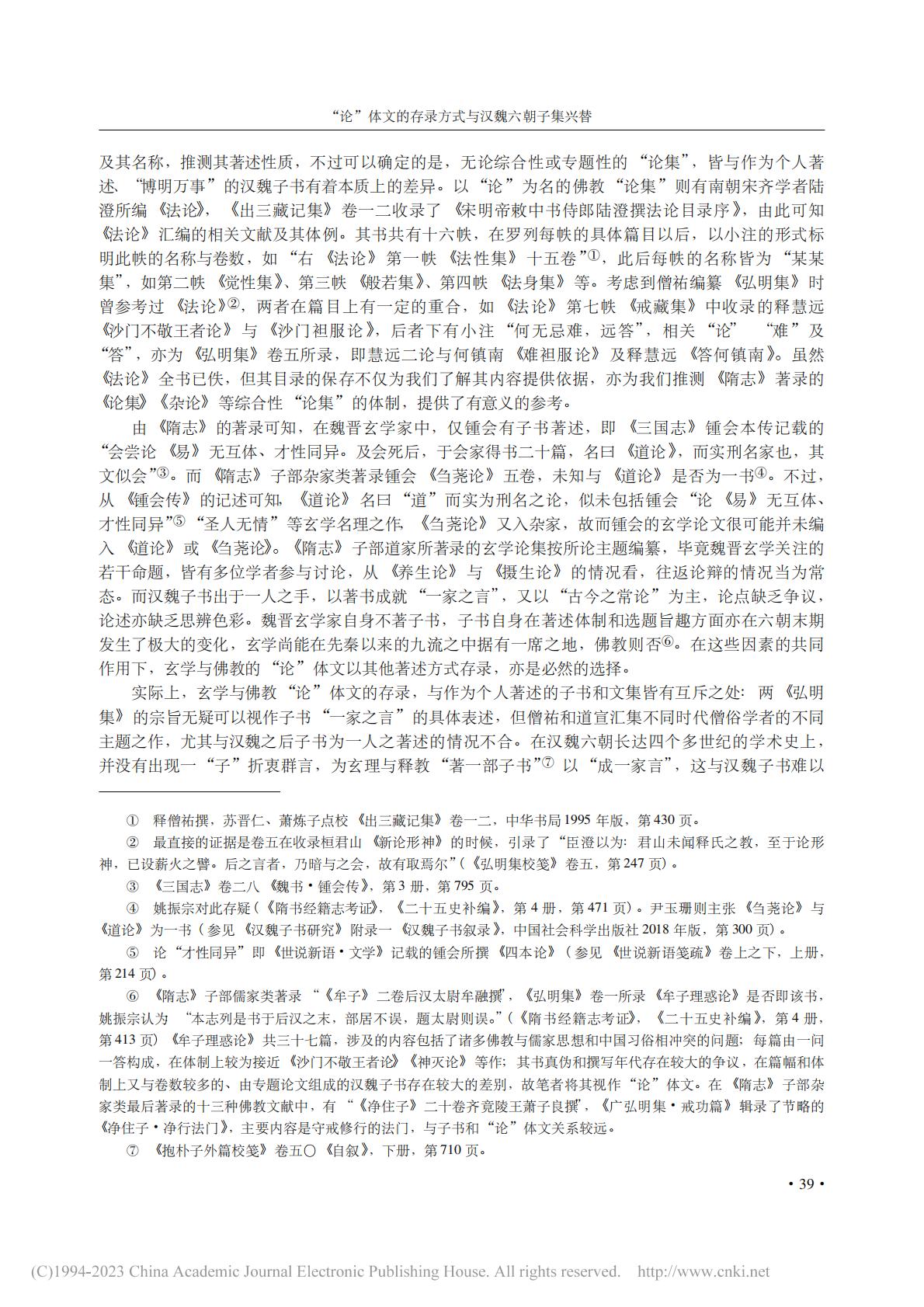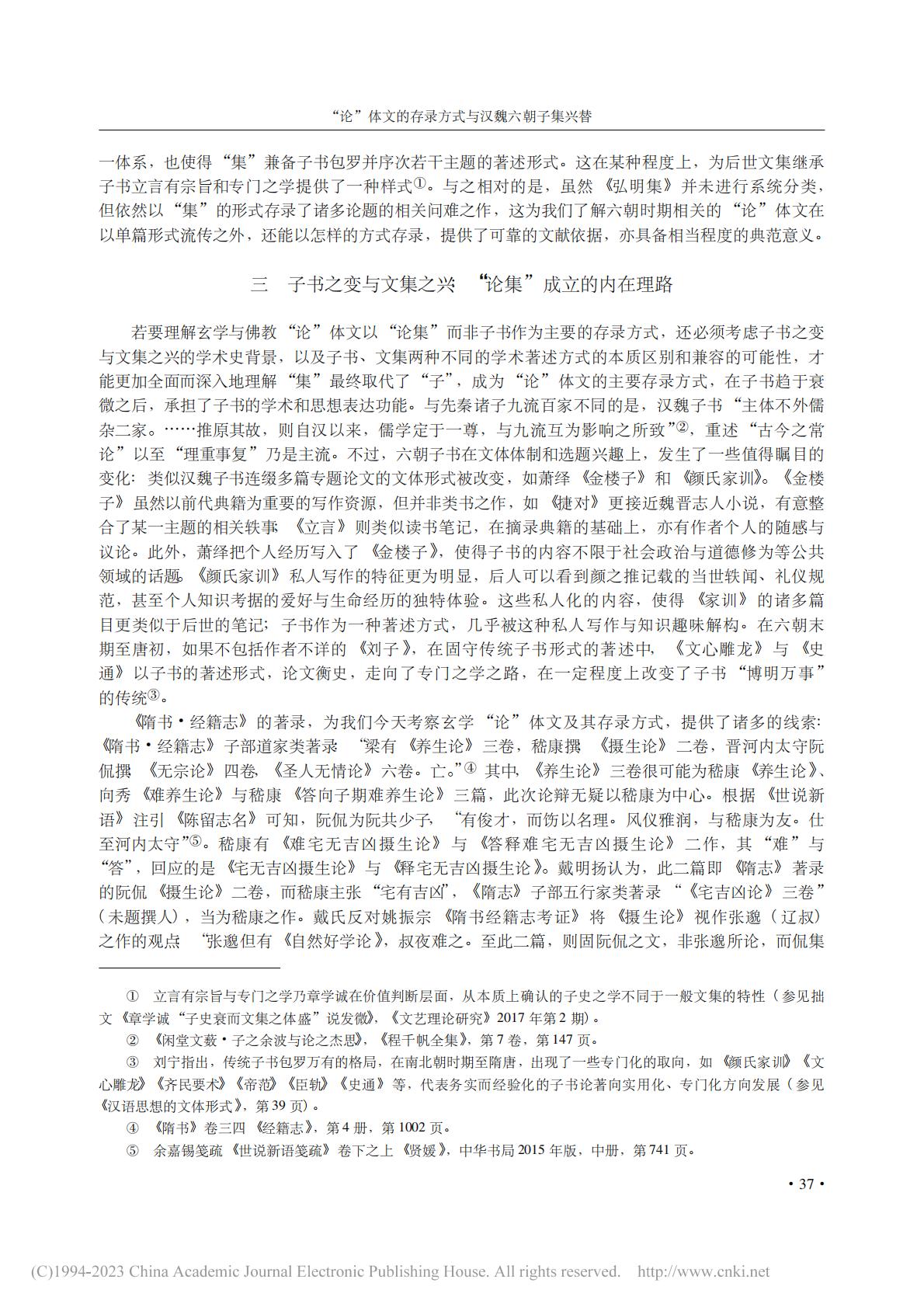 摘要:汉魏子书多以“论”为名,在学术史上,“论”体文与子书存在源流关系,在说理的性质与写作方式上亦有相通之处;诸多子书作者以著述本身为目的,并不追求思想内容上的别具一格。与之不同的是,魏晋玄学与佛教所关注的诸多命题,具有较强的思辨色彩,所著“论”体文与子书在学术宗旨和著述体制上格格不入,在学术史上亦未出现专门探讨玄学或佛教的子书。由今存的佛教文献《弘明集》与《广弘明集》汇编同一主题相关文章的体例可知,“论集”按主题分类并序次成“集”。“论集”取代子书成为“论”体文主要的存录方式,是中古时代子集兴替这一学术史历程的一部分;“集”作为学术著述方式,亦得以具备专门之学与“一家之言”的特质。