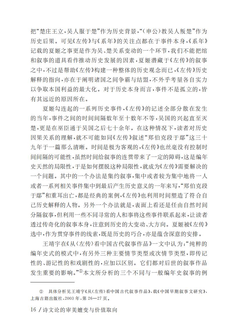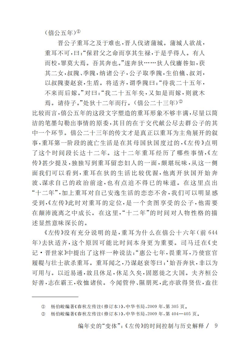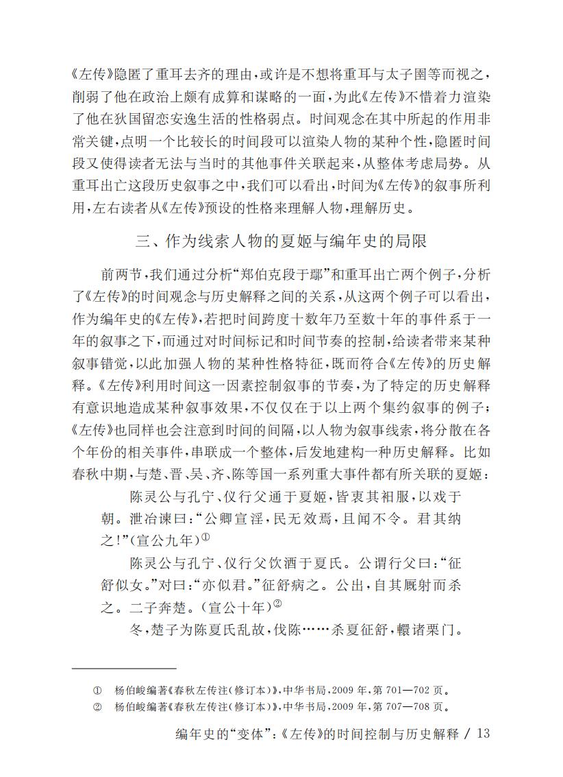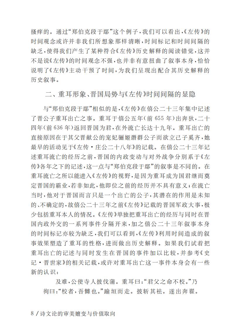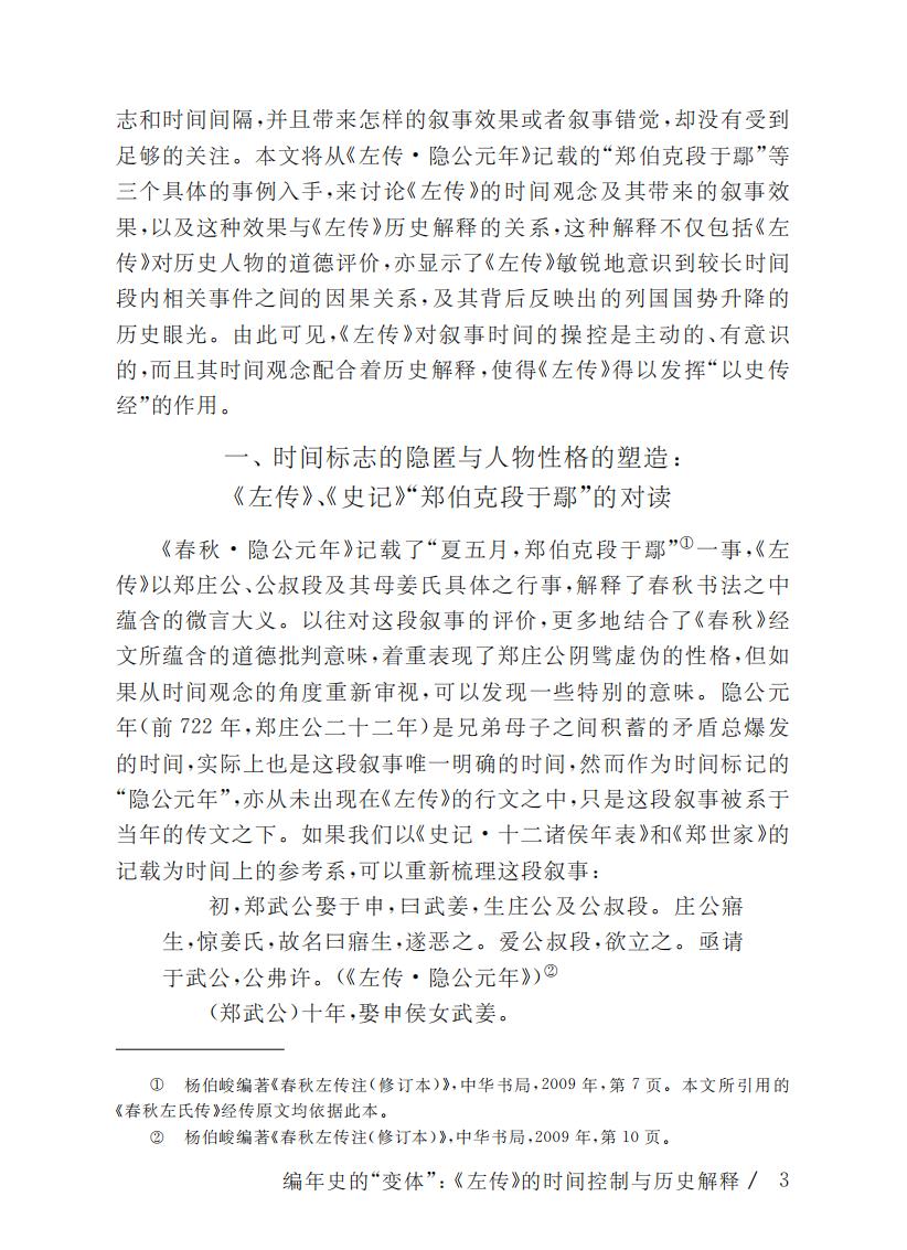 摘要:本文通过分析《左传》的"郑伯克段于鄢"(隐公元年)、重耳出亡(僖公二十三年)和夏姬相关的史实等三例不同于一般编年史写法的叙事,来阐述《左传》的时间观念对历史解释的影响。不管《左传》利用时间因素塑造人物,还是利用人物串联被自然时间分隔的叙事,都是调整编年体史书依照时间顺序安排历史事件的基本做法,其旨归在于"以史传经"的需要,即将自己的态度寓于历史叙事本身之中。