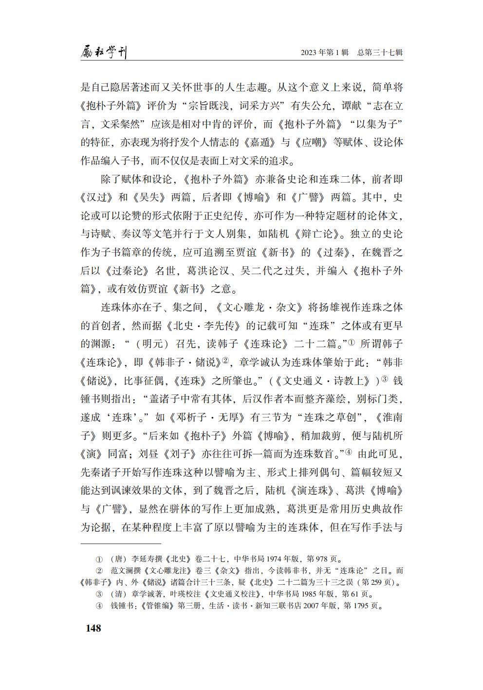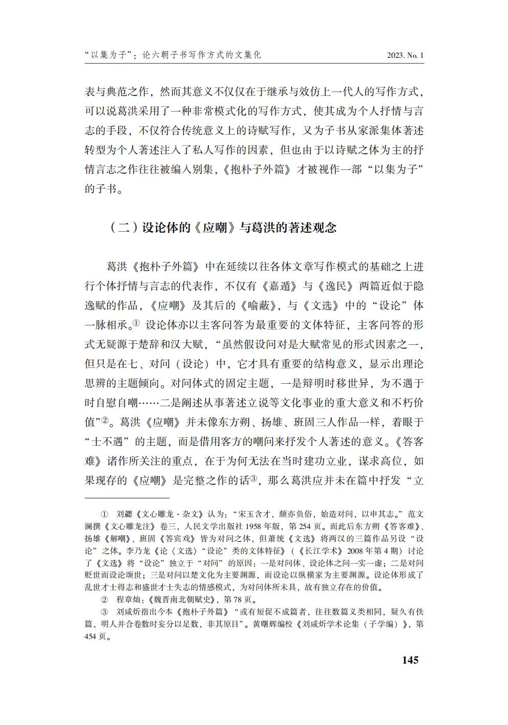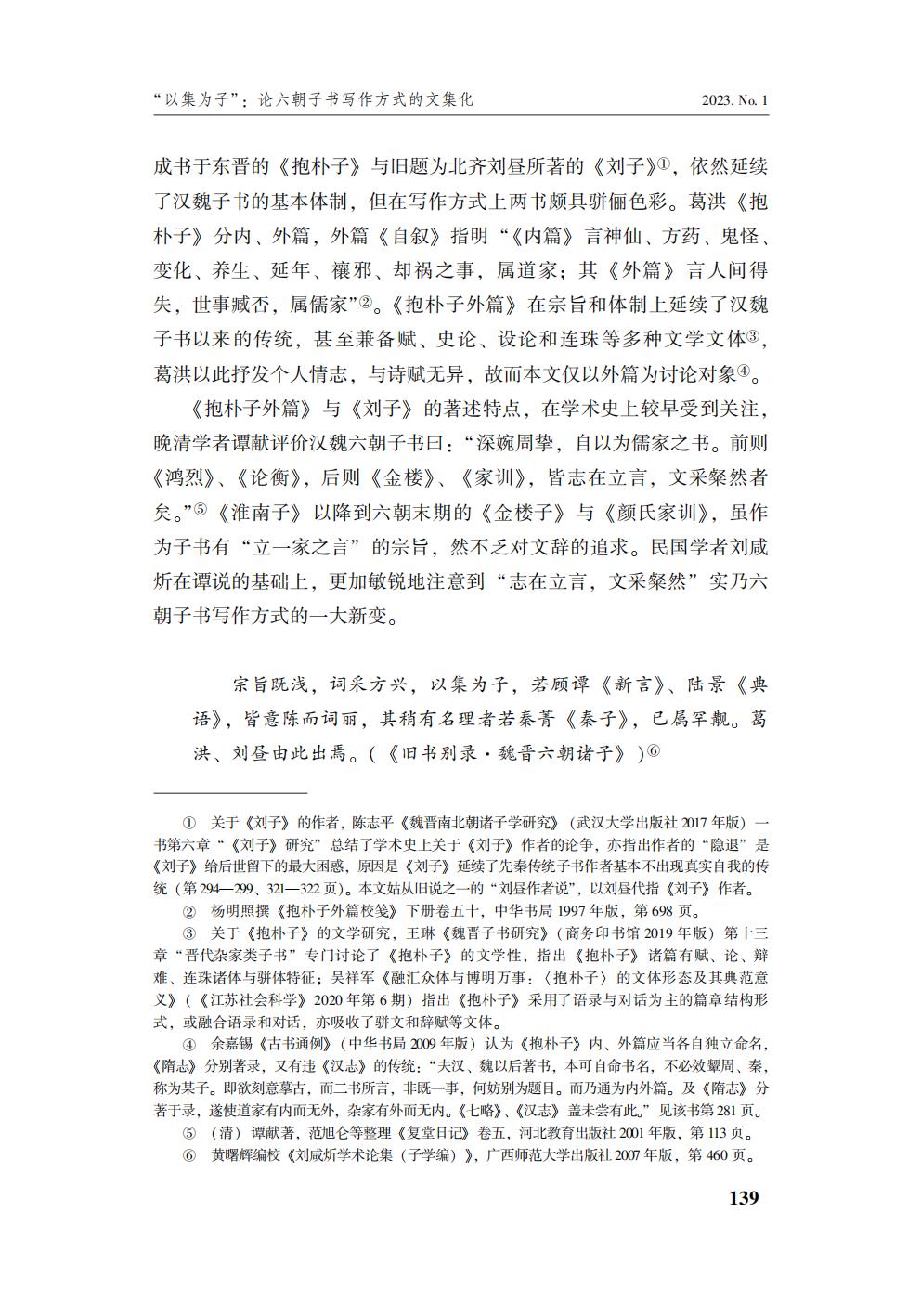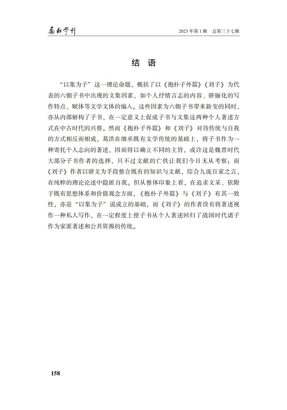 摘要:“以集为子”说是刘咸炘提出的命题,借以指以《抱朴子》《刘子》为代表的六朝子书重辞藻而轻宗旨的写作方式。葛洪《抱朴子外篇》的篇目,有赋、设论、史论和连珠等各种文学文体,在继承前代写作模式的基础上,葛洪亦在其中表现了个体的人生选择与著述理想;《刘子》的作者则隐匿了自我,重新整合九流百家的思想,所论事理多因袭前人,而骈文的写作形成了更加理论化与辞章化的学术文本。整体而言,无论魏晋士人的著述观念,还是史志目录的分类,都表明子书与文集是两种不同性质的学术著述,然而文集的因素影响着子书的写作,客观上推动了中古时代子书与文集兴替的历史进程。