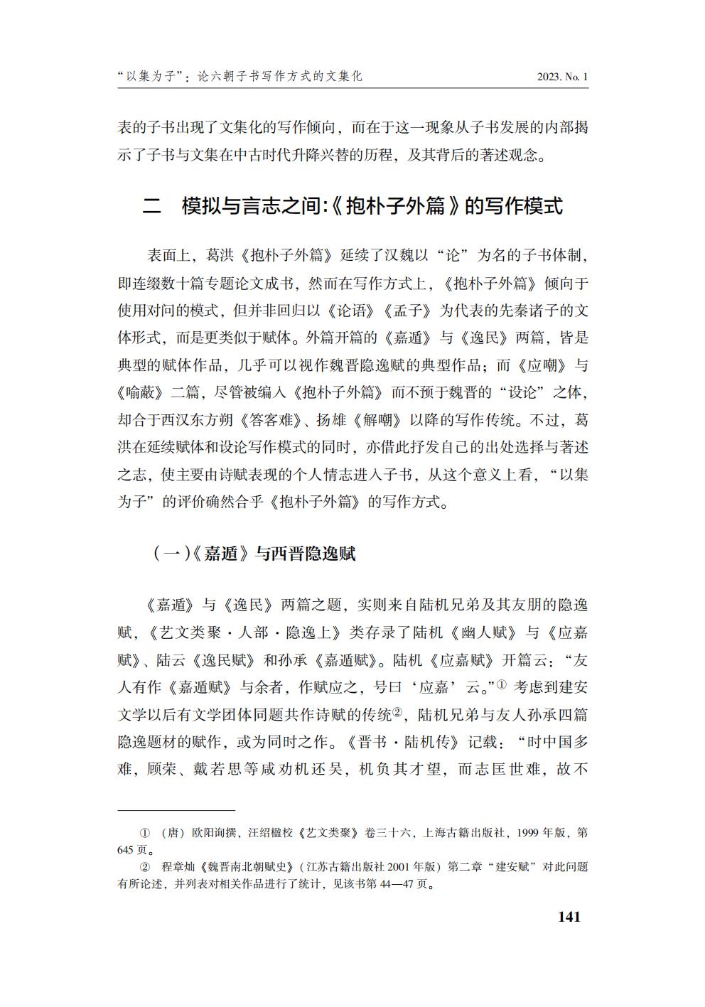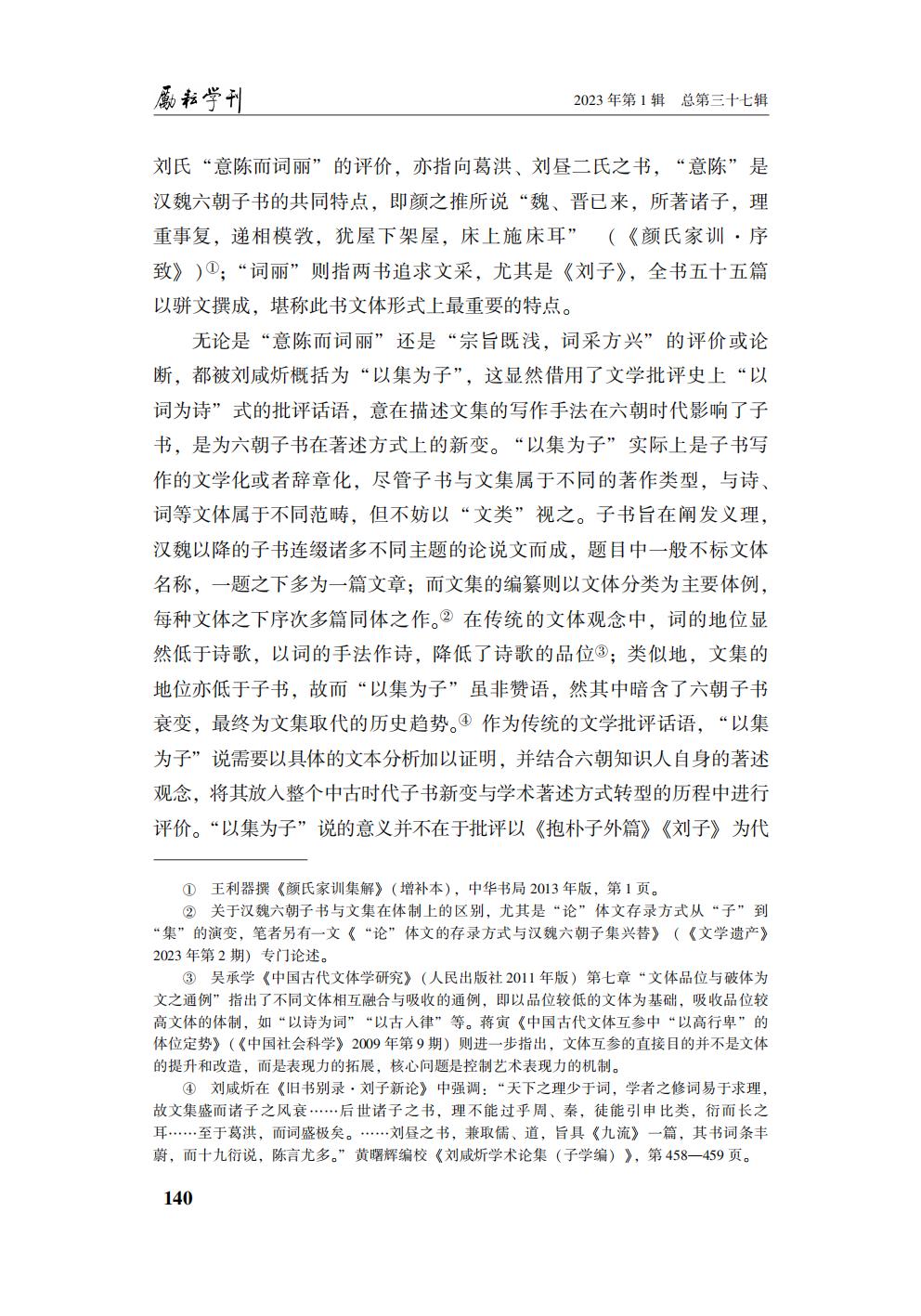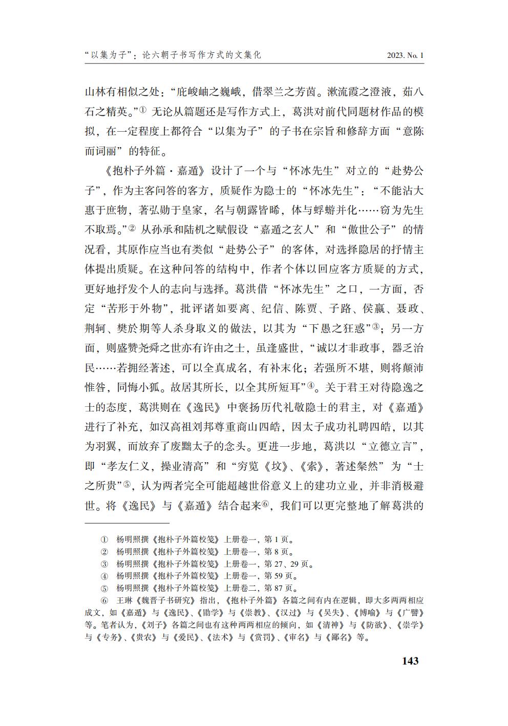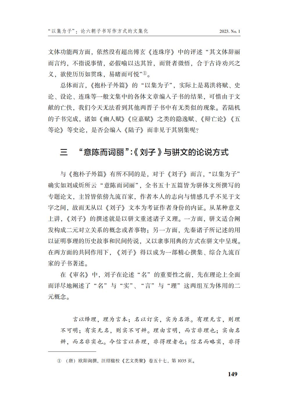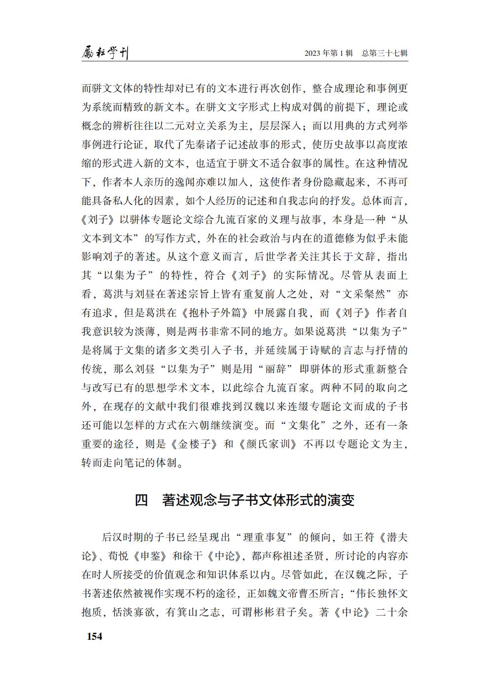 摘要:“以集为子”说是刘咸炘提出的命题,借以指以《抱朴子》《刘子》为代表的六朝子书重辞藻而轻宗旨的写作方式。葛洪《抱朴子外篇》的篇目,有赋、设论、史论和连珠等各种文学文体,在继承前代写作模式的基础上,葛洪亦在其中表现了个体的人生选择与著述理想;《刘子》的作者则隐匿了自我,重新整合九流百家的思想,所论事理多因袭前人,而骈文的写作形成了更加理论化与辞章化的学术文本。整体而言,无论魏晋士人的著述观念,还是史志目录的分类,都表明子书与文集是两种不同性质的学术著述,然而文集的因素影响着子书的写作,客观上推动了中古时代子书与文集兴替的历史进程。