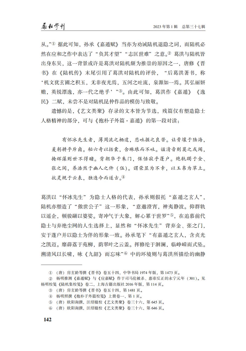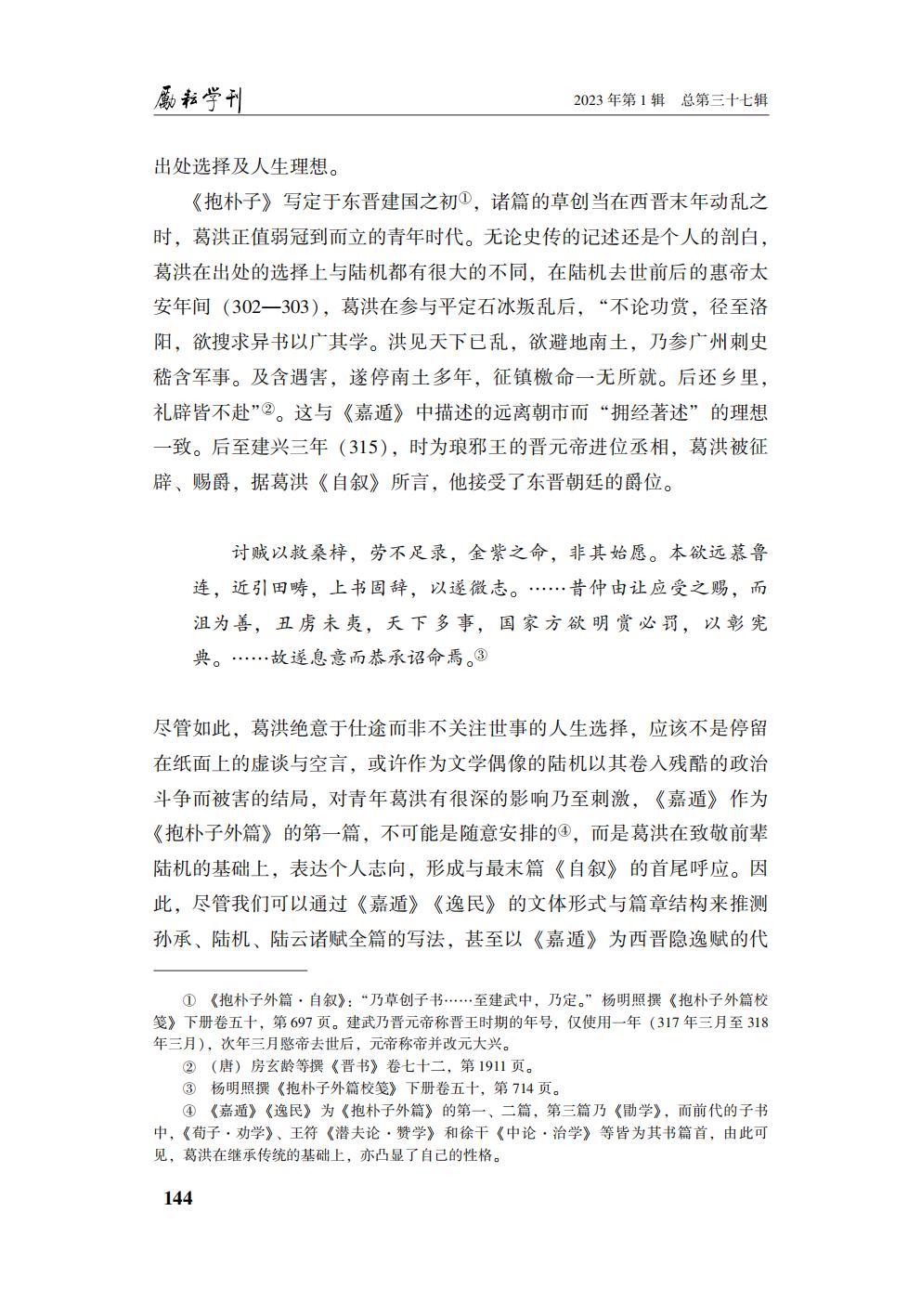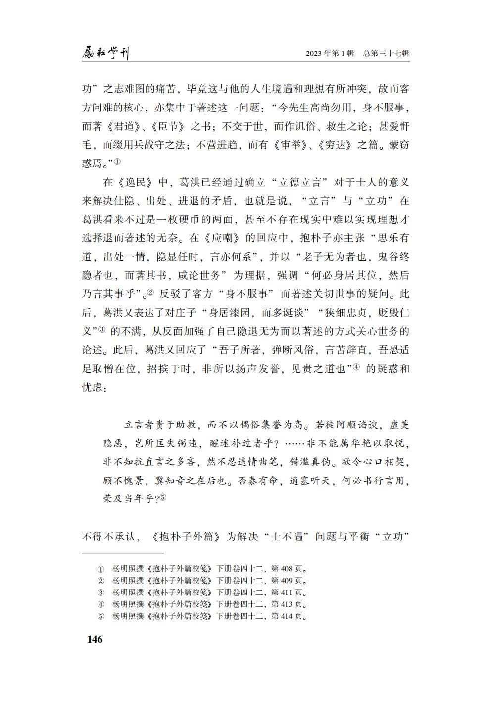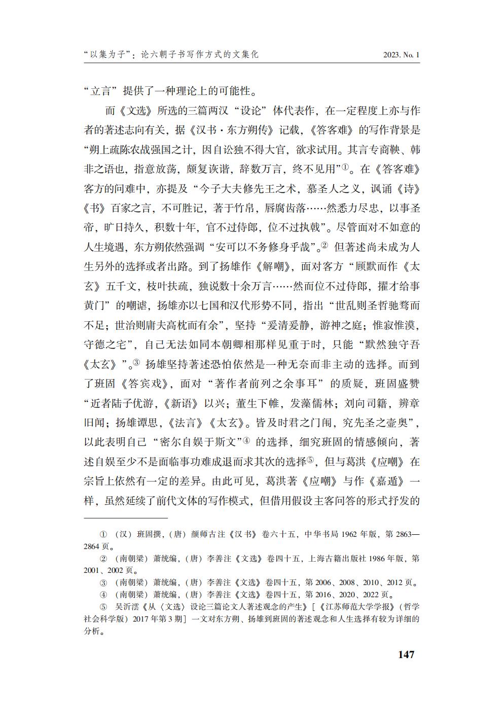 摘要:“以集为子”说是刘咸炘提出的命题,借以指以《抱朴子》《刘子》为代表的六朝子书重辞藻而轻宗旨的写作方式。葛洪《抱朴子外篇》的篇目,有赋、设论、史论和连珠等各种文学文体,在继承前代写作模式的基础上,葛洪亦在其中表现了个体的人生选择与著述理想;《刘子》的作者则隐匿了自我,重新整合九流百家的思想,所论事理多因袭前人,而骈文的写作形成了更加理论化与辞章化的学术文本。整体而言,无论魏晋士人的著述观念,还是史志目录的分类,都表明子书与文集是两种不同性质的学术著述,然而文集的因素影响着子书的写作,客观上推动了中古时代子书与文集兴替的历史进程。