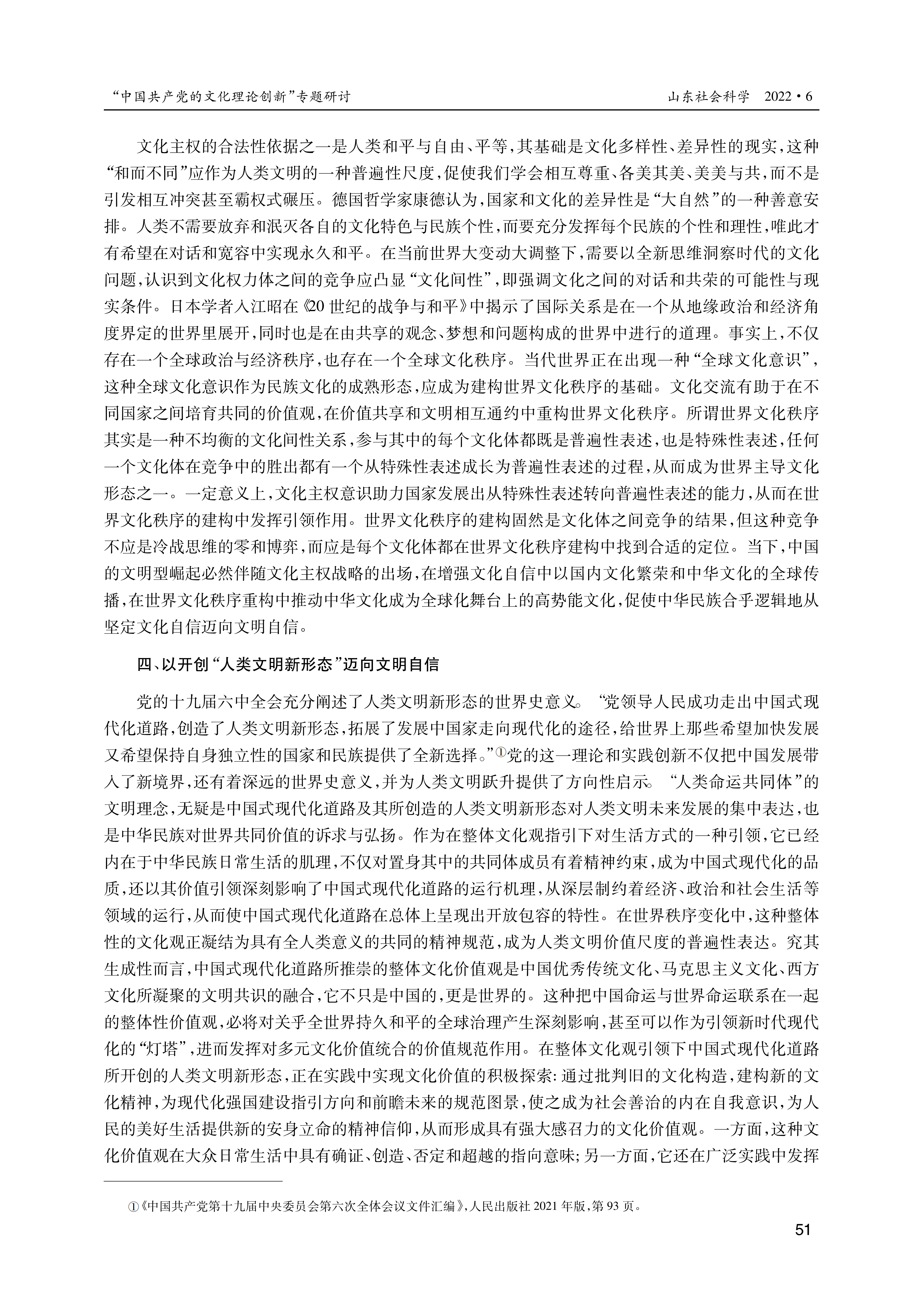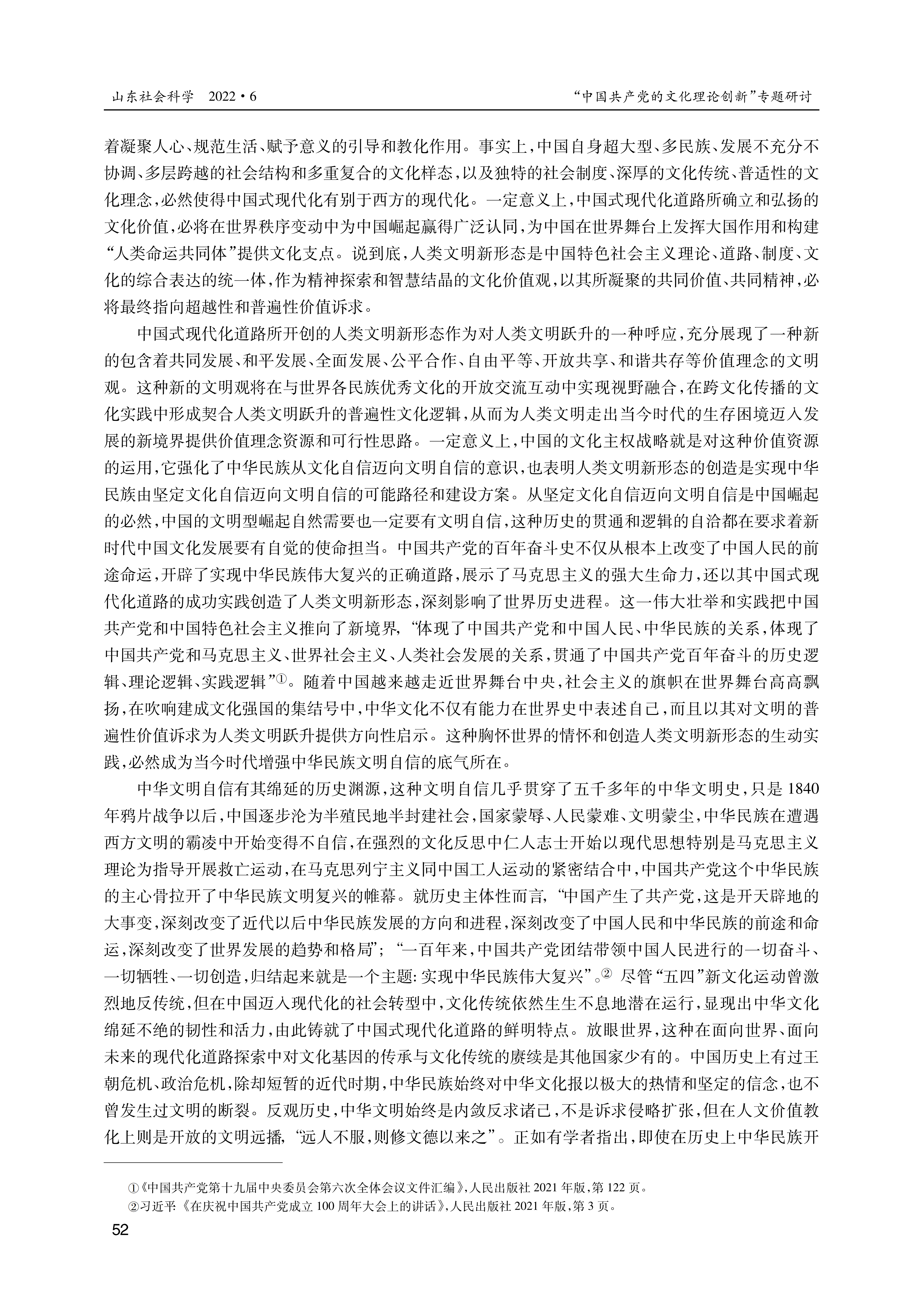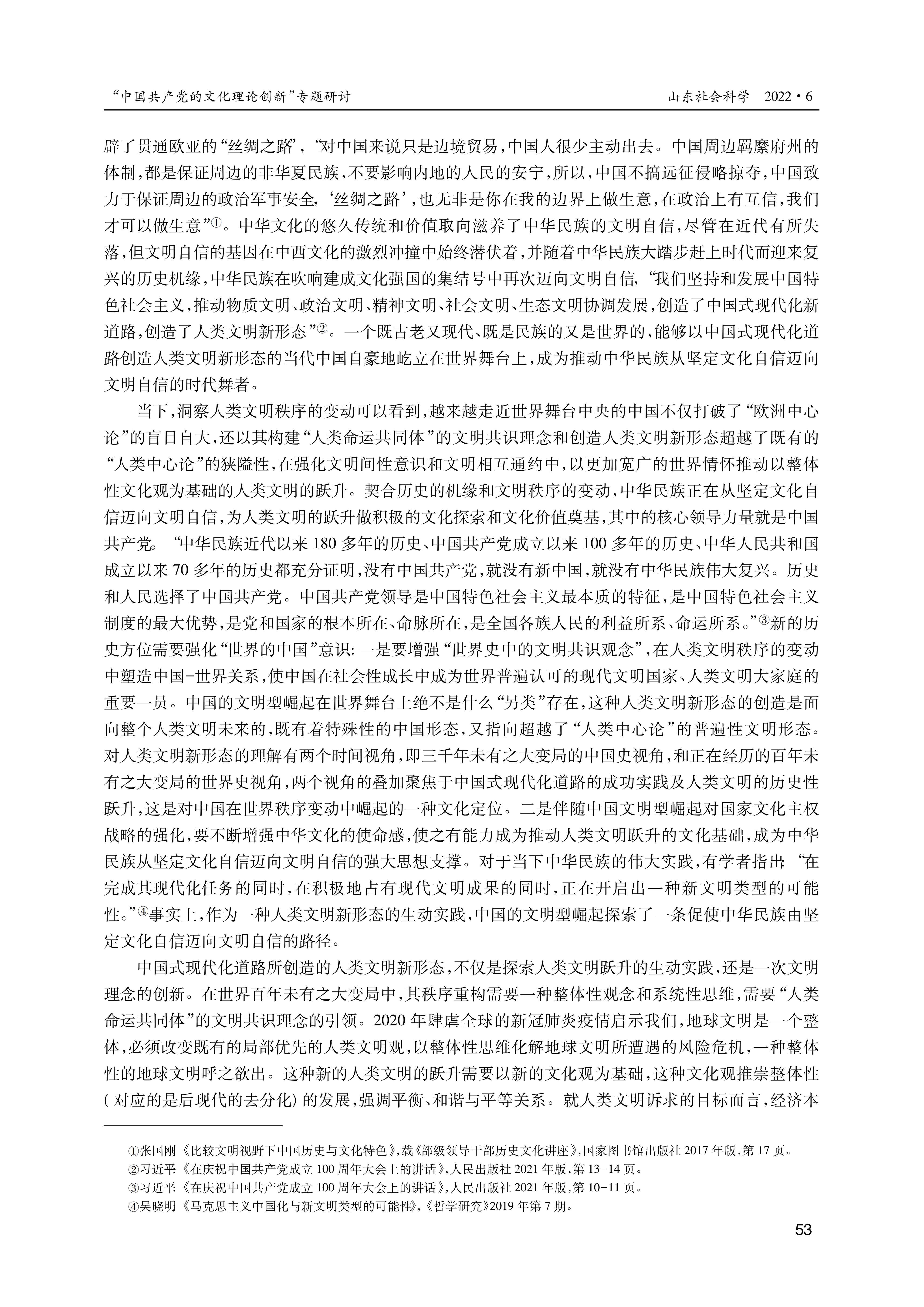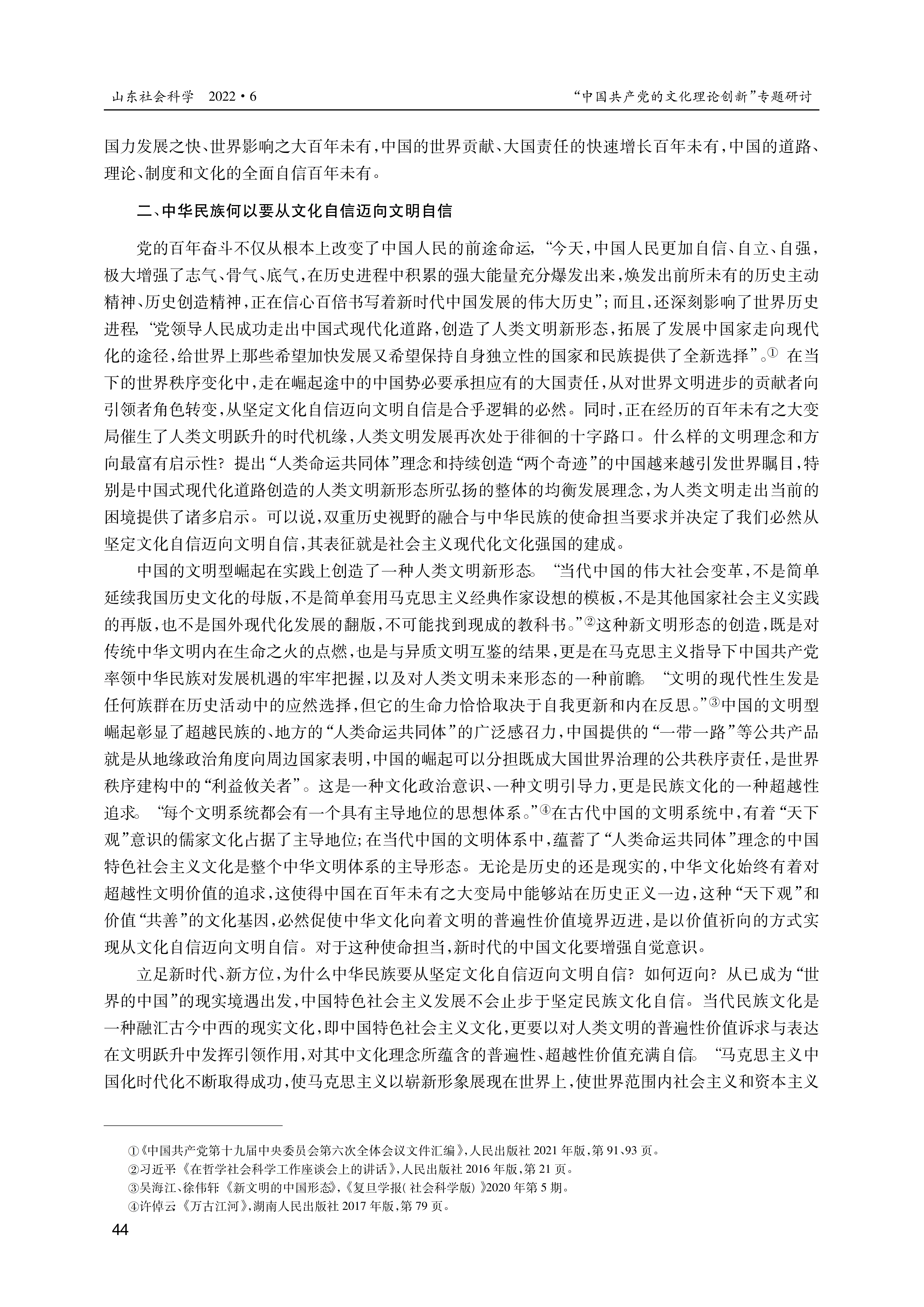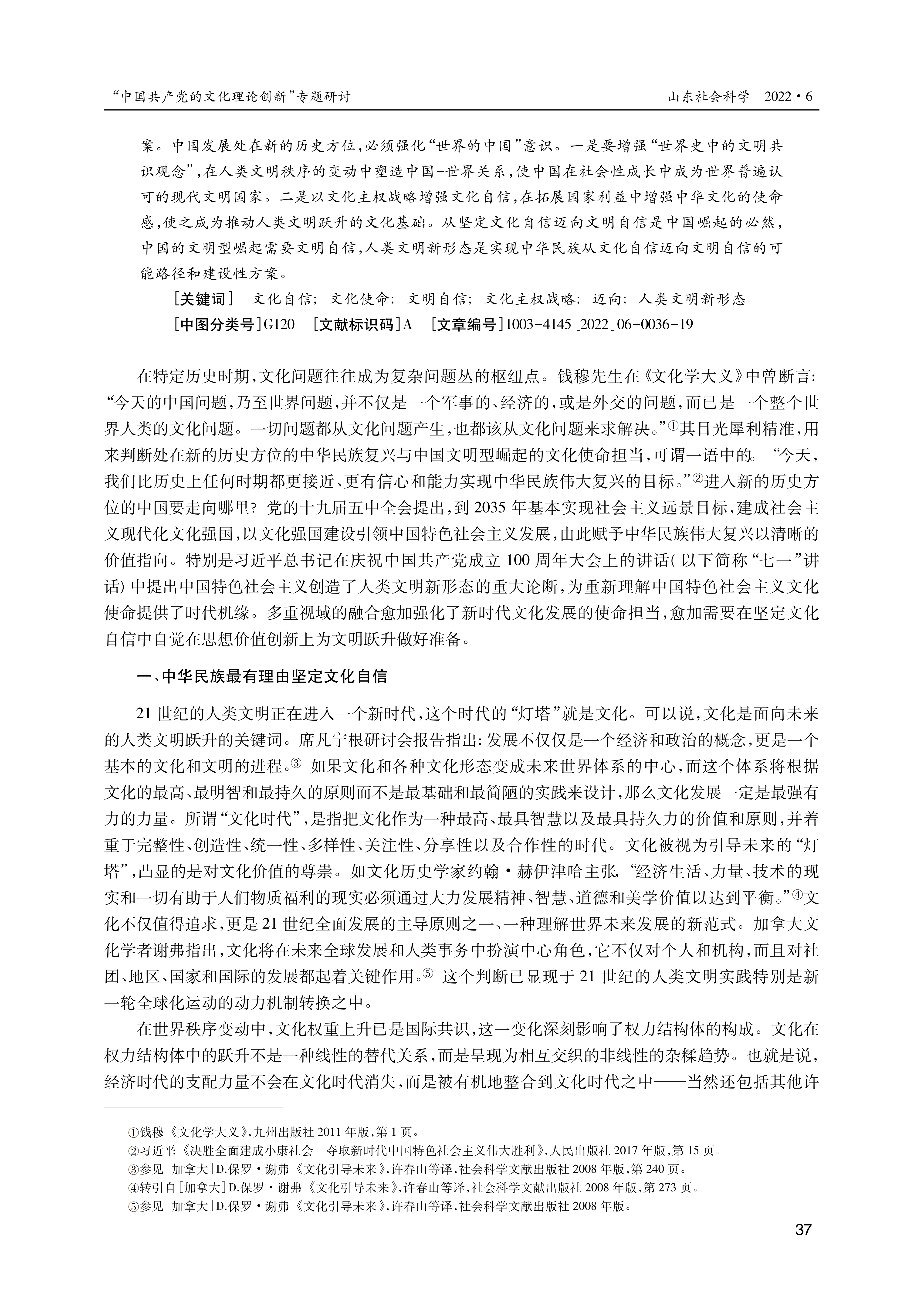 摘 要:习近平总书记在庆祝中国共产党成立 100 周年大会上的讲话中提出中国特色社会主义创造了人类文明新形态的重大论断,为重新理解中国特色社会主义文化使命提供了时代机缘。中国的崛起在最终意义上是文化的崛起,是中华文明的复兴,这对人类文明跃升具有重要的方向性启示。中国的崛起是有别于现代世界体系中某些西方既成大国“国强必霸”的文明型崛起,是发展理念和文明形态的一种创新,能够为世界进步提供中国智慧、为全球治理提供中国方案。中国发展处在新的历史方位,必须强化“世界的中国”意识。一是要增强“世界史中的文明共识观念”,在人类文明秩序的变动中塑造中国-世界关系,使中国在社会性成长中成为世界普遍认可的现代文明国家。二是以文化主权战略增强文化自信,在拓展国家利益中增强中华文化的使命感,使之成为推动人类文明跃升的文化基础。从坚定文化自信迈向文明自信是中国崛起的必然,中国的文明型崛起需要文明自信,人类文明新形态是实现中华民族从文化自信迈向文明自信的可能路径和建设性方案。