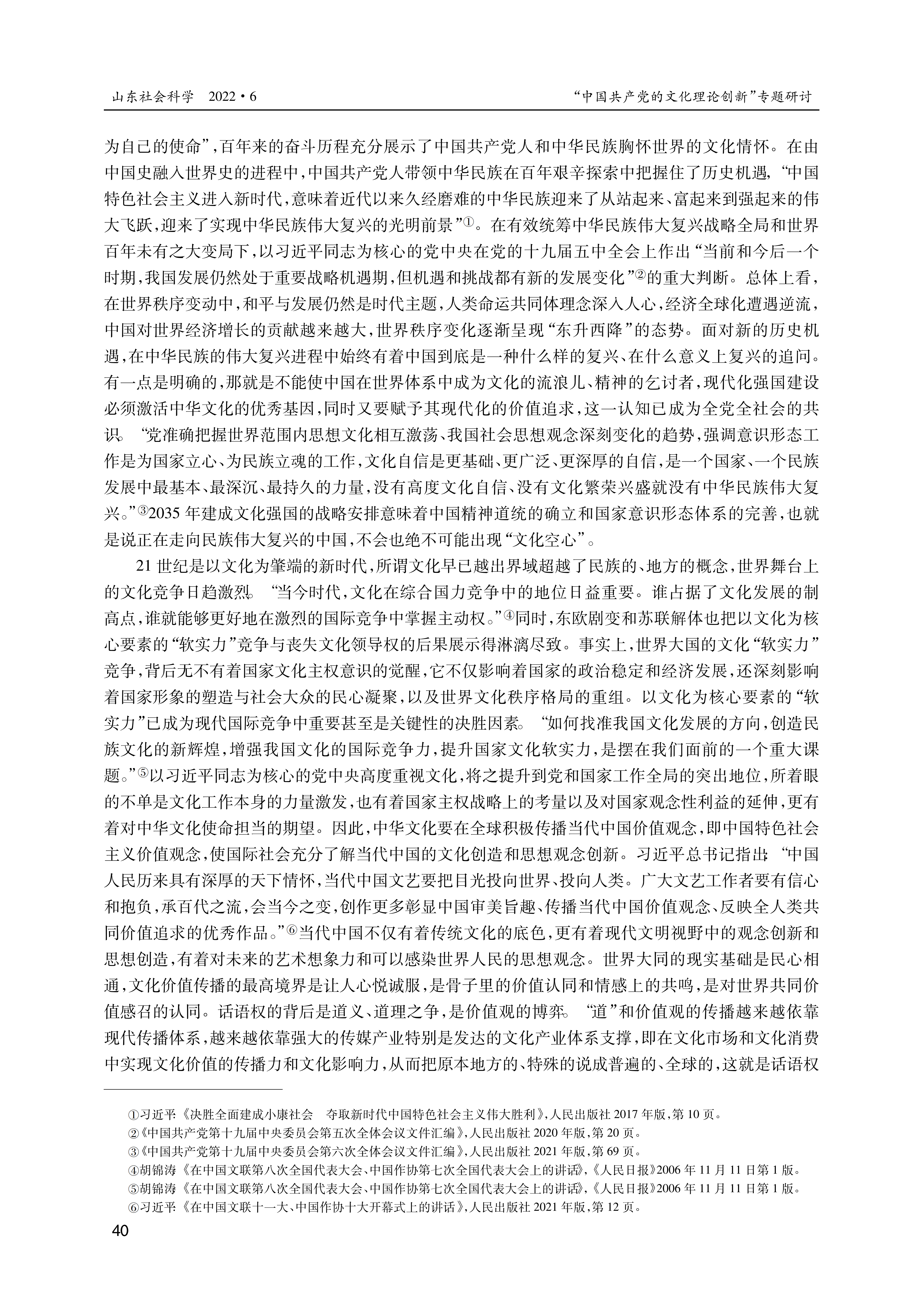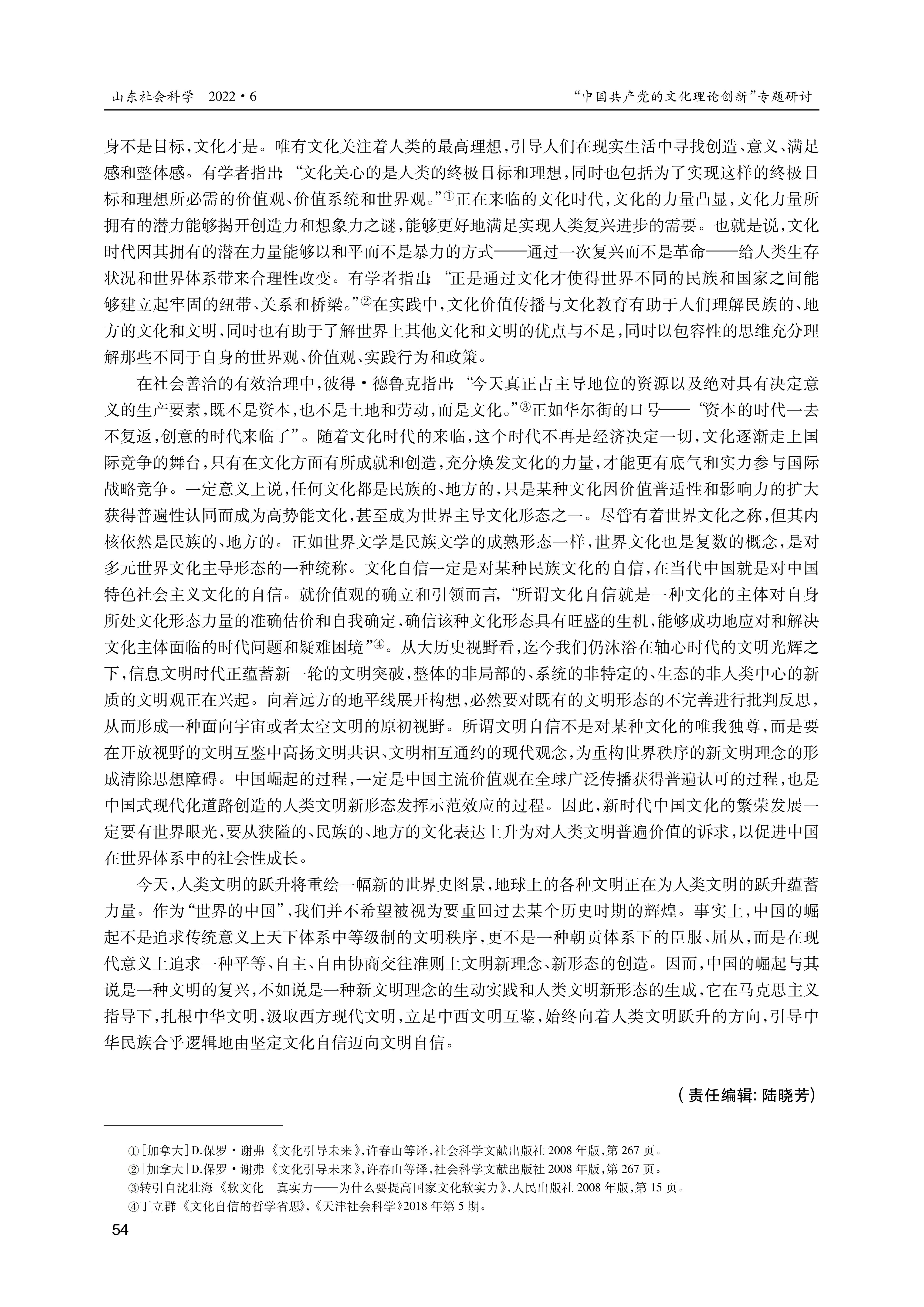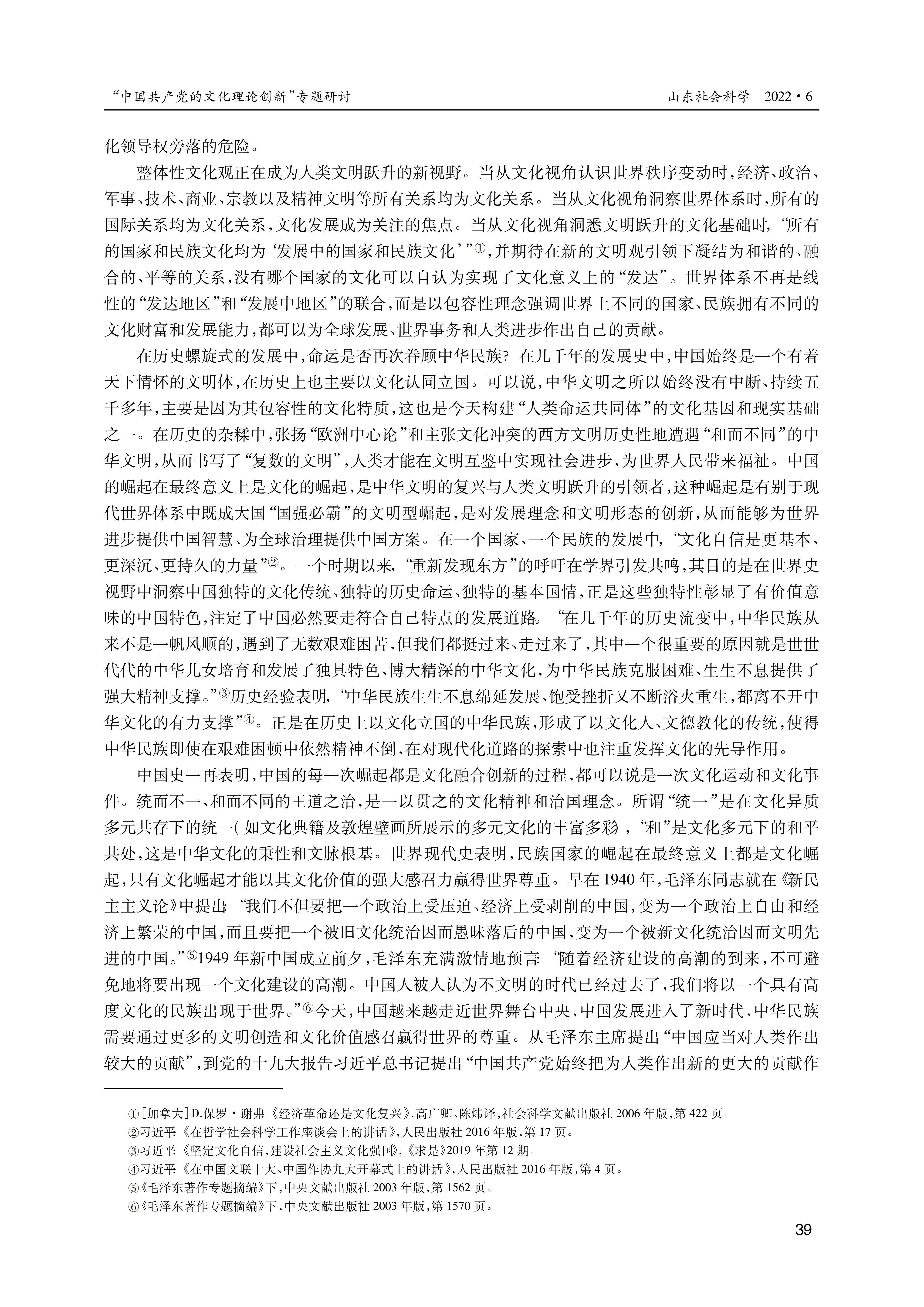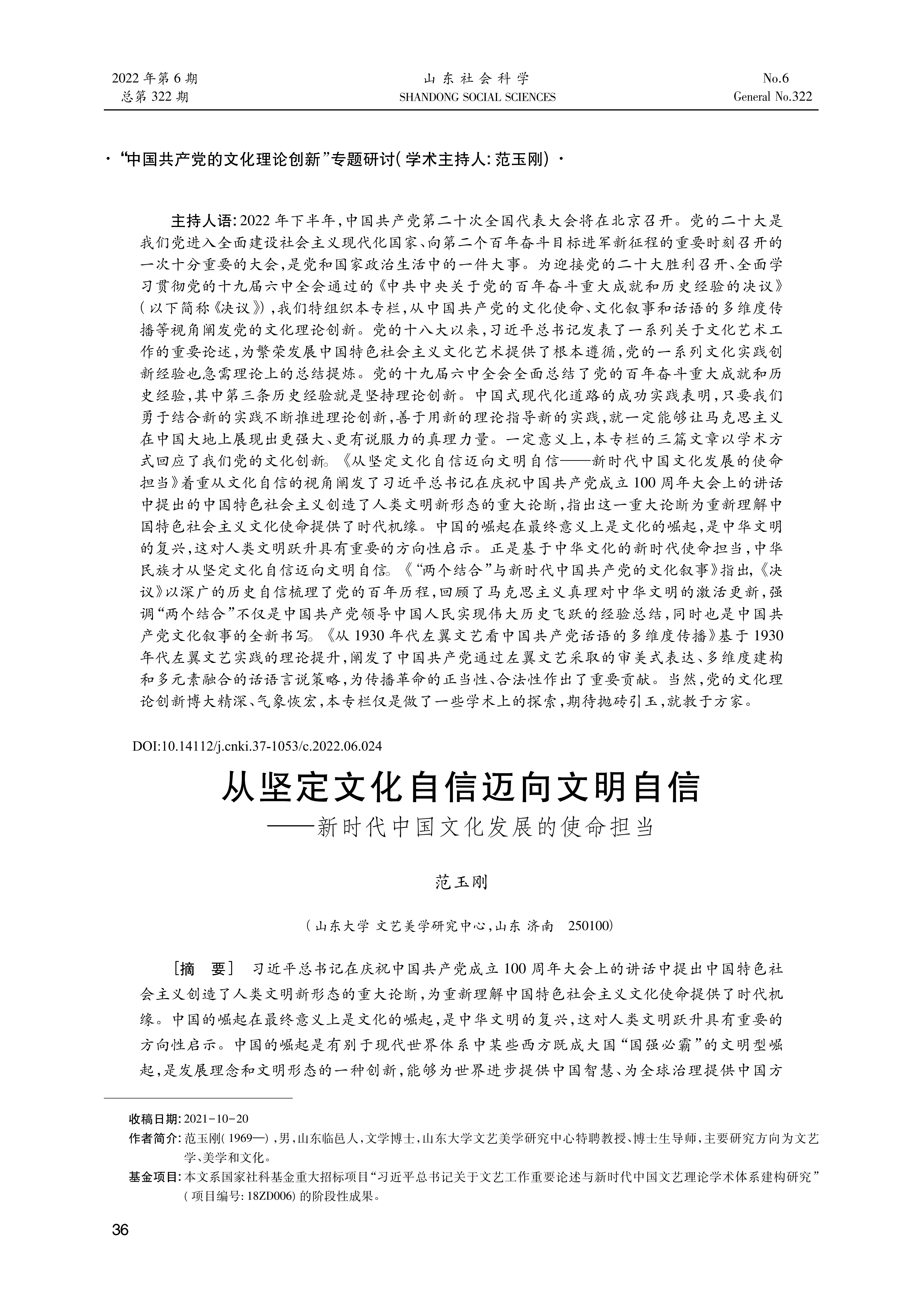 摘 要:习近平总书记在庆祝中国共产党成立 100 周年大会上的讲话中提出中国特色社会主义创造了人类文明新形态的重大论断,为重新理解中国特色社会主义文化使命提供了时代机缘。中国的崛起在最终意义上是文化的崛起,是中华文明的复兴,这对人类文明跃升具有重要的方向性启示。中国的崛起是有别于现代世界体系中某些西方既成大国“国强必霸”的文明型崛起,是发展理念和文明形态的一种创新,能够为世界进步提供中国智慧、为全球治理提供中国方案。中国发展处在新的历史方位,必须强化“世界的中国”意识。一是要增强“世界史中的文明共识观念”,在人类文明秩序的变动中塑造中国-世界关系,使中国在社会性成长中成为世界普遍认可的现代文明国家。二是以文化主权战略增强文化自信,在拓展国家利益中增强中华文化的使命感,使之成为推动人类文明跃升的文化基础。从坚定文化自信迈向文明自信是中国崛起的必然,中国的文明型崛起需要文明自信,人类文明新形态是实现中华民族从文化自信迈向文明自信的可能路径和建设性方案。