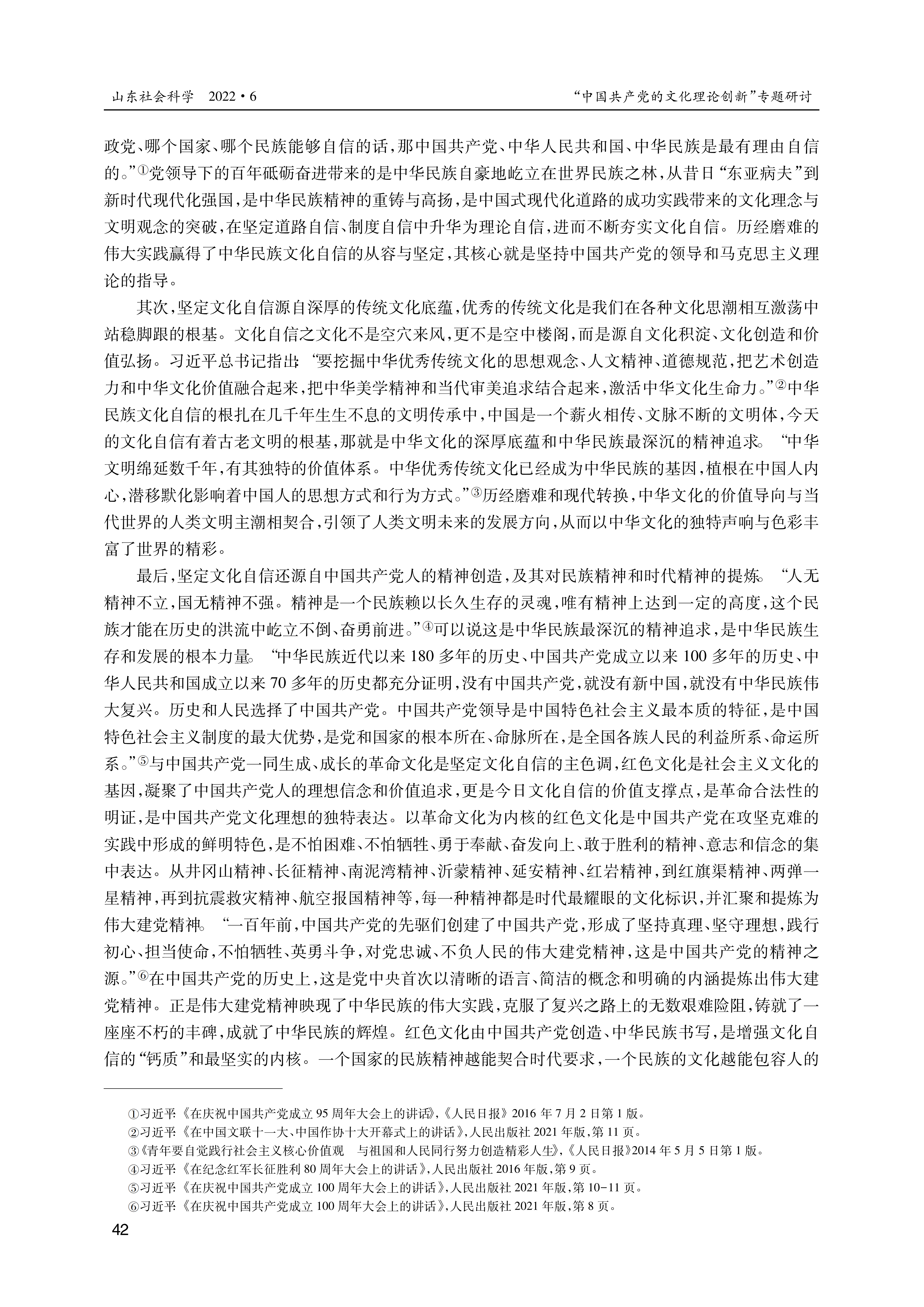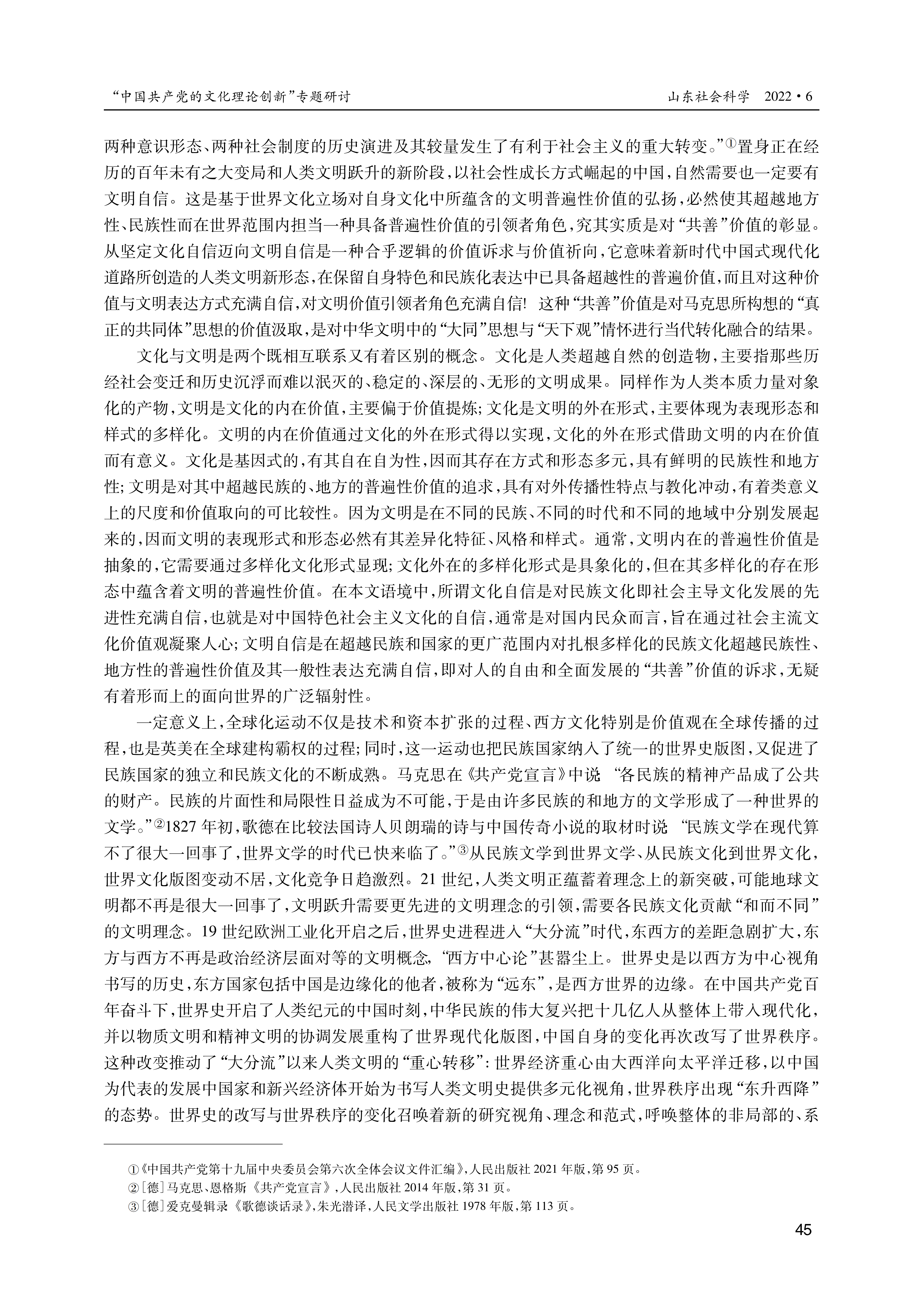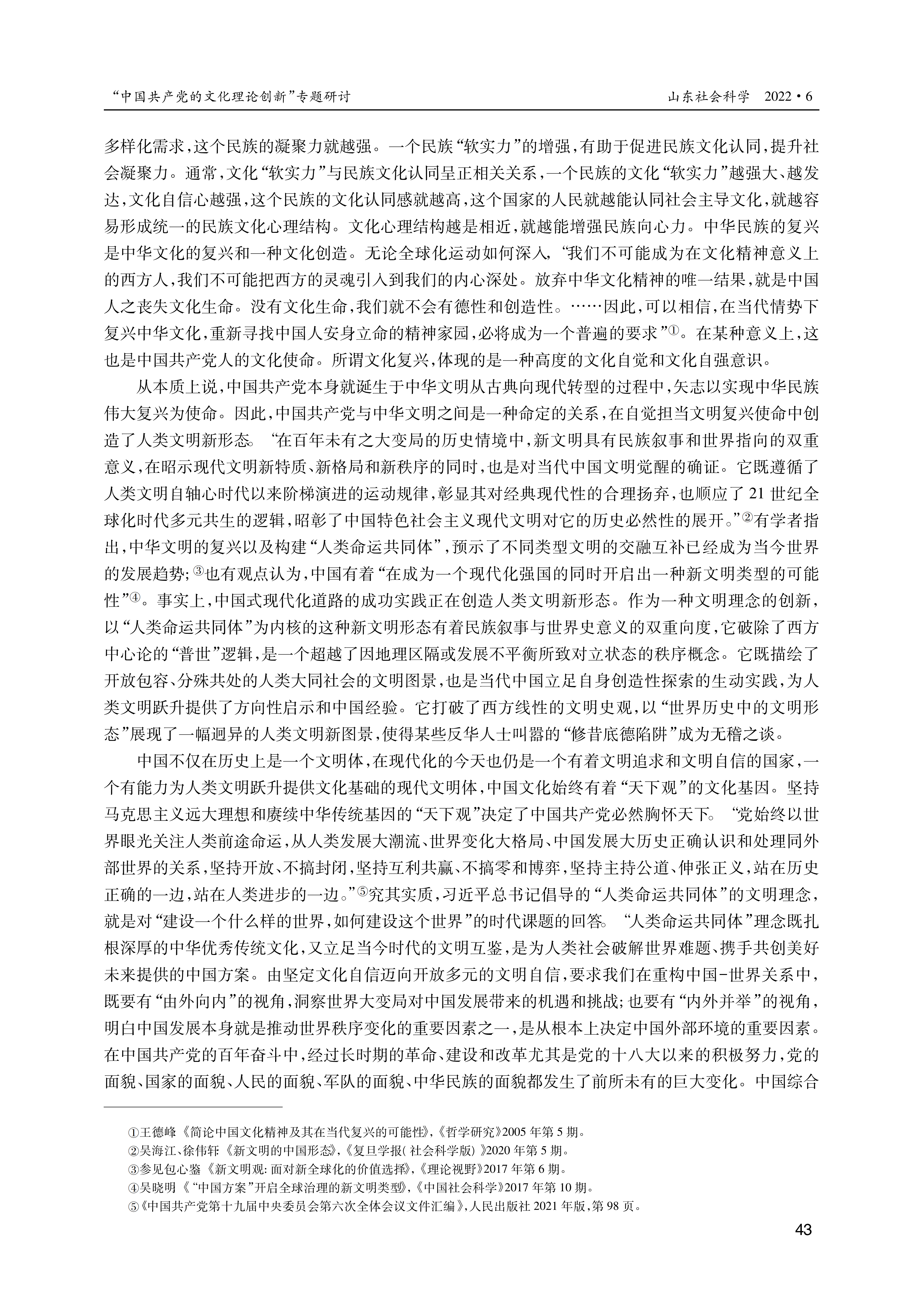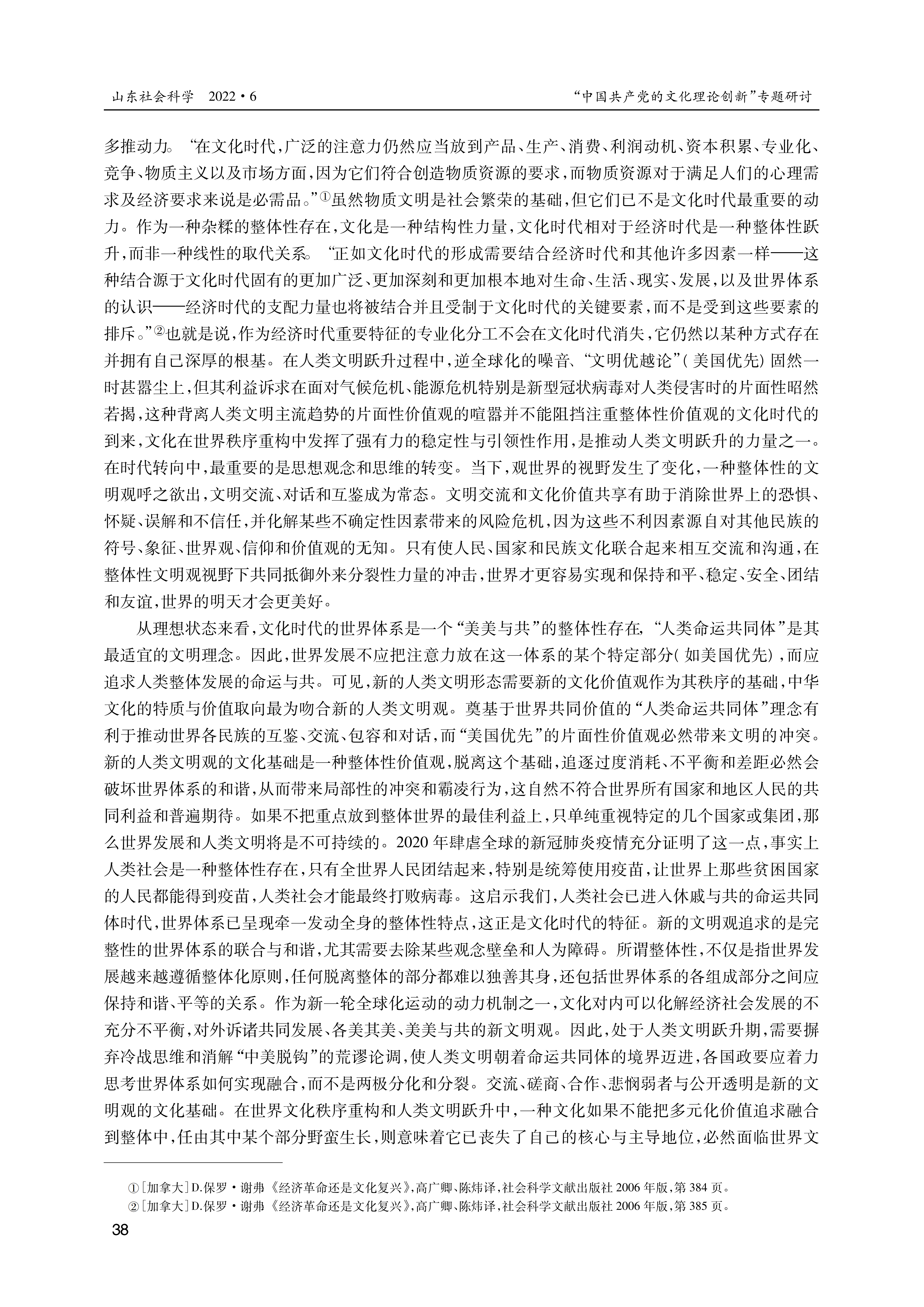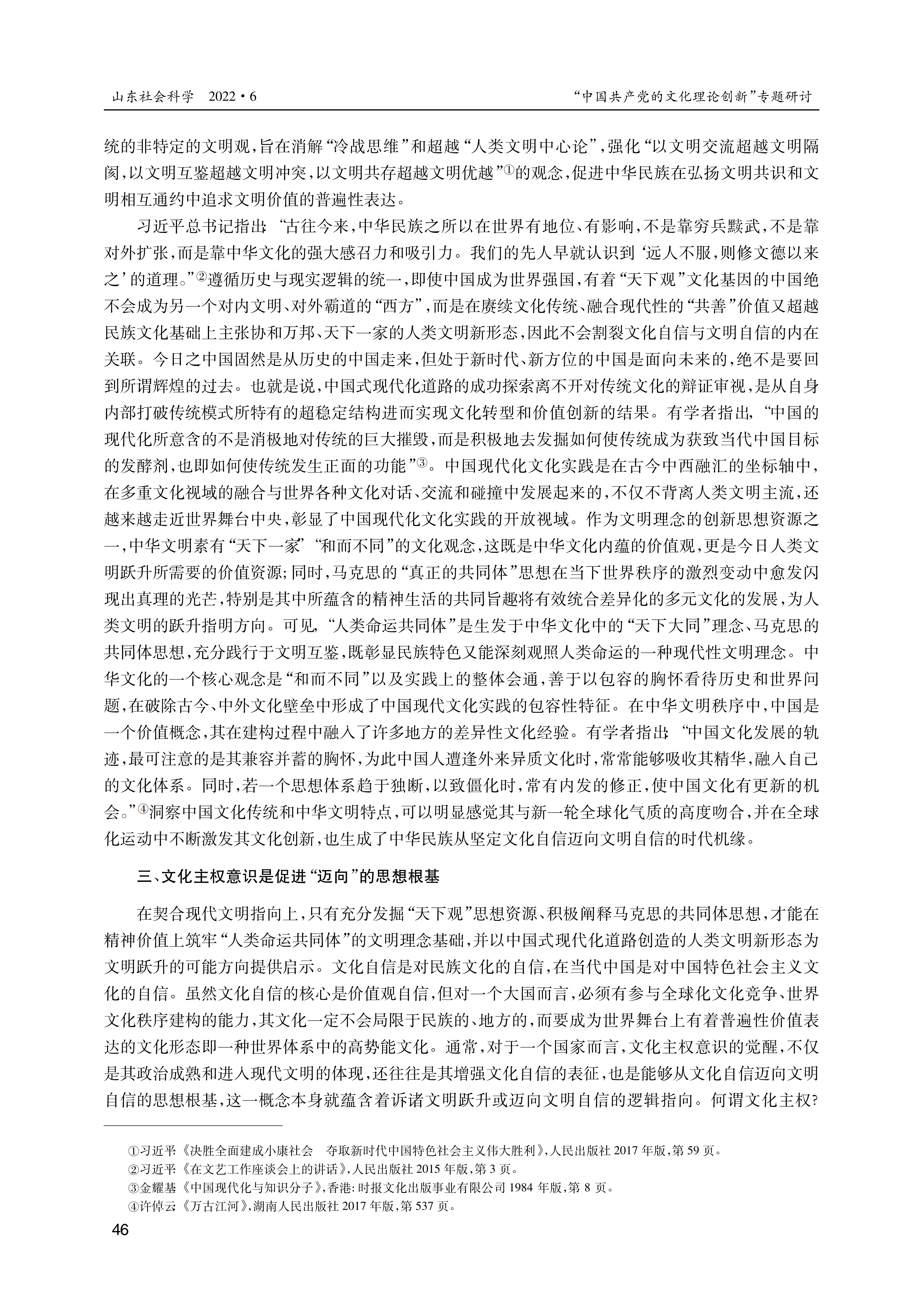 摘 要:习近平总书记在庆祝中国共产党成立 100 周年大会上的讲话中提出中国特色社会主义创造了人类文明新形态的重大论断,为重新理解中国特色社会主义文化使命提供了时代机缘。中国的崛起在最终意义上是文化的崛起,是中华文明的复兴,这对人类文明跃升具有重要的方向性启示。中国的崛起是有别于现代世界体系中某些西方既成大国“国强必霸”的文明型崛起,是发展理念和文明形态的一种创新,能够为世界进步提供中国智慧、为全球治理提供中国方案。中国发展处在新的历史方位,必须强化“世界的中国”意识。一是要增强“世界史中的文明共识观念”,在人类文明秩序的变动中塑造中国-世界关系,使中国在社会性成长中成为世界普遍认可的现代文明国家。二是以文化主权战略增强文化自信,在拓展国家利益中增强中华文化的使命感,使之成为推动人类文明跃升的文化基础。从坚定文化自信迈向文明自信是中国崛起的必然,中国的文明型崛起需要文明自信,人类文明新形态是实现中华民族从文化自信迈向文明自信的可能路径和建设性方案。