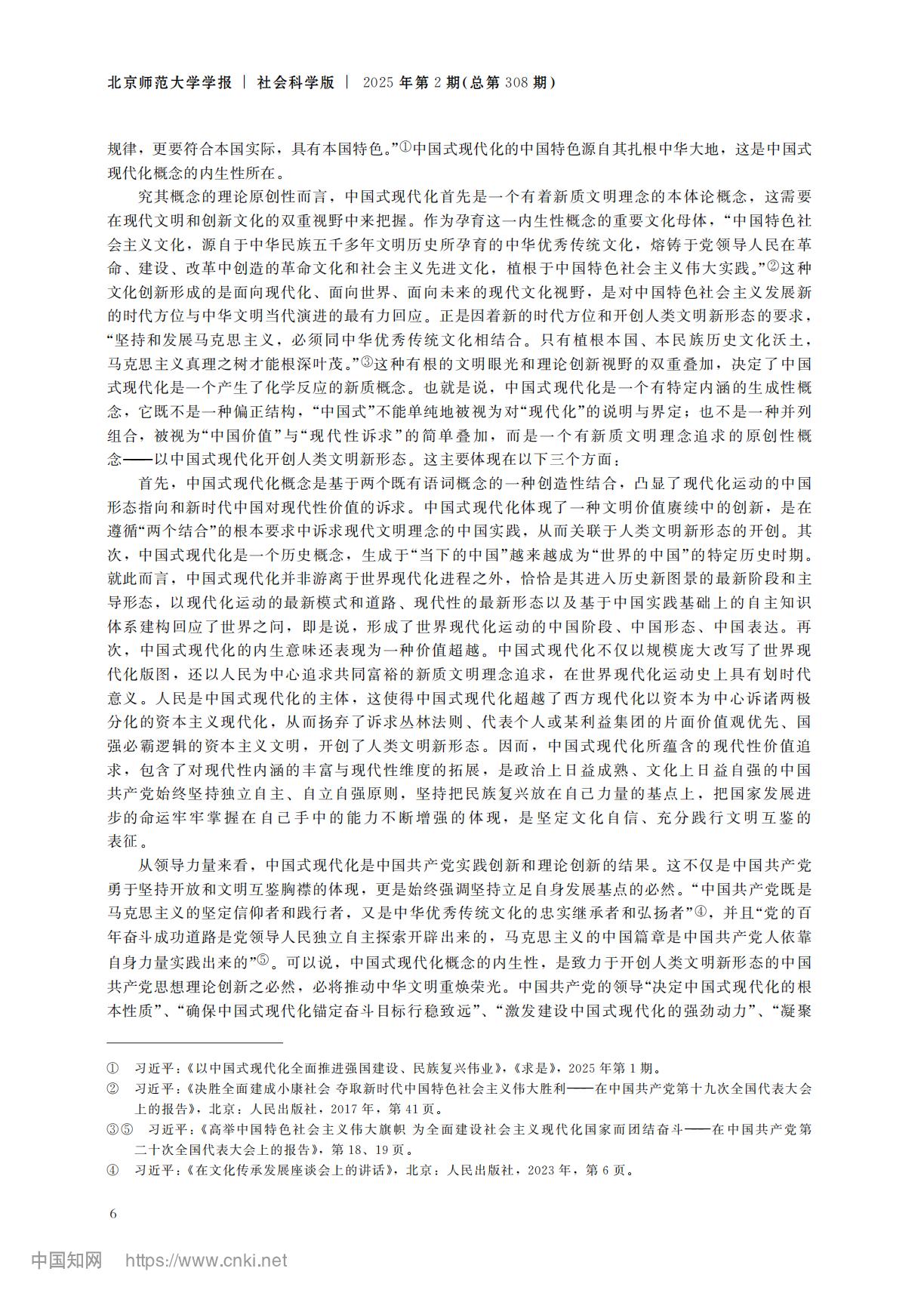 摘要:中国式现代化是一个具有理论原创性的内生性概念,是从中华大地上生长出来的,是遵循“两个结合”特别是“第二个结合”的产物,而非对西方文明与西方文化的模仿、移植和挪用。其文化形态的创新性主要源自马克思主义基本原理同中国具体实际相结合、同中华优秀传统文化相结合所生成的新质内容,特别是中华文化的深厚底蕴深刻影响了中国式现代化的创新取向,从而为超越西方现代化模式和拓展现代性维度提供了价值参照与内在规定性。与时俱进地提出中国式现代化重大论断,是中国共产党从坚定文化自信迈向文化自强的表征,是党的创新理论升华的思想结晶,是马克思主义中国化时代化的最新成果展现。
