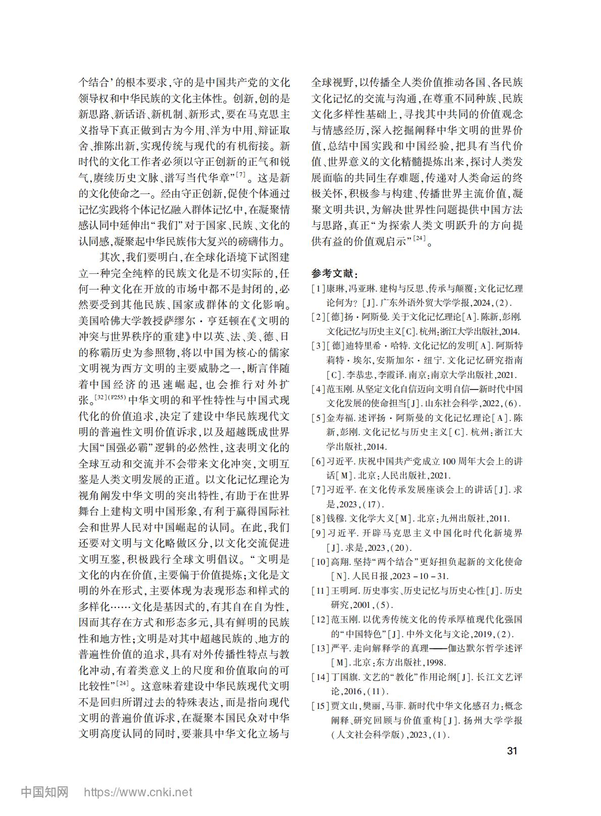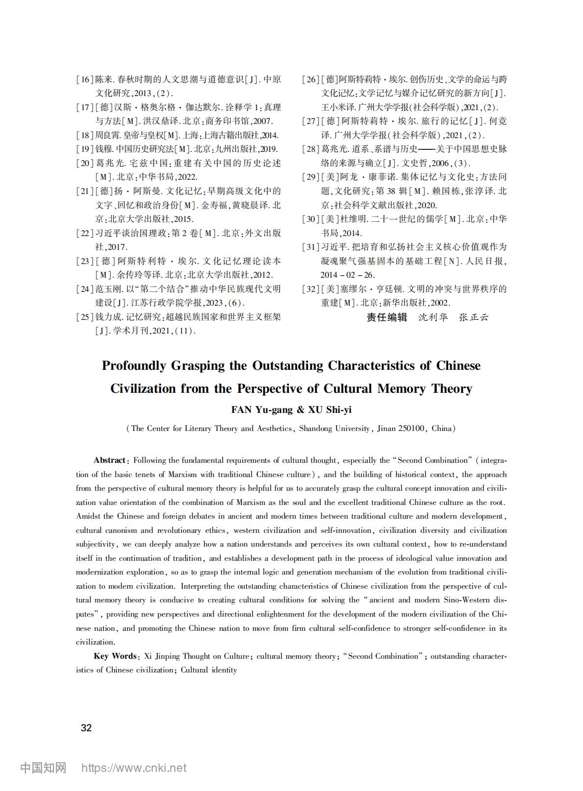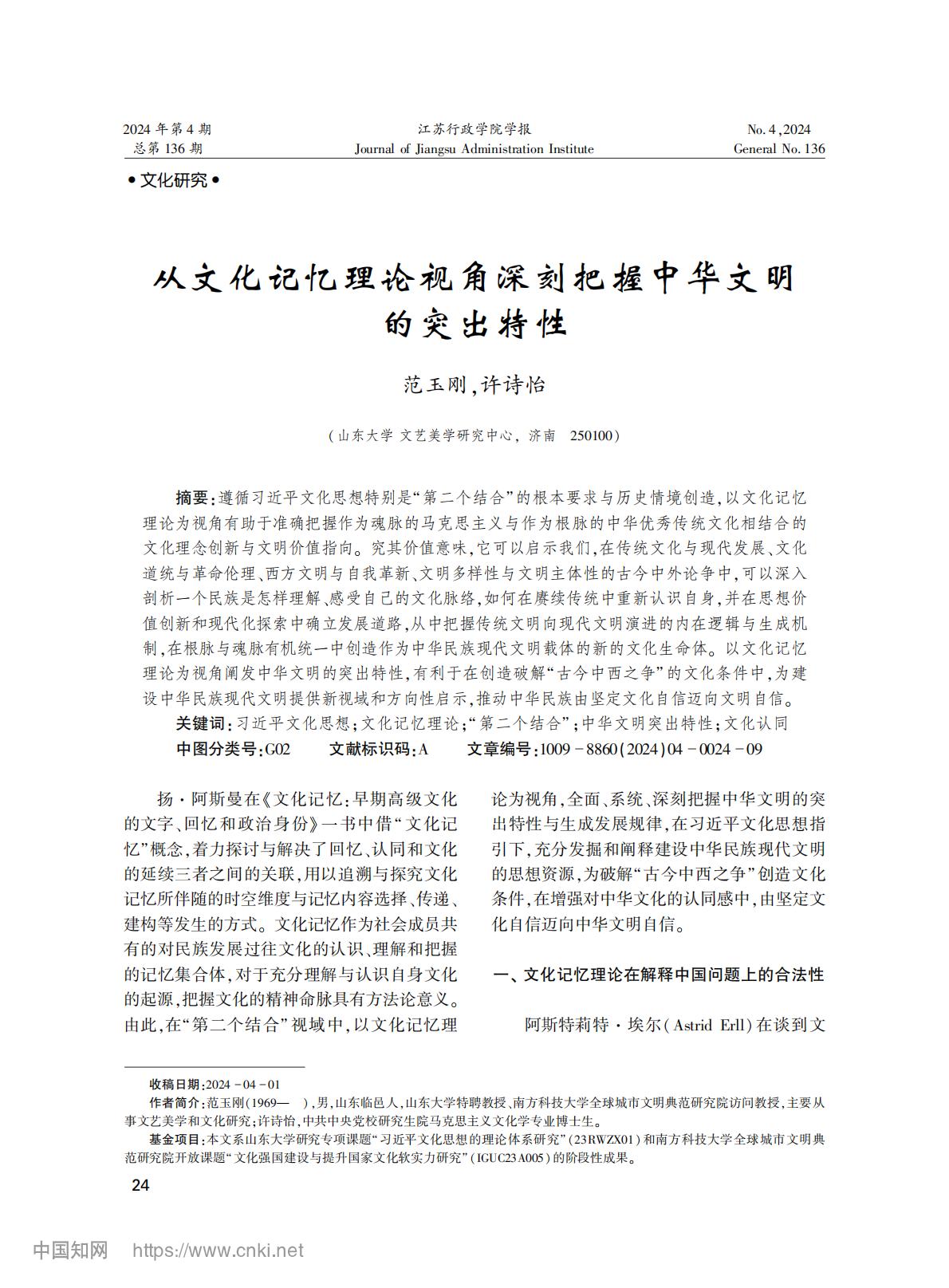 关键词:习近平文化思想;文化记忆理论;“第二个结合”;中华文明突出特性;文化认同