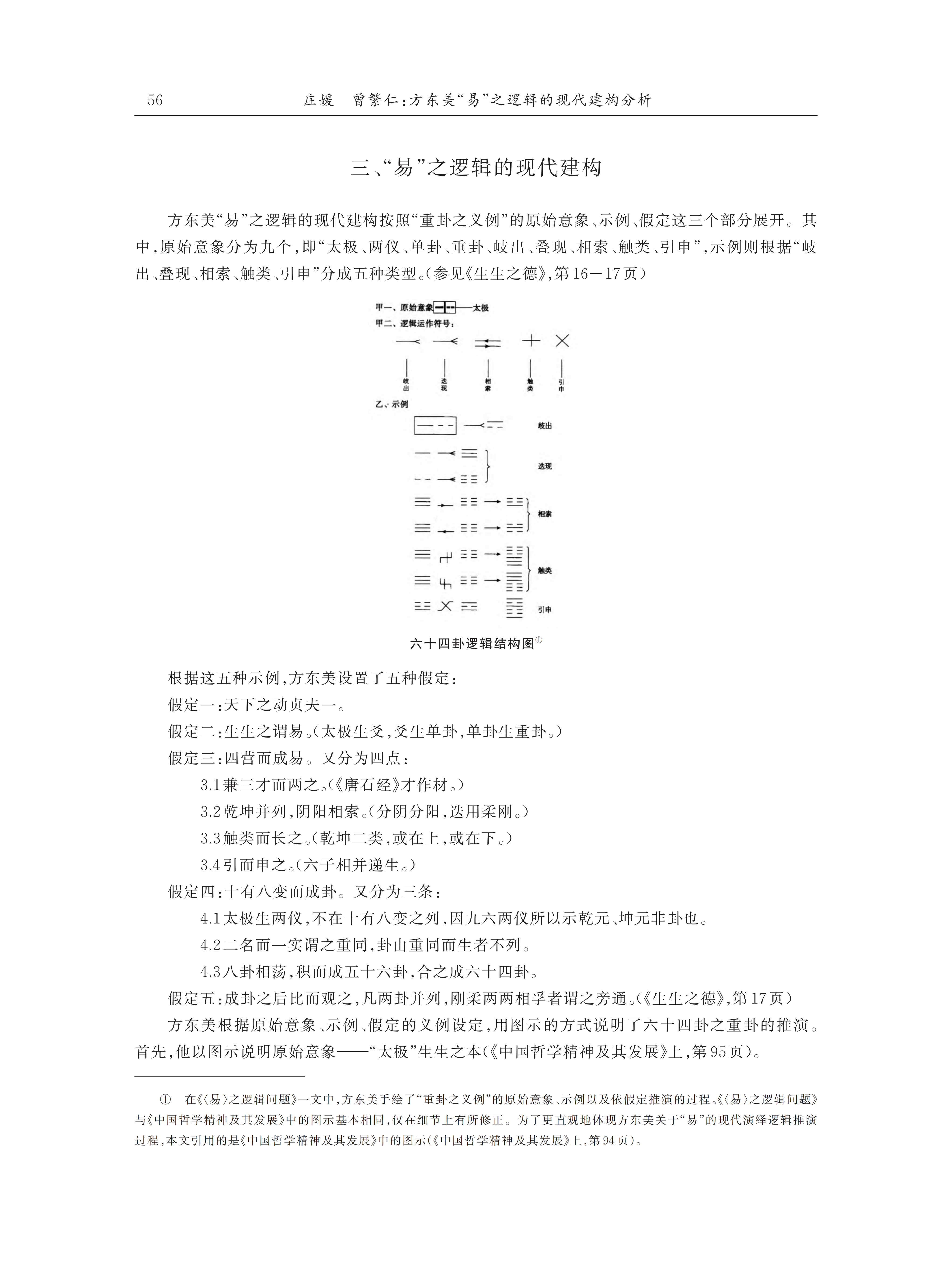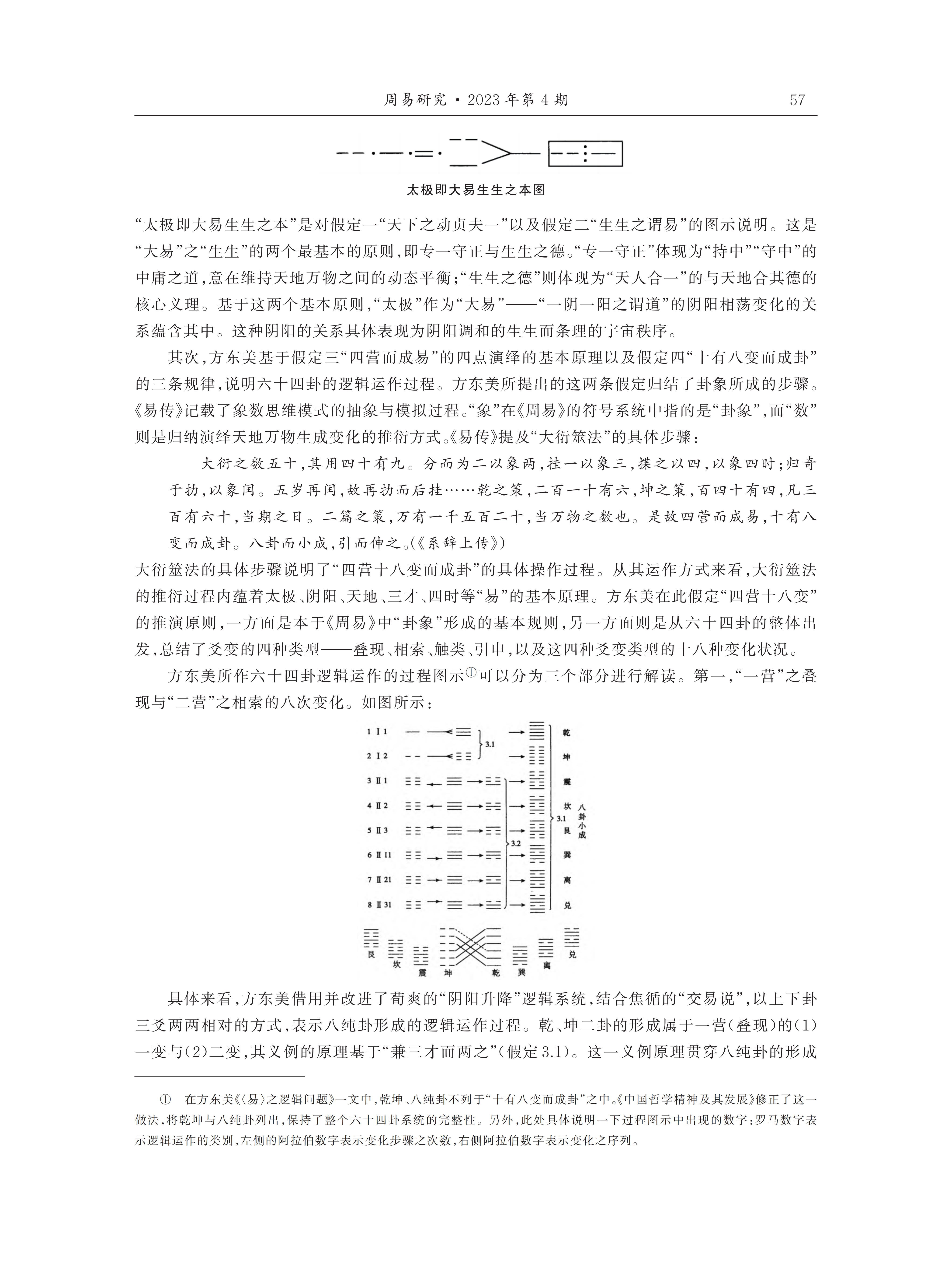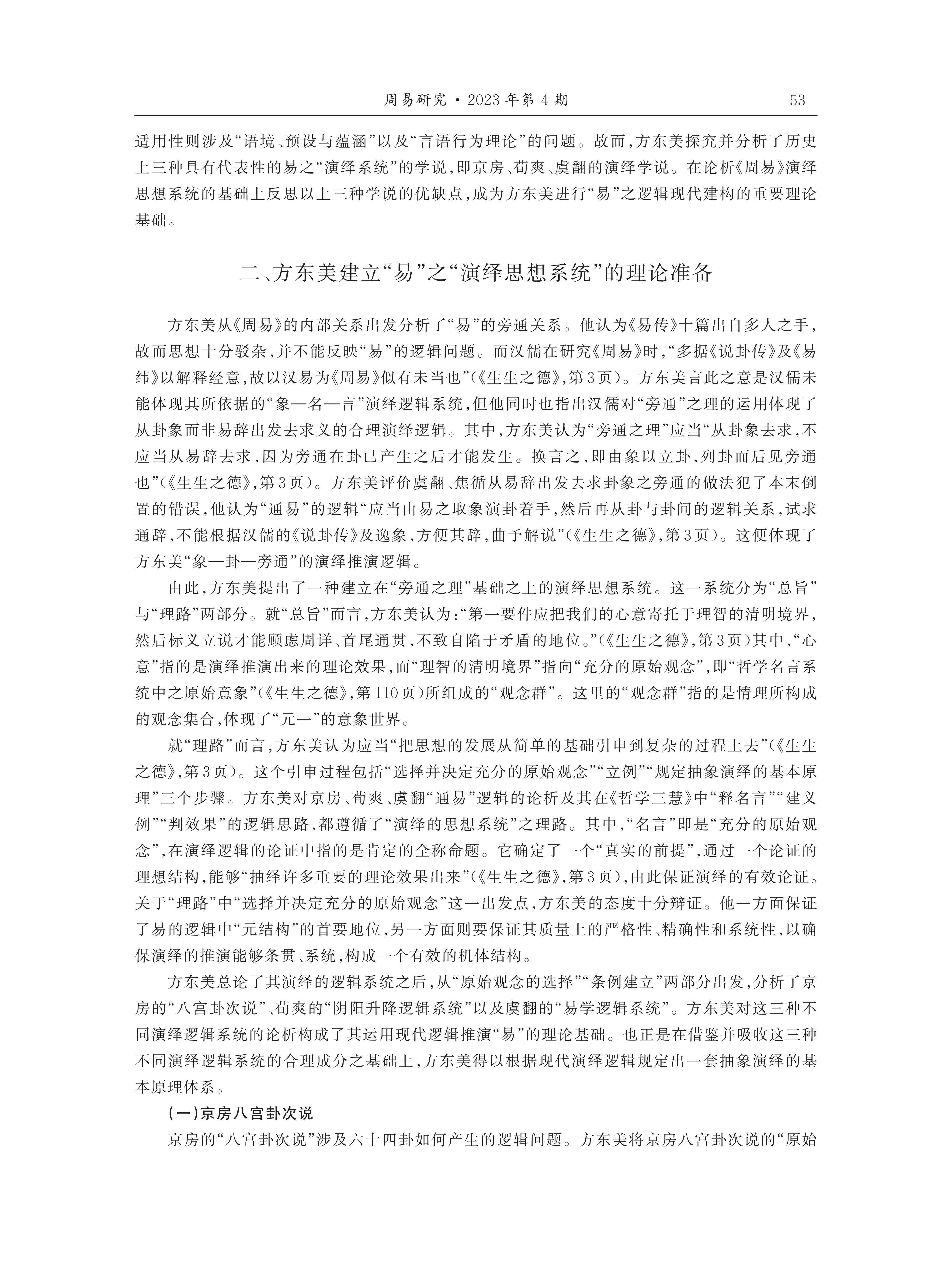 从方东美推演“易”的整体过程来看,一方面,方东美对《易经》形成的历史发展架构格式及其象征符号内部之关系与意义的总结,是其阐释“易”演绎系统及其有效逻辑的前提条件;另一方面,方东美对《周易》演绎思想系统以及京房、荀爽、虞翻等人演绎学说的综合性论析,构成了其“易”之逻辑推演体系的重要理论基础。由此,方东美建构起了以“总旨”与“理路”为主要组成部分的易之“演绎思想系统”。在此基础上,方东美以现代逻辑论证了“易”的演变与变化过程,凸显出“旁通”这一核心逻辑运作原则。