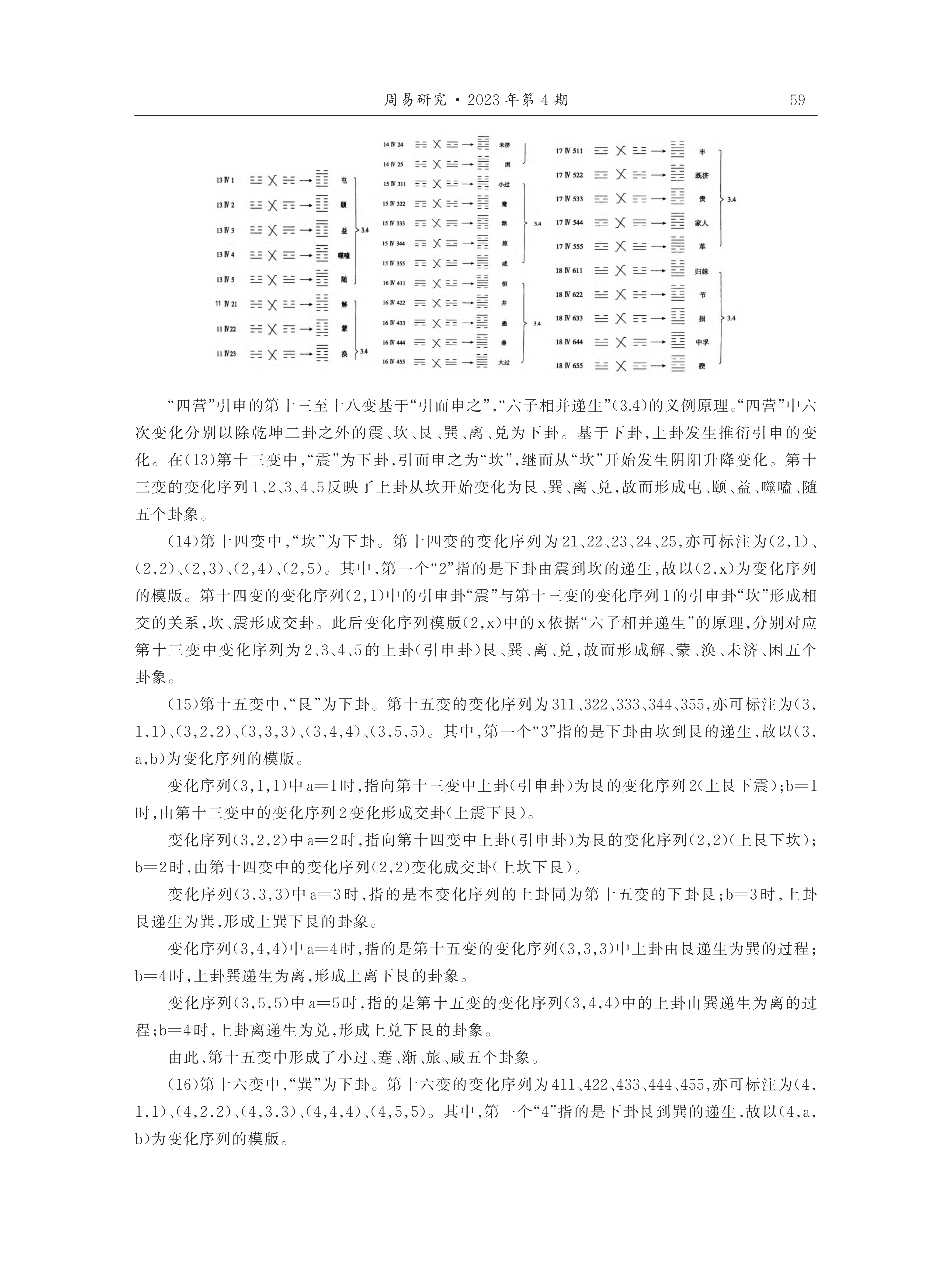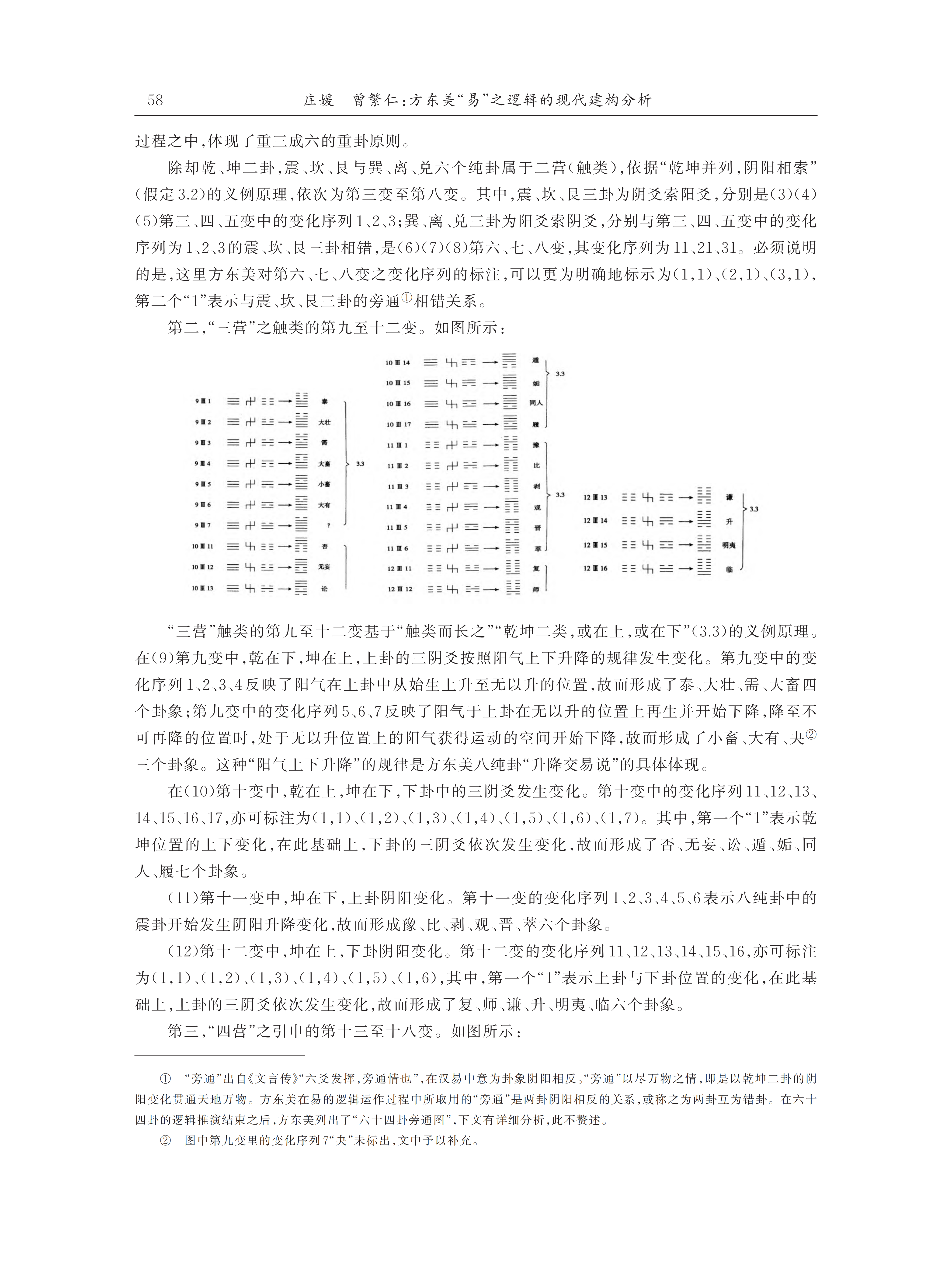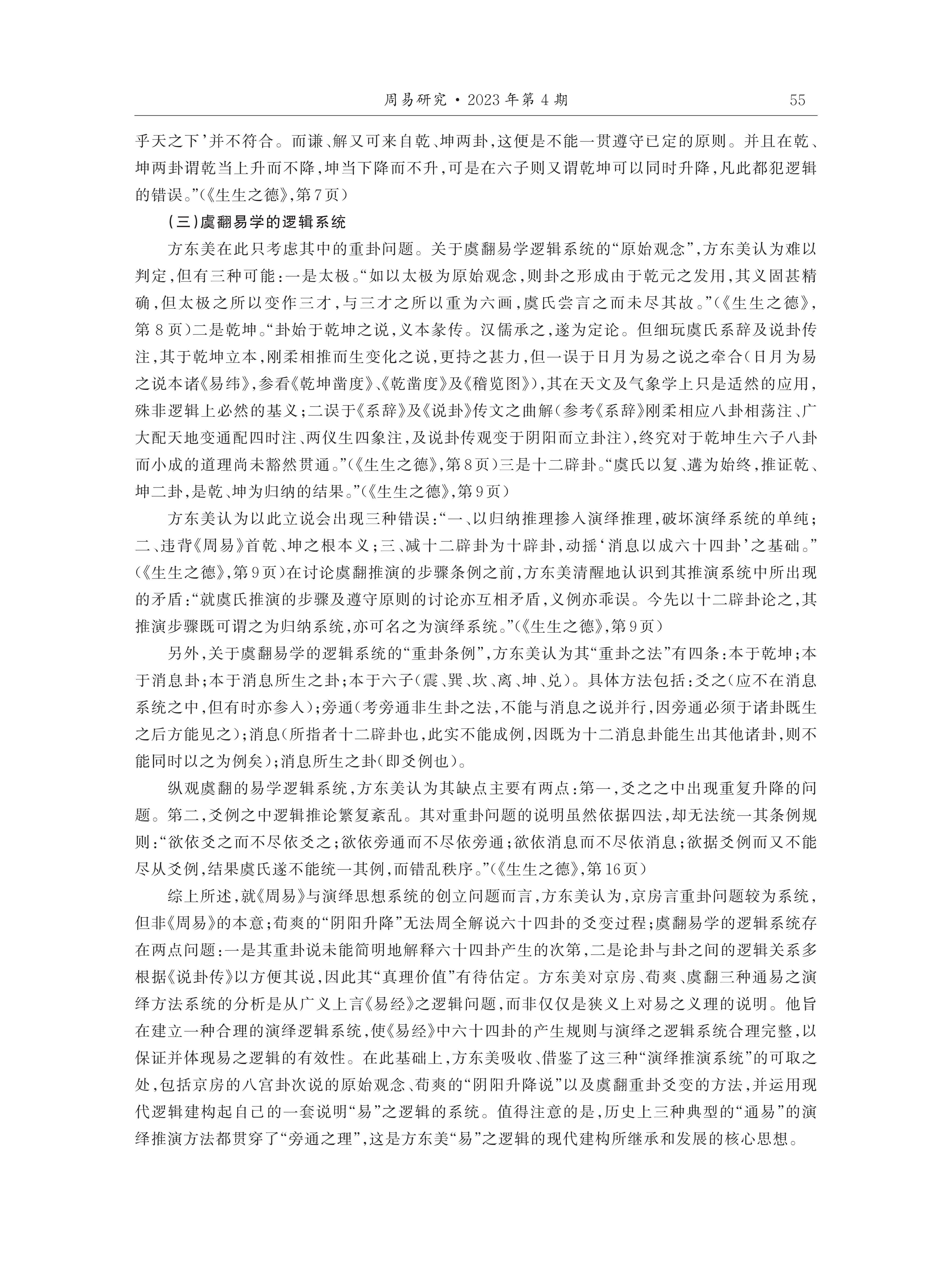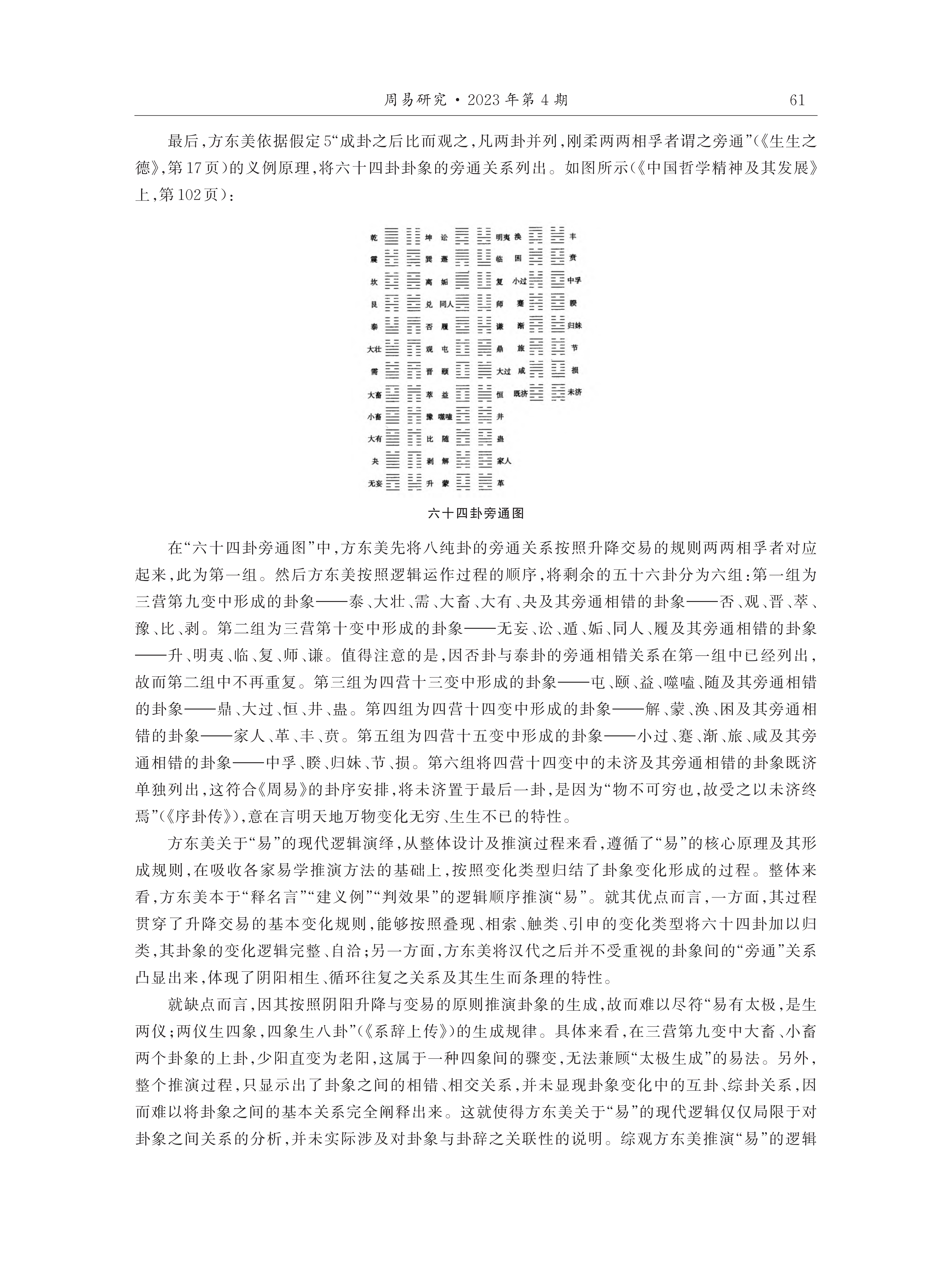 从方东美推演“易”的整体过程来看,一方面,方东美对《易经》形成的历史发展架构格式及其象征符号内部之关系与意义的总结,是其阐释“易”演绎系统及其有效逻辑的前提条件;另一方面,方东美对《周易》演绎思想系统以及京房、荀爽、虞翻等人演绎学说的综合性论析,构成了其“易”之逻辑推演体系的重要理论基础。由此,方东美建构起了以“总旨”与“理路”为主要组成部分的易之“演绎思想系统”。在此基础上,方东美以现代逻辑论证了“易”的演变与变化过程,凸显出“旁通”这一核心逻辑运作原则。