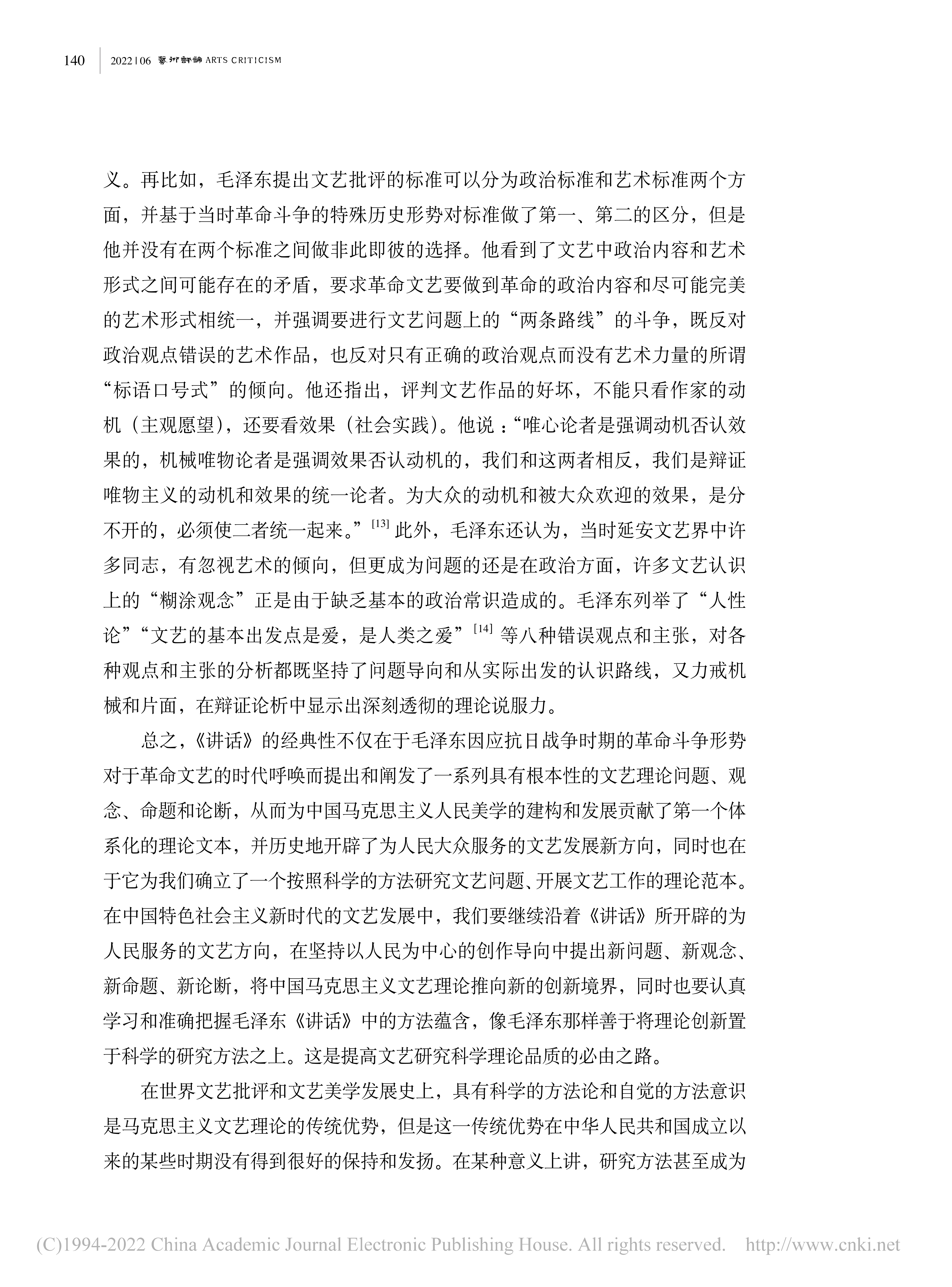 摘要:作为中国马克思主义文艺理论的经典文本,《在延安文艺座谈会上的讲话》的经典性不仅在于毛泽东应抗日战争时期的革命斗争形势对于革命文艺的时代呼唤而提出和阐发了一系列具有根本性的文艺理论问题、观念、命题和论断,从而为中国马克思主义人民美学的建构和发展贡献了第一个体系化的理论文本,并历史地开辟了为人民大众服务的文艺发展新方向,同时也在于它为我们确立起了一个按照科学的方法研究文艺问题、开展文艺工作的理论范本。其方法蕴含主要体现在三个方面:一是坚持从客观实际出发的思想认识路线;二是坚持以问题为中心的理论研究导向;三是坚持以辩证思维的方法分析和阐发问题。了解和学习《在延安文艺座谈会上的讲话》的文艺研究方法,不仅能够使我们对其文本内容知其然更知其所以然,而且有助于当代学术的方法论自觉,以使新时代中国马克思主义文艺理论的话语建构与创新建立在科学方法的基础之上。