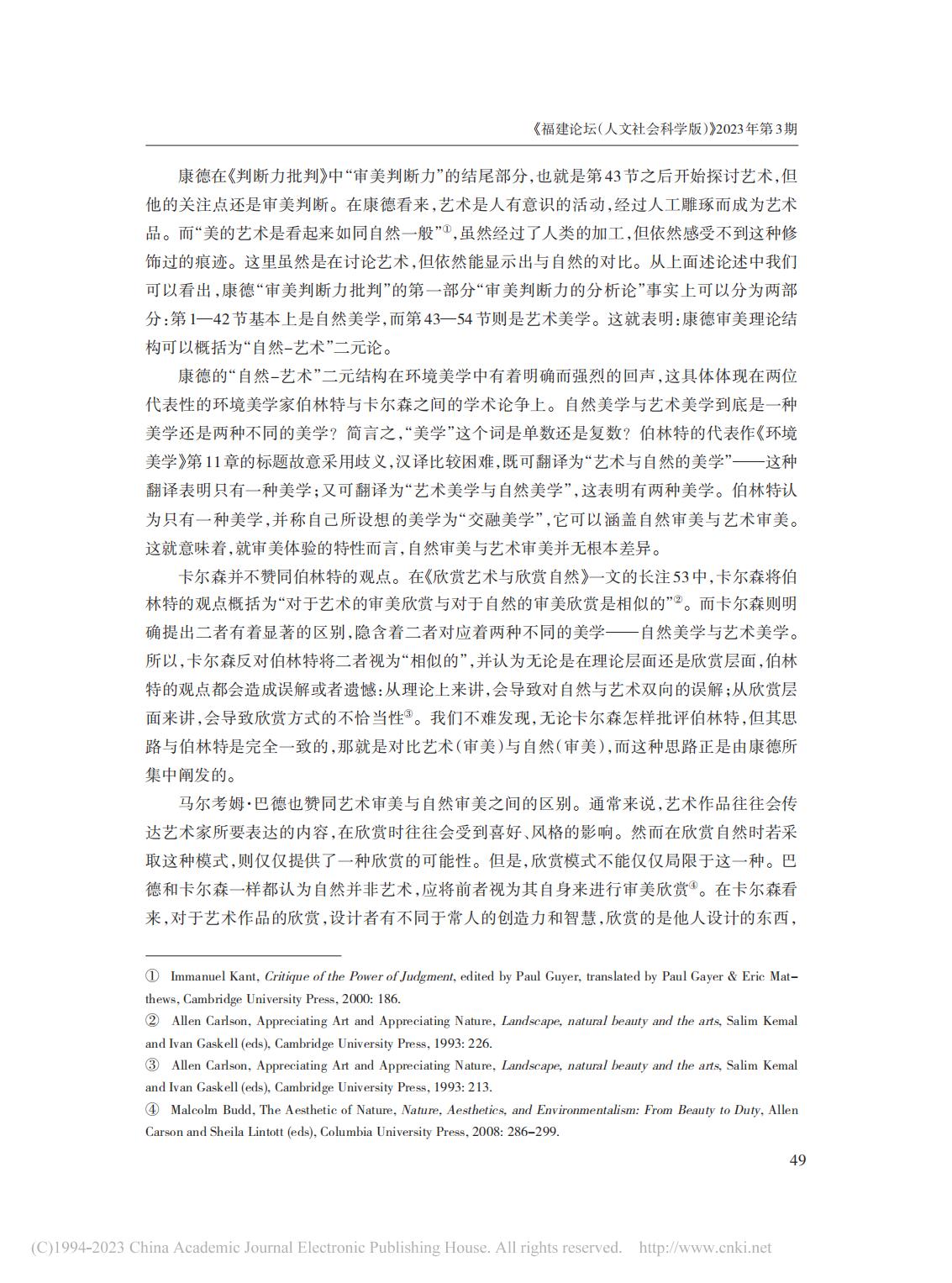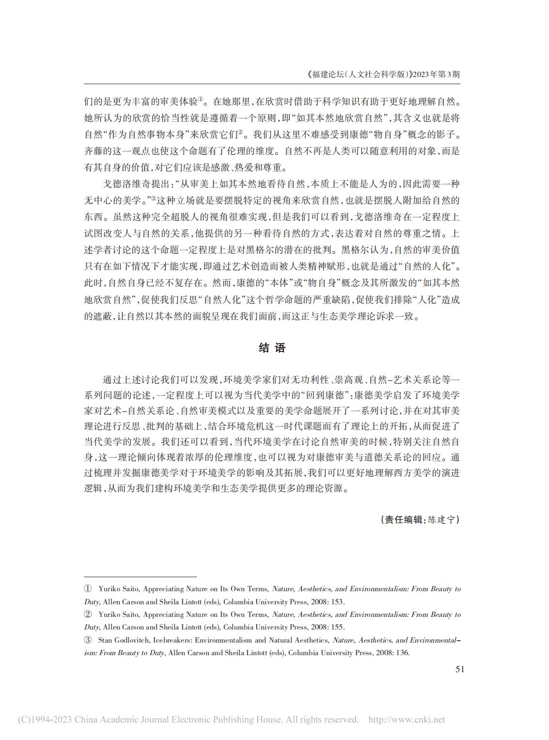 摘要:对环境美学影响较大的美学派别主要是分析美学和现象学美学,此外就是康德美学,其显著的影响主要体现在两个方面:一是康德美学的核心概念“无功利性”激发了伯林特环境美学的“交融模式”,后者正是在批判前者的基础上提出并加以论证的,这很大程度上丰富了环境美学对于审美模式的探讨;二是自然灾害的欣赏是否可能、如何可能是环境美学面临的一个难题,康德的崇高理论成为解决这一难题的重要理论资源。从美学理论的深层思路来说,康德美学对于环境美学还有三个方面潜在的影响:一是康德的自然审美理论(包括自然美与自然崇高)为环境美学构建提供了理论原型;二是康德美学的“自然审美—艺术审美”二元结构为当代环境美学提供了基本思路,启发环境美学家们通过对比自然欣赏与艺术欣赏的异同来展开理论论证;三是康德哲学的“物自身”概念激发环境美学家戈德洛维奇、齐藤百合子等提出了“如其本然地欣赏自然”命题,为环境美学走向以生态伦理为基础的生态美学奠定了坚实的基础。