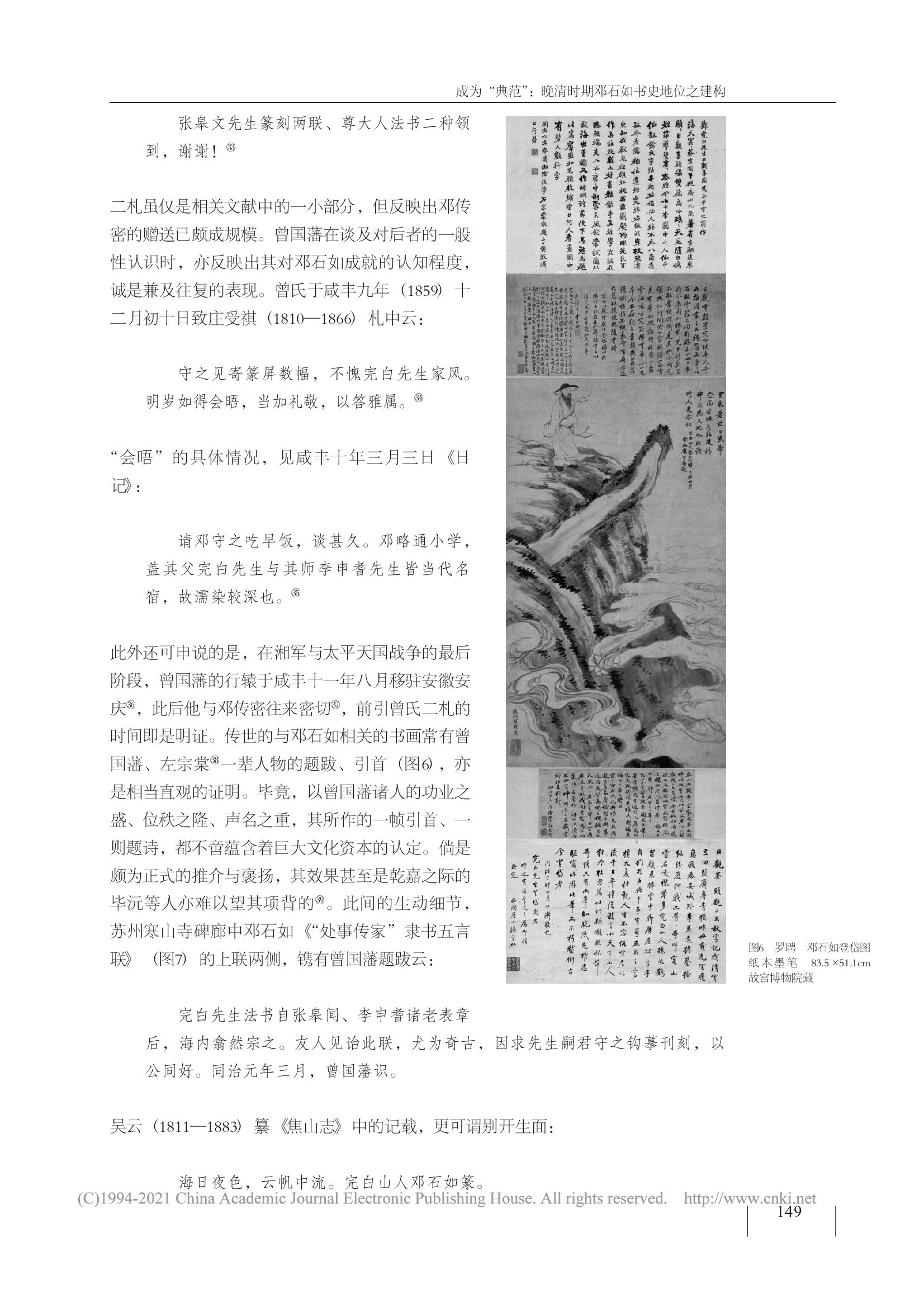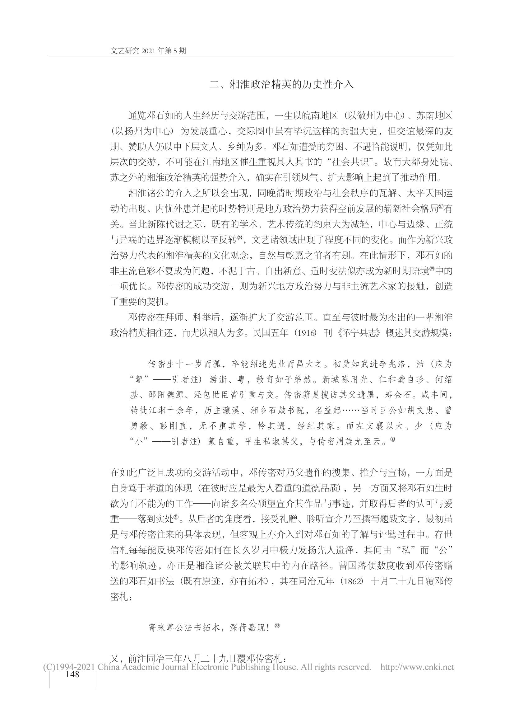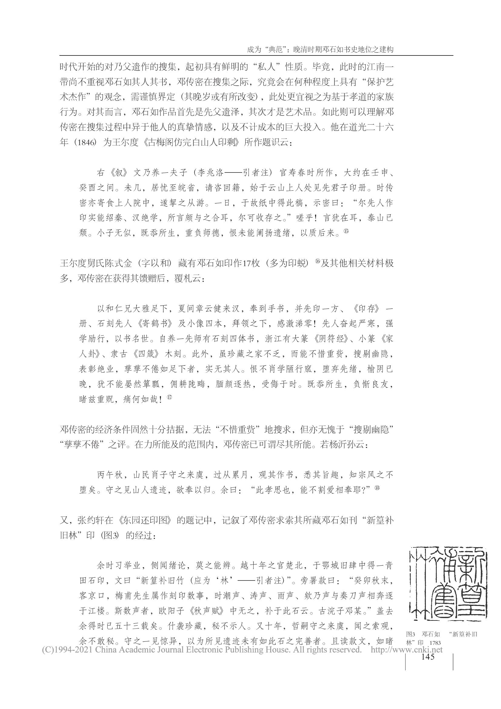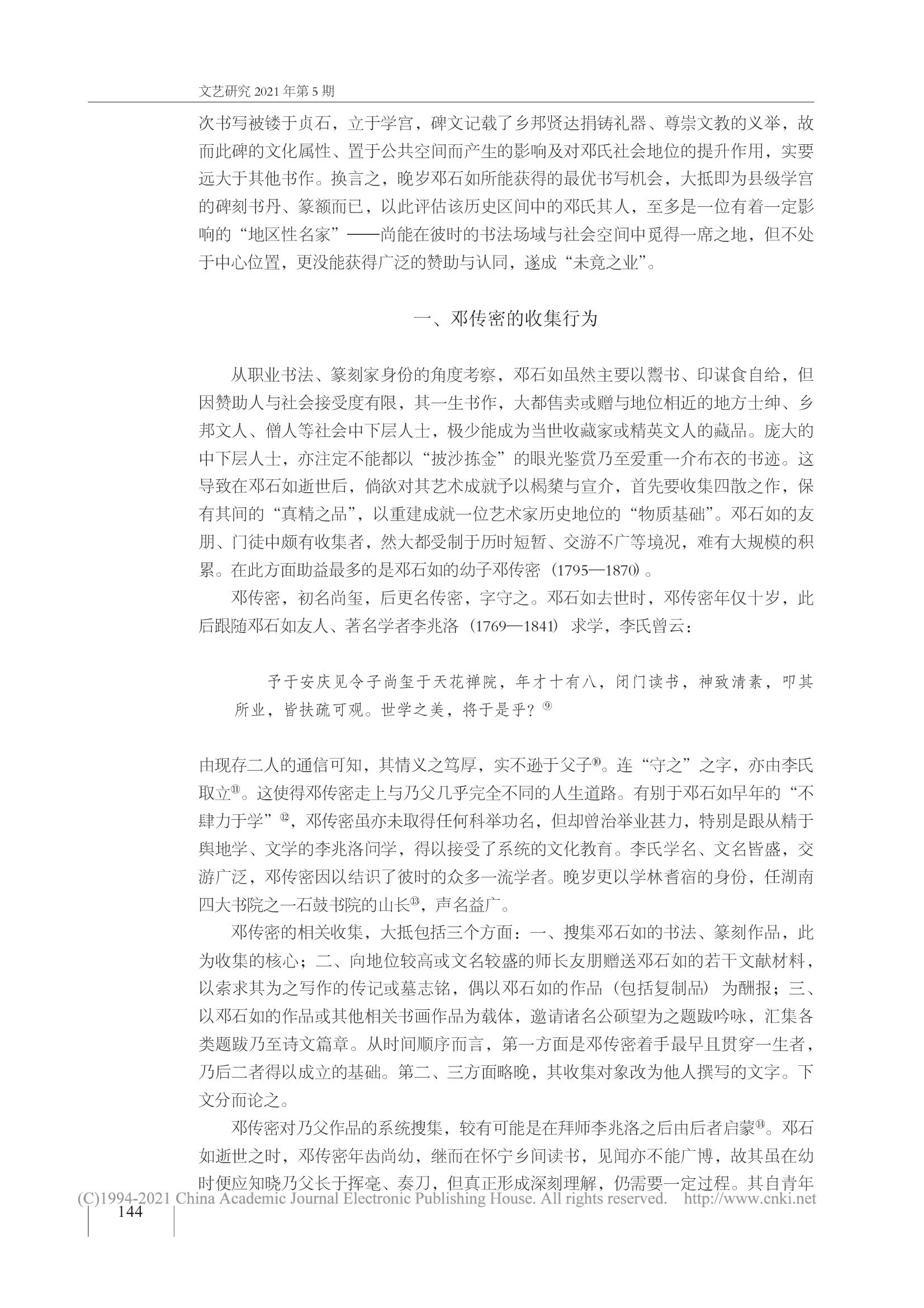 摘要:清中期书法家、篆刻家邓石如生时备极蹉跎、穷困潦倒,但逝世后不足百年便广为世人所重, 以至成为“典范”。这一“生前身后名”的消长起伏,恰呈现出晚清时期艺术史中的重要变化。通过发掘大 量原始文献,结合艺术社会史的研究方式,可以深入揭示邓传密对乃父遗作的收集行为,湘淮政治精英对 邓石如书史地位建构过程的历史性介入,以及由作品价格与复制品传播所反映出的晚清时期的“共识”。这 一历史脉络,既关涉邓石如成为大艺术家的物质基础,亦彰显新兴地方政治势力在引领文化风尚、培育社 会共识方面的作用,堪称邓石如书史地位建构过程中的关键篇章,亦为晚清时期艺术史的重要侧面。