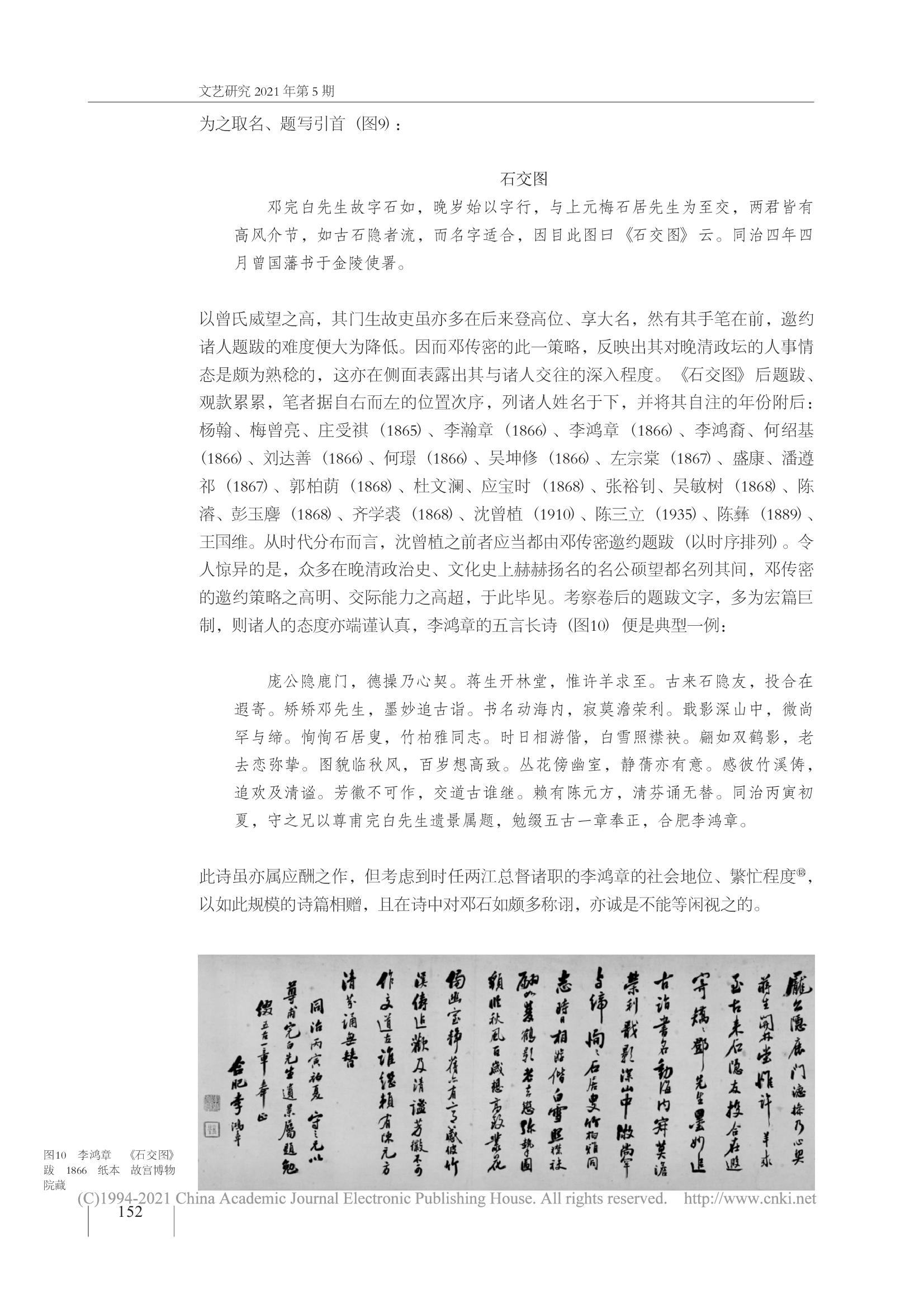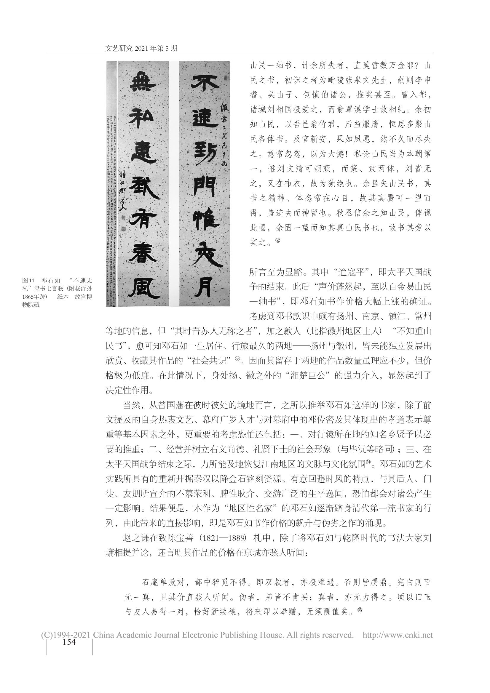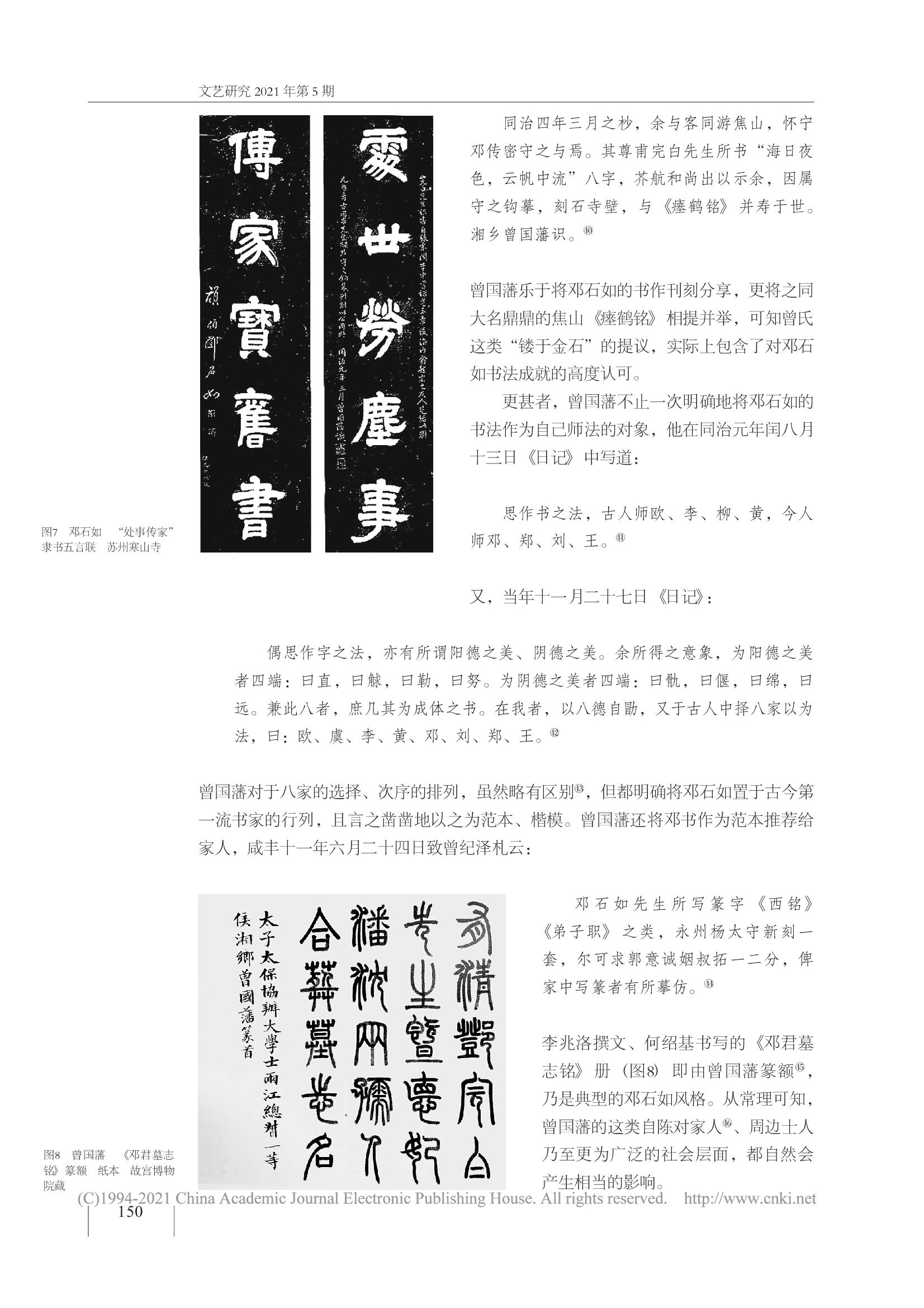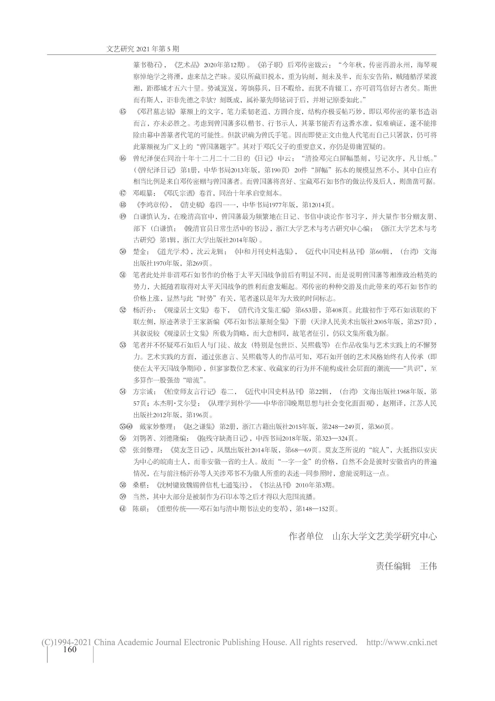 摘要:清中期书法家、篆刻家邓石如生时备极蹉跎、穷困潦倒,但逝世后不足百年便广为世人所重, 以至成为“典范”。这一“生前身后名”的消长起伏,恰呈现出晚清时期艺术史中的重要变化。通过发掘大 量原始文献,结合艺术社会史的研究方式,可以深入揭示邓传密对乃父遗作的收集行为,湘淮政治精英对 邓石如书史地位建构过程的历史性介入,以及由作品价格与复制品传播所反映出的晚清时期的“共识”。这 一历史脉络,既关涉邓石如成为大艺术家的物质基础,亦彰显新兴地方政治势力在引领文化风尚、培育社 会共识方面的作用,堪称邓石如书史地位建构过程中的关键篇章,亦为晚清时期艺术史的重要侧面。