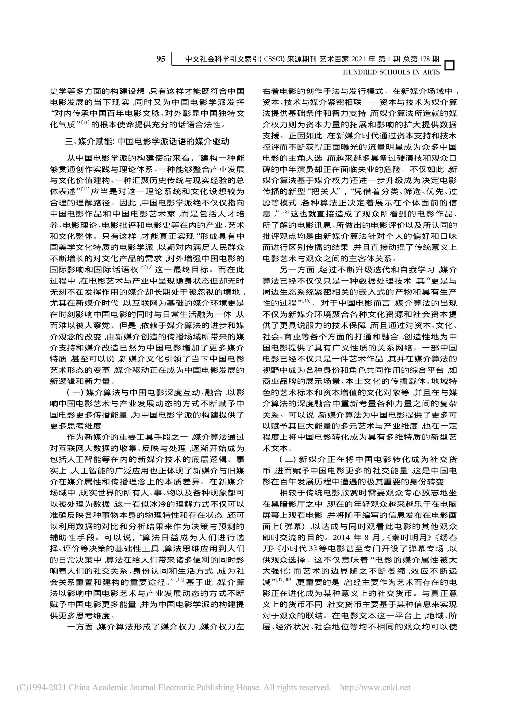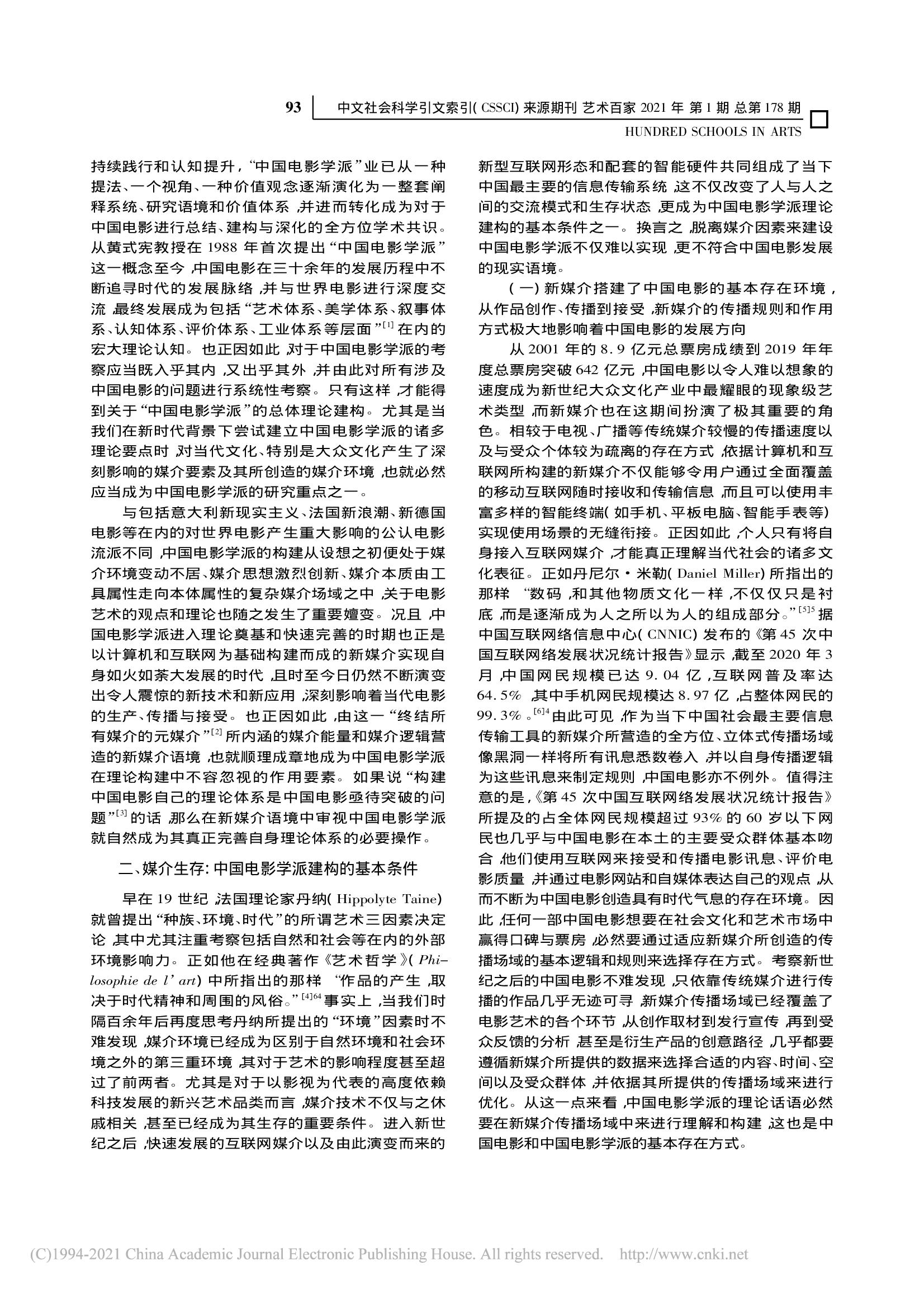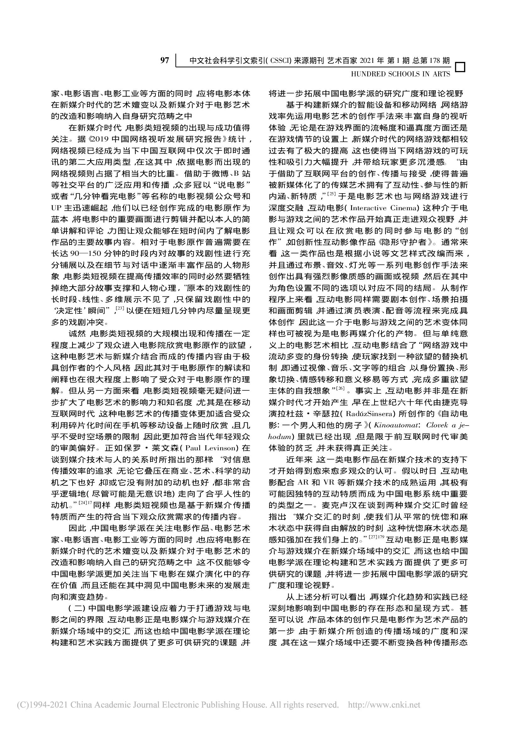 摘要:中国电影学派与包括意大利新现实主义、法国新浪潮、新德国电影等在内的对 世界电影产生过重大影响的公认的各大电影流派不同,其理论构建从设想之初便处于媒介 环境变动不居、媒介思想激烈创新、媒介本质由工具属性走向本体属性的复杂媒介场域之 中,关于电影艺术的观点和理论也随之发生了重要的嬗变。中国电影学派进入理论奠基和 快速完善的时期,也正是以计算机和互联网为基础构建而成的新媒介着实实现了大发展的 时代,时至今日仍然不断演变出令人震惊的新技术和新应用,并在深层次上时刻影响着当代 电影的生产和传播。新媒介不仅成为了中国电影学派构建的基本条件,而且成为了中国电 影学派话语体系发展完善的重要驱动力,并对中国电影学派的理论与创作实践进行了实质 性的媒介拓展。近年来,中国电影学派的源流关系研究、中国电影学派的代表性人物研究、 中国电影学派的创建者的谱系研究、年度中国电影创作分类型研究等方面都已陆续取得了 较为丰硕的成果,但对于中国电影学派和新媒介场域之间关系的研究,却还处于基础阶段。 中国电影学派在自身理论体系的构建过程中,不仅要学会如何与新媒介进行和谐共处,还应 在新媒介传播理念的引导下展现更加包容的胸怀,从而为中国电影在艺术、产业和思想上不 断拓展提供出更有益的理论指导,拿出更合理的解决方案。