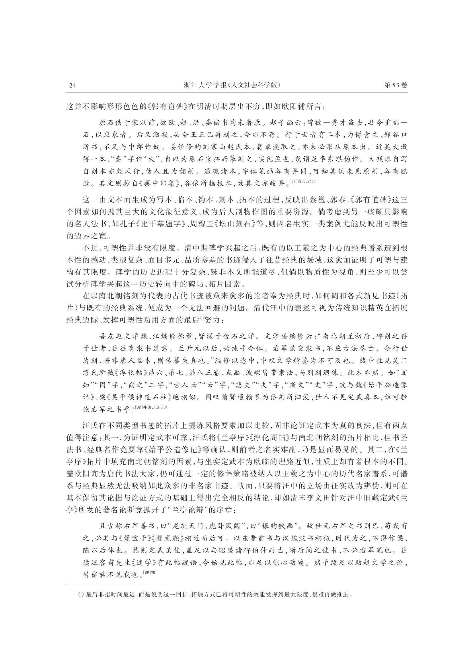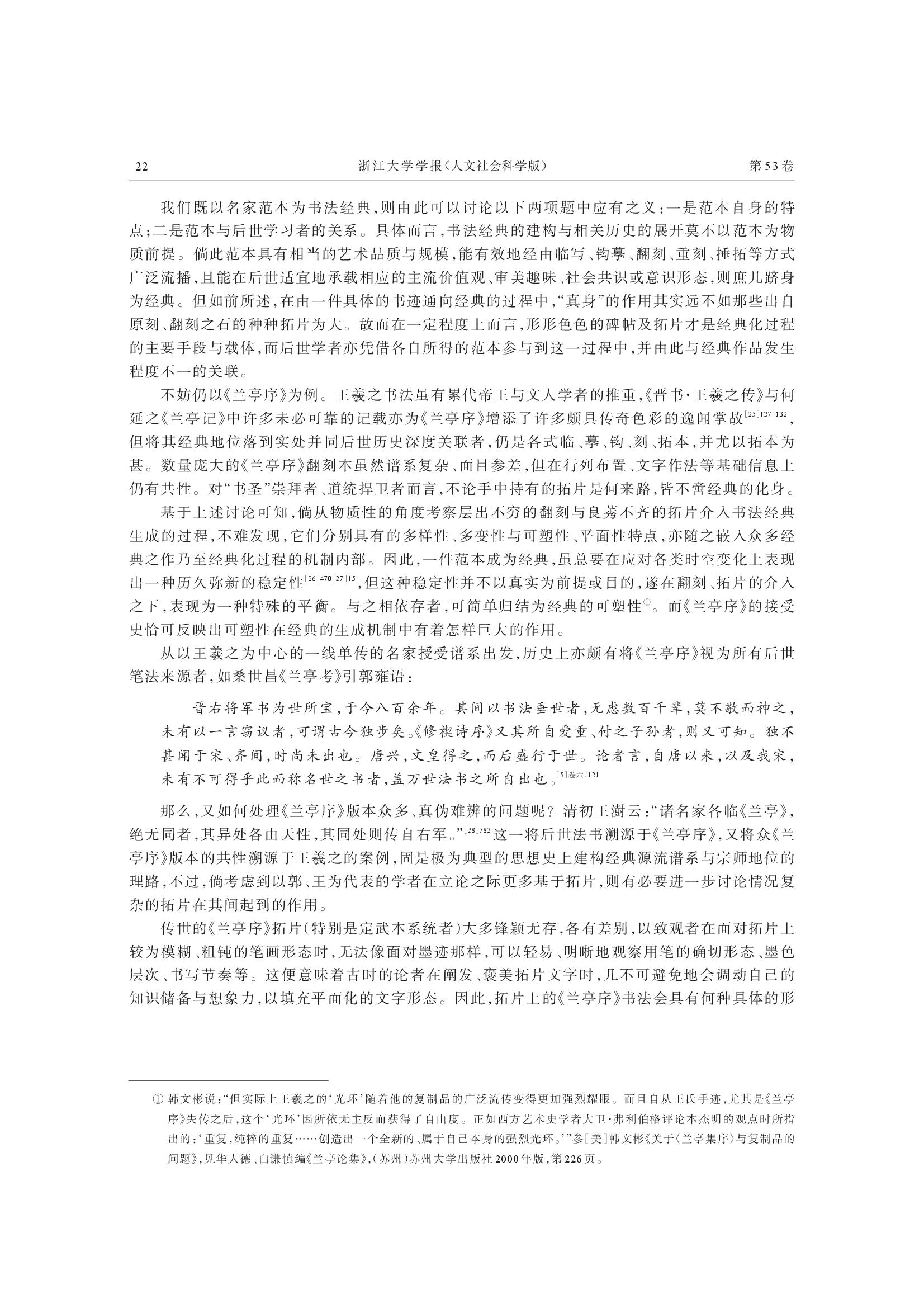 摘要:碑帖及其衍生出的拓片既是古代书法范本的主要物质形态,亦是名家谱系与经典脉络的重要载体。其功能属性、物理特点、制作流程、保存方式与传播途径等皆对书法史研究有着复杂而深刻的影响。真伪混杂的碑帖、良莠不齐的拓片介入历史的发展、经典的塑造,往往不以求实、传真为主要目 的,但亦正因如此,诸物中的若干真实成分在一定程度上保证了历史发展之后回溯原点的可能性,而其 间的混杂、模糊、失实、枝蔓等成分则为后世学者投射立场、填充想象、发挥议论提供了足够丰富的空间。 这恰是《兰亭序》等经典可以由一件具体的书迹不断滋生衍化,最终发展成为一个显著历史传统与文化现象的主要原因。物质性的视角正可为穿透文本与图像的障翳,呈现其间的复杂机制,起到重要的作用。