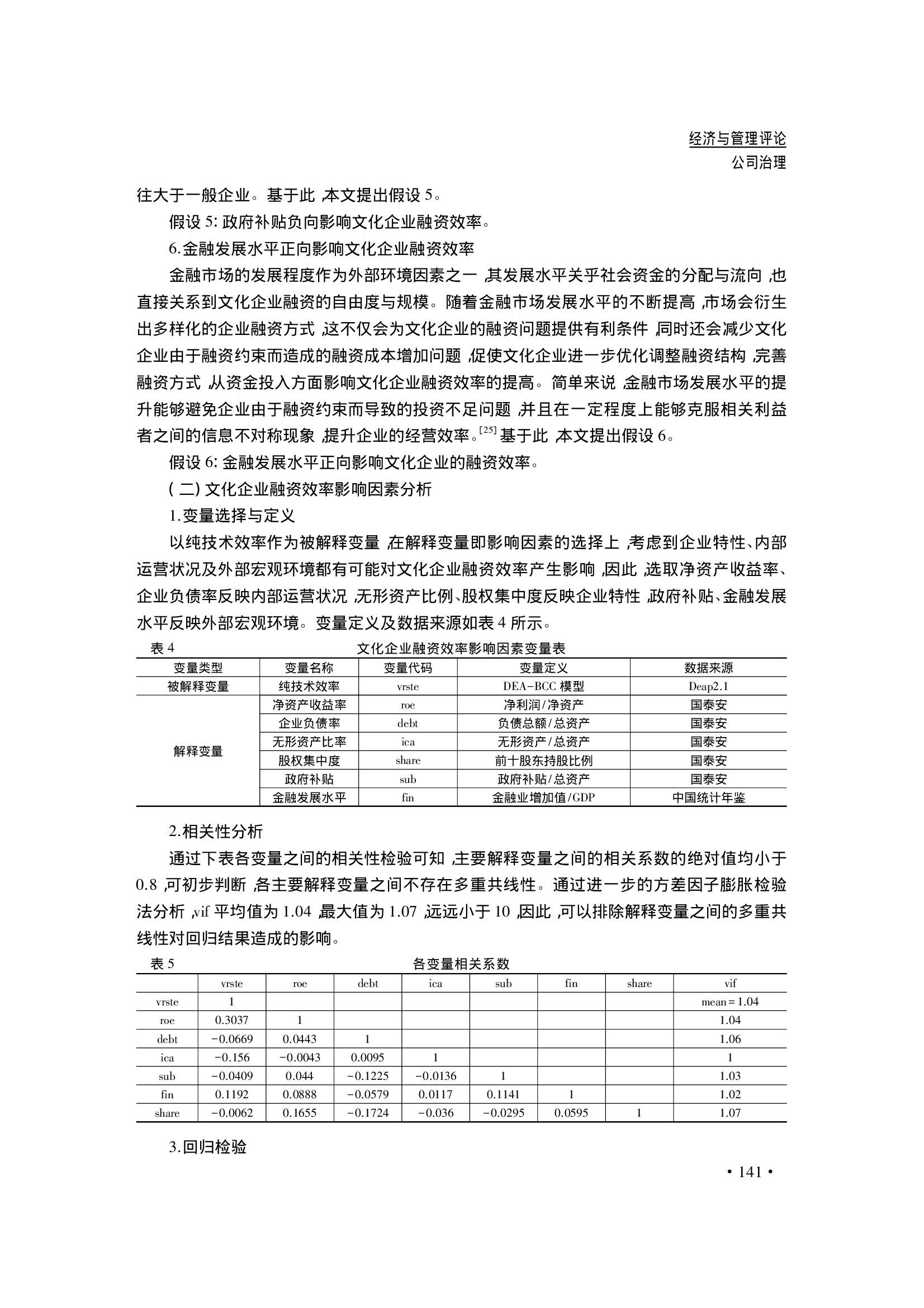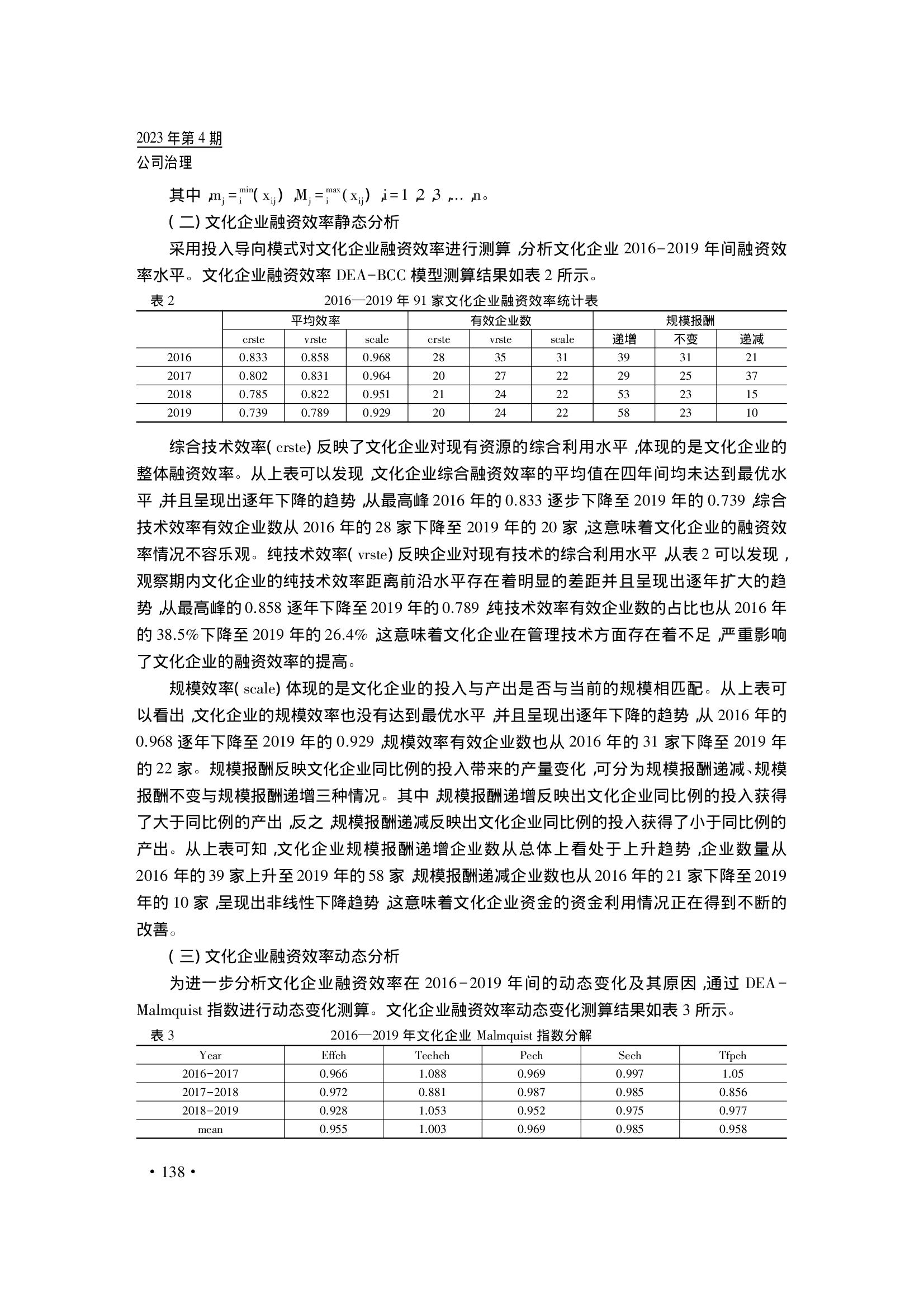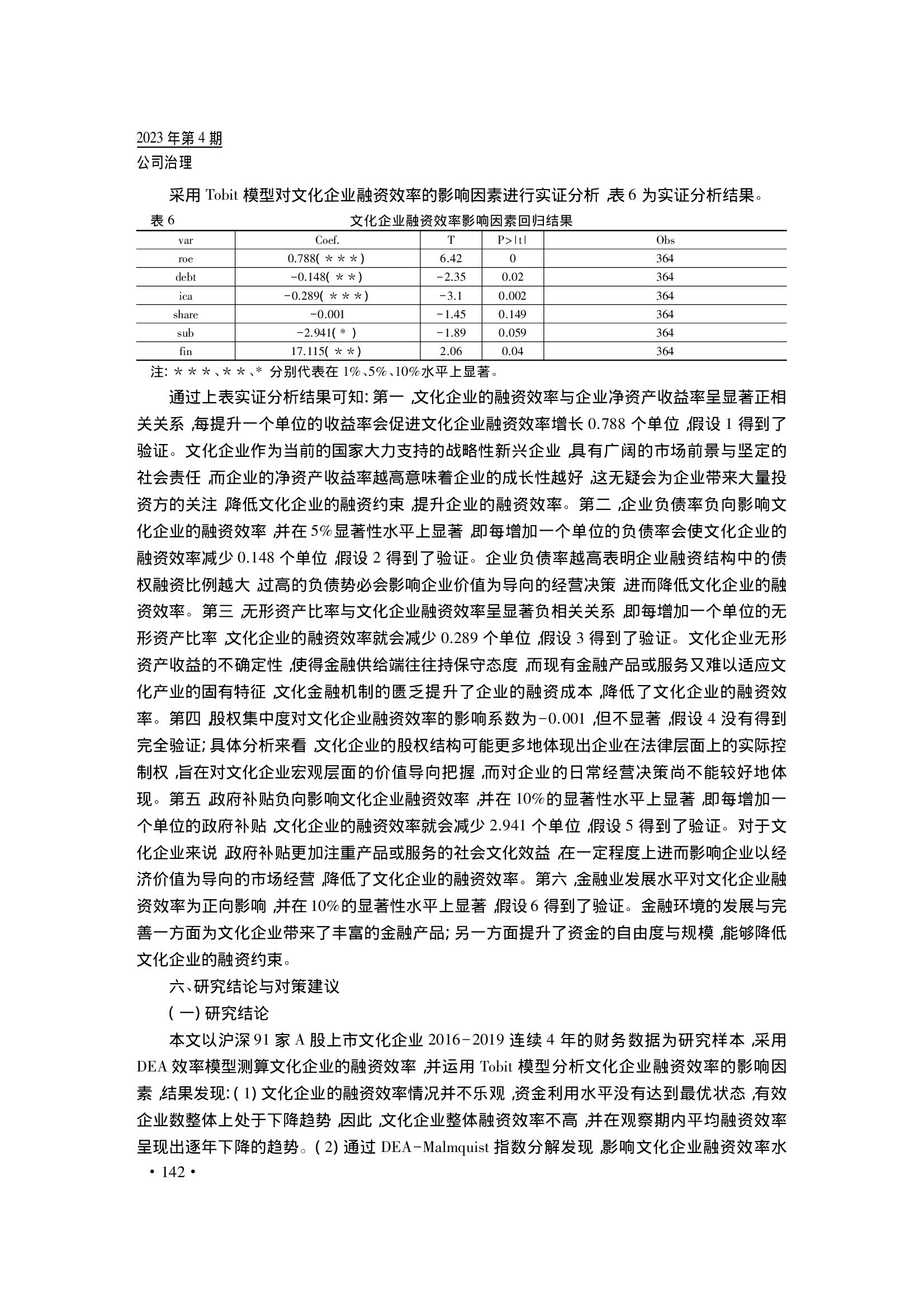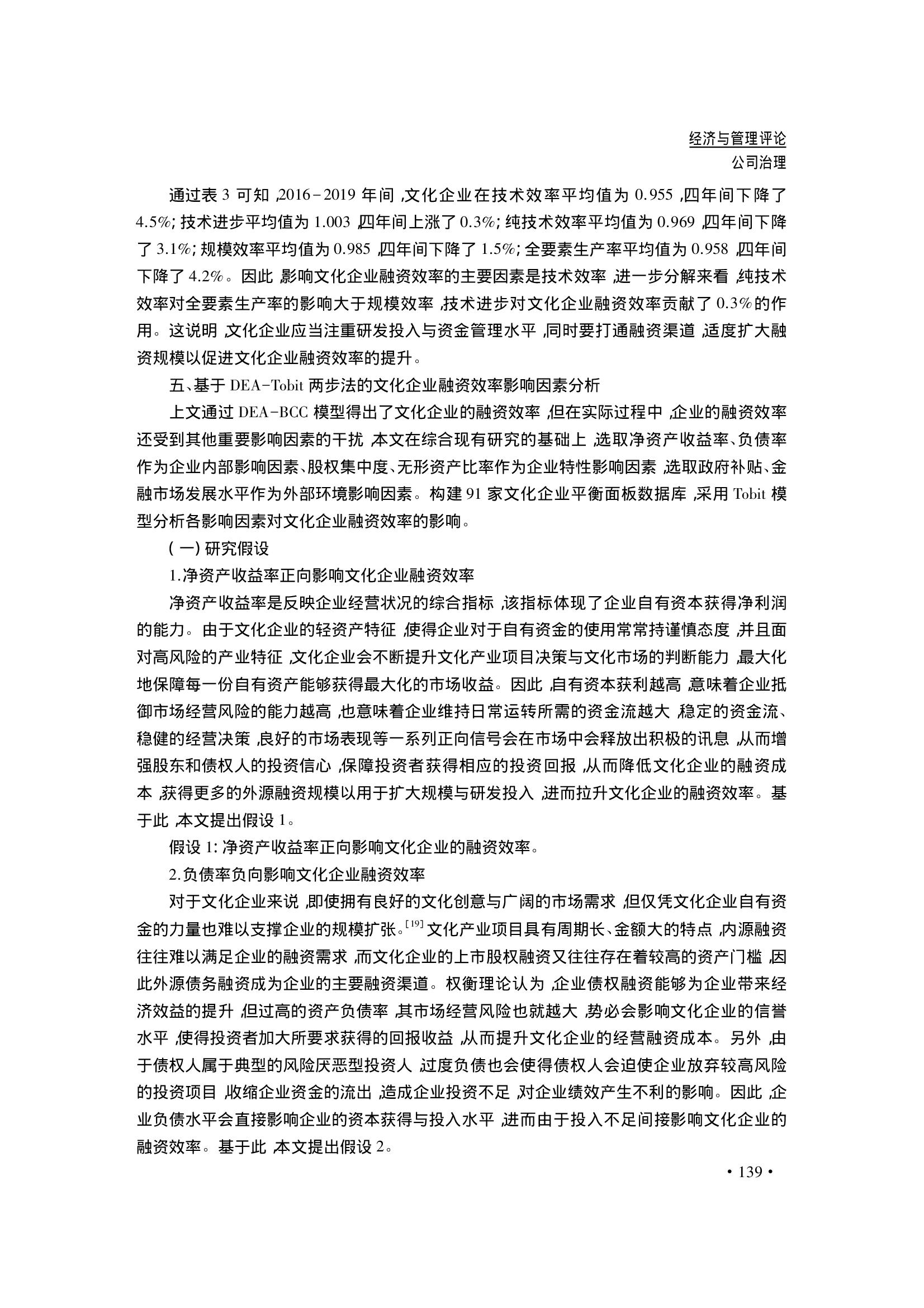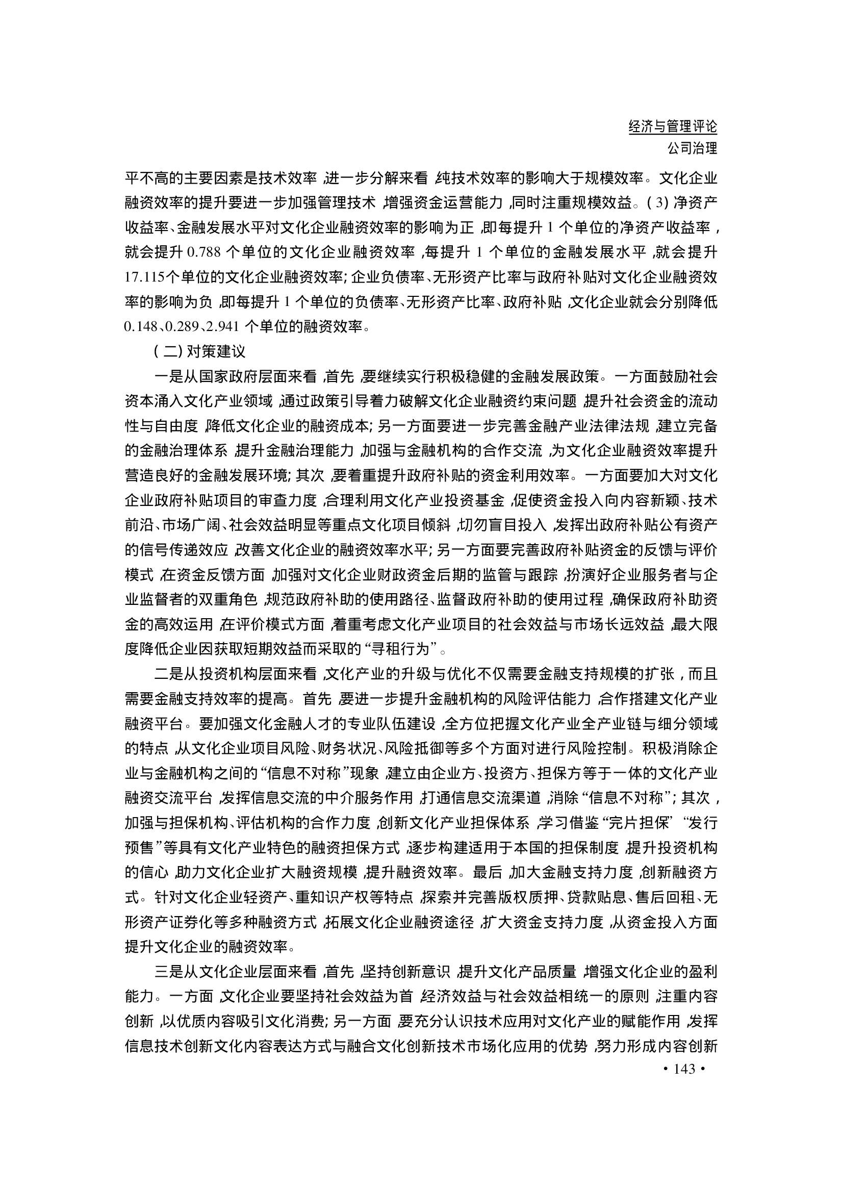 摘要:资本是推动企业发展的重要因素之一,评价文化企业的融资效率,探究文化企业融资效率的影响因素,对于促进文化产业升级具有重要意义。以沪深91家上市文化企业2016-2019年财务数据为研究样本,运用DEA-Tobit两步法分析文化企业的融资效率及其影响因素,结果发现,文化企业的融资效率水平不高,有效企业数占比不高,观察期内融资效率呈现出逐年递减的趋势;企业净资产收益率及宏观金融发展水平能够正向影响文化企业的融资效率;企业负债率、无形资产比率与政府补贴负向影响文化企业的融资效率。