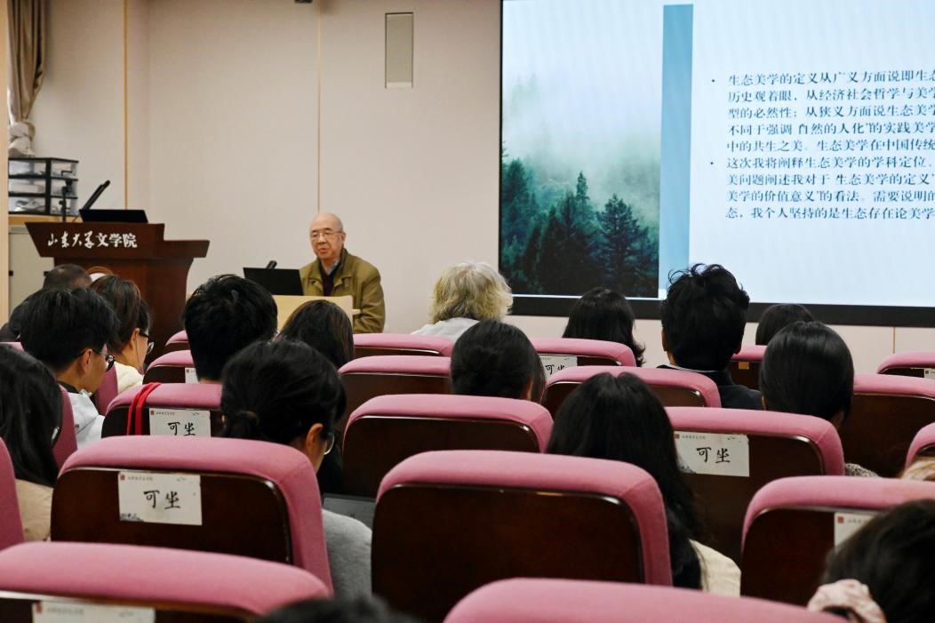 11月17日上午9时,著名美学家,中国当代生态美学的奠基人,山东大学讲席教授,山东大学文艺美学研究中心名誉主任曾繁仁于知新楼A620室为参加“当代美学前沿:东方与西方”国际学术研习营的师生们作学术讲座,题为“生态美学的定义与价值”。讲座由山东大学文学院副院长杨建刚教授主持,韩国岭南大学美学系闵周植教授、韩国庆北大学艺术学院朴然婌教授、德国卡塞尔大学艺术史与美学系王卓斐教授、山东大学文艺美学研究中心韩清玉教授出席,吸引了上百名师生前来聆听。