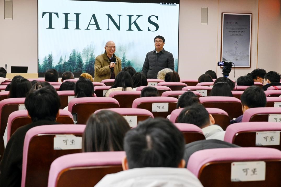 杨建刚教授代表师生对曾繁仁教授的精彩演讲致以诚挚感谢。他在总结中指出,曾繁仁教授的学术道路,既是一条中西融汇的美学探索之路,也是一位人文学者以学术回应现实、以思想关怀生态的生动写照。杨教授进一步强调,生态美学理论建构不仅响应了国家推动中国自主学术体系建设的号召,更致力于以本土化的学术话语与国际学界展开对话,彰显了中国美学研究的文化自觉与理论创新。