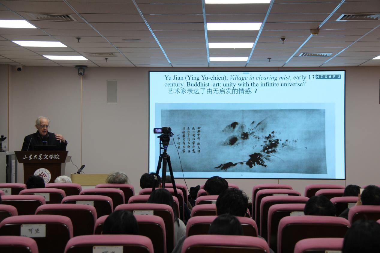 11月18日晚上7:00,美国著名艺术史论学家、湖北大学访问学者、武汉纺织大学特聘教授大卫・布鲁贝克(David Brubaker)以 “Chinese Art and Aesthetics: the Difference of Empty Space in Art History”(《中国美学与艺术史中的留白差异》)为题,为国际学术研习营带来了一场精彩的学术讲座。本次讲座由山东大学文艺美学研究中心、文学院主办,周逸群老师担任主持人,来自国内数十所高校的硕博士研究生现场聆听。