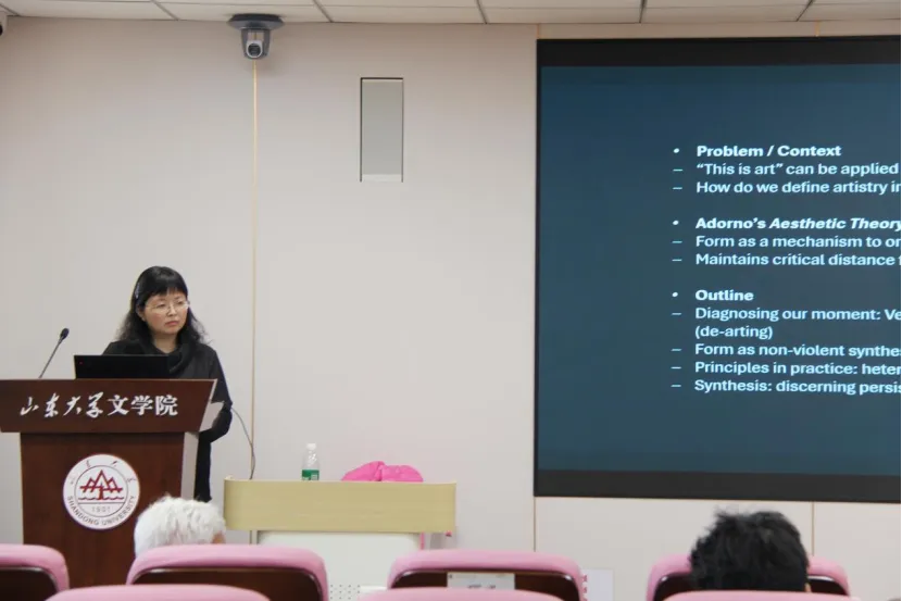 11月20日上午,山东大学国际前沿学术讲座第8期在中心校区知新楼A620会议室举行,德国卡塞尔大学美学与普通艺术科学系副教授王卓斐作“反对‘一切皆艺’:阿多诺形式概念作为当代艺术的批判工具”主题学术讲座。