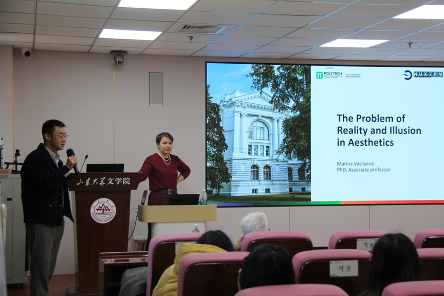 2025年11月20日下午,“当代美学前沿:东方与西方”国际学术研习营迎来第十一场重磅讲座。俄罗斯圣彼得堡彼得大帝理工大学社会科学研究院玛丽娜·瓦西里耶娃教授在知新楼A620教室,以“现实与幻象:美学范畴的再审视”为题展开学术分享。讲座由文艺美学研究中心曹成竹副教授主持,巴西米纳斯吉拉斯联邦大学哲学系教授罗德里戈·杜阿特、美国著名艺术史论学家、湖北大学访问学者、武汉纺织大学特聘教授大卫·布鲁贝克、德国卡塞尔大学艺术史与美学系王卓斐教授、北京大学艺术学院白龙教授、文艺美学研究中心杨建刚教授共同与会,现场吸引了来自全国多所高校的硕博研究生参与。