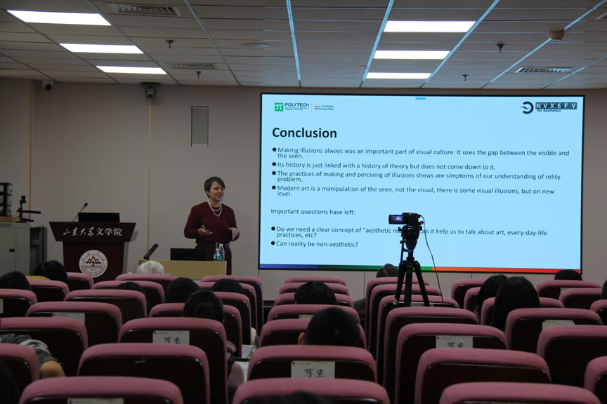 瓦西里耶娃教授从美学学科中“现实”概念尚未得到充分发展的现状切入,系统阐释了这一范畴在本体论和认识论中的首要重要性及其在美学核心议题中的缺失。她援引阿尔捷姆·叶夫根尼耶维奇·拉迪耶夫的“三岛”理论,将美学理论的构建生动比喻为“客体之岛”、“主体之岛”以及关注氛围、环境和日常性概念的“第三岛”,并指出当前正是“第三岛”在日常生活美学、设计研究等领域蓬勃发展。通过对视觉实践在文化中深远意义的剖析,她从希腊罗马时期的光学错觉、庞贝壁画的模仿原则,到中世纪的逆透视和变形比例,再到文艺复兴时期的错视画法,系统梳理了幻觉艺术的历史脉络。讲座还深入探讨了20世纪反射理论的发展、本雅明的“光环”概念、丹托的“艺术界”理论,直至21世纪人工智能生成内容作为最新幻象形态的哲学意涵。
